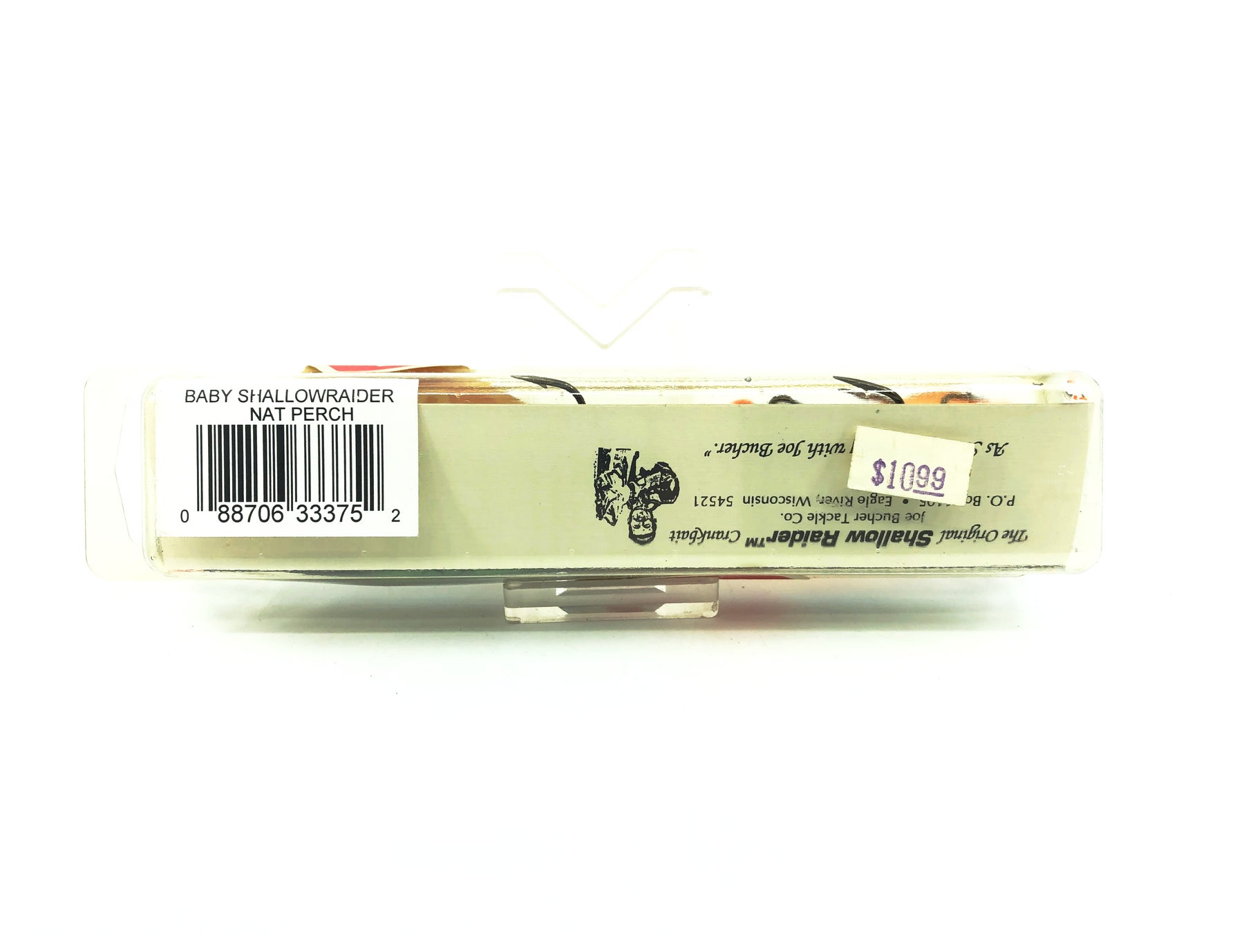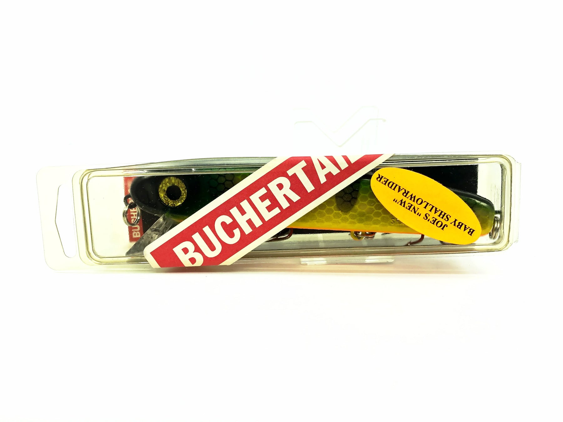 Joe Bucher Tackle Co. Buchertail Baby Shallow Raider, Natural Perch Color on Card. Vintage version and packaging with this classic Wisconsin lure. Lure body is about 5 1/2" long. Lure is new on card and the card is in overall great condition, see photos.