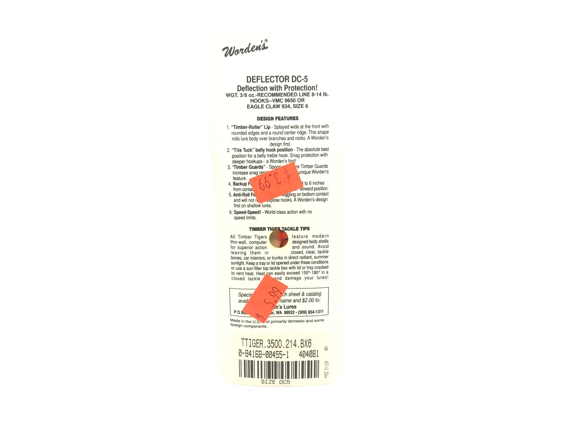 Timber Tiger Deflector DC-5, #214 Worden's Firetiger Color on Card. Discontinued old stock here. SKU for this lure is 3500-214. Great lure here about 2 3/8" long. Lure is new on card and the card is in good condition.