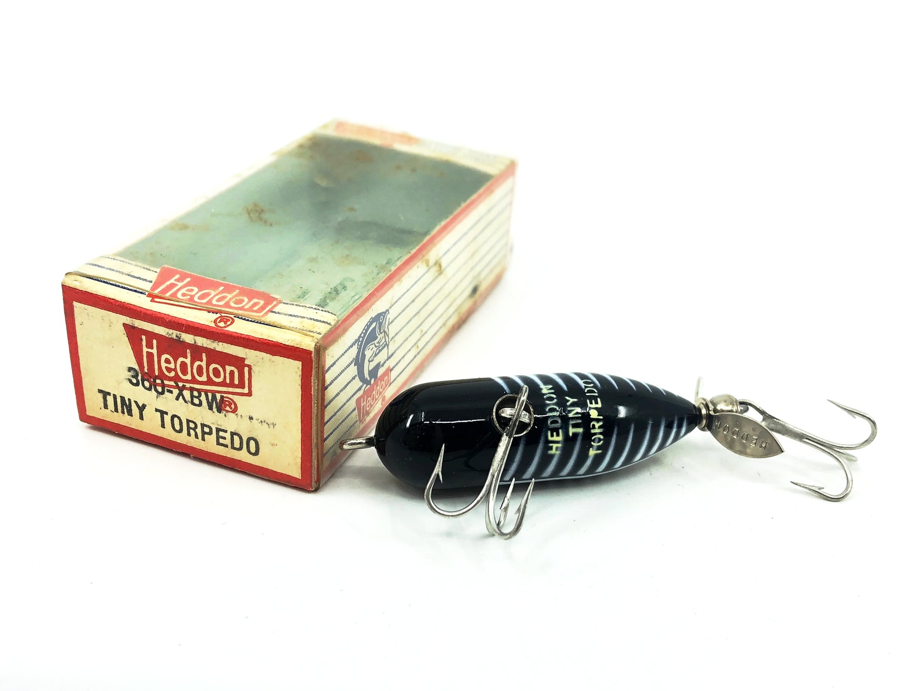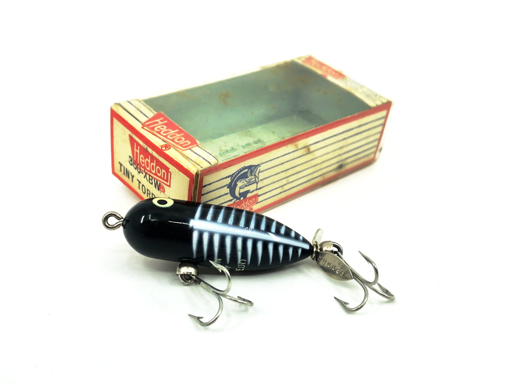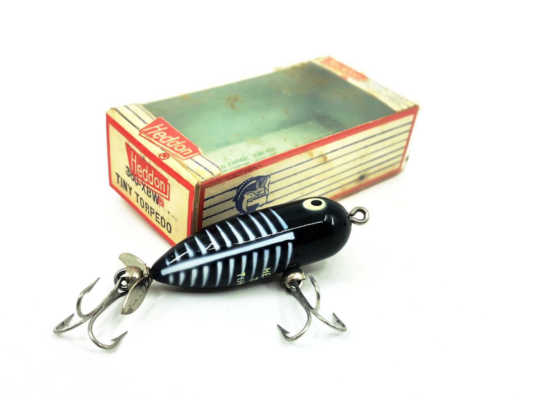 Heddon Tiny Torpedo, XBW Black Shore Color, with Box. Lure is about 2" long. Used vintage lure with some minor wear but overall in good condition. The box is in good condition. Iconic top water bait to fish or collect. See photos.