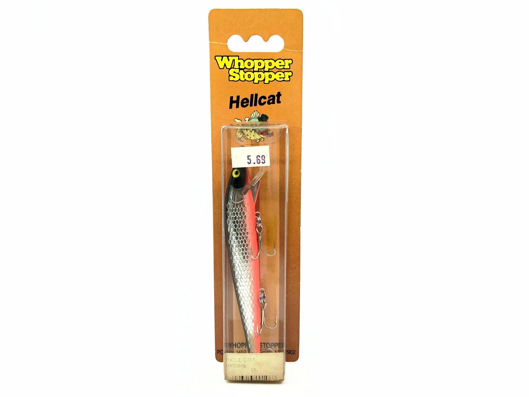 Whopper Stopper Hellcat, Black Back/Silver/Orange Belly Color on Card. About 4 1/2" long. Lure is new in packaging and the card is in good condition. Fish or collect. See photos.