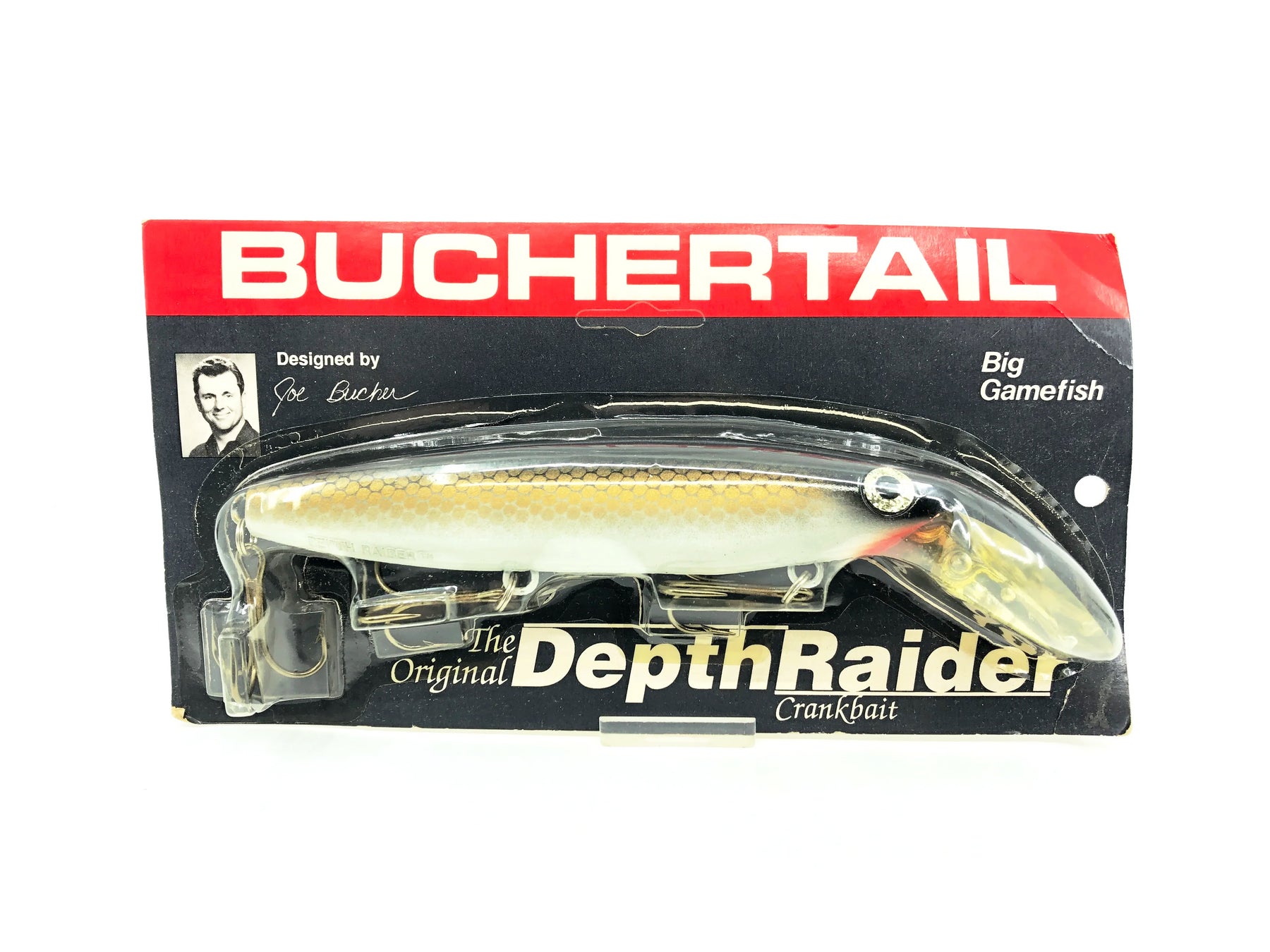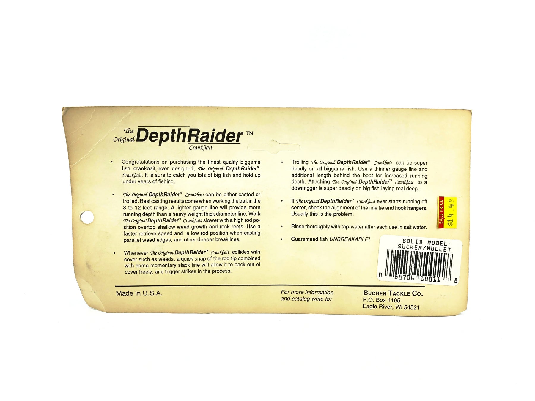Joe Bucher Tackle Co. Buchertail Depth Raider 8", Sucker/Mullet Color New on Card. Cool card with this classic vintage Musky bait. About 8" long including lip, 6 5/8" body. Lure is new on card and the card is in overall good condition, however the bubble is slightly loose. See photos.