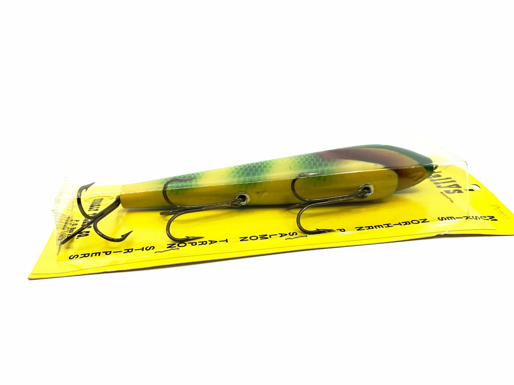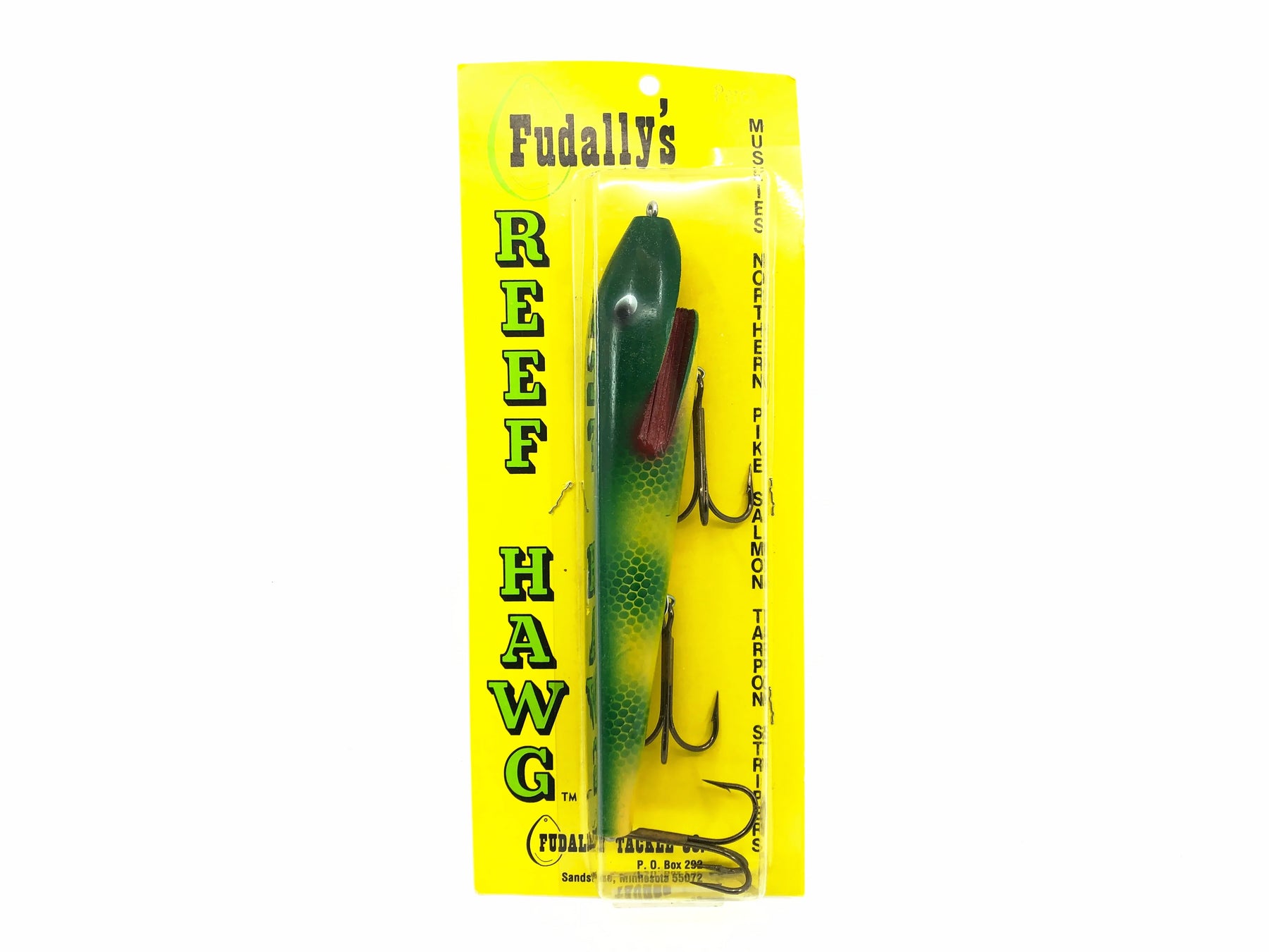 Fudally's Reef Hawg, Perch Color on Card. Quality wooden musky bait! Lure is about 7 3/4" long. This lure is new on card and the card is in good condition. See photos.