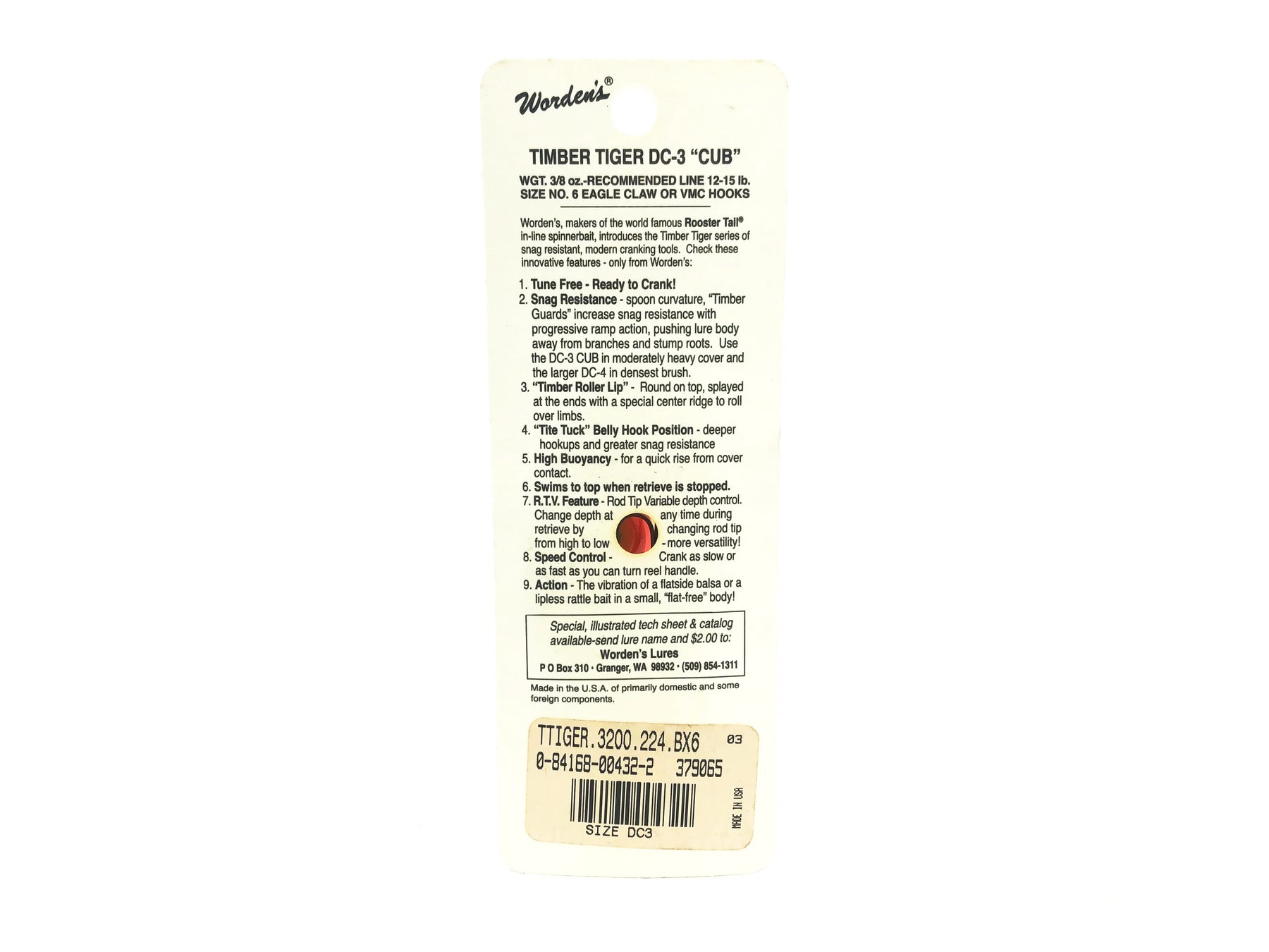 Timber Tiger Cub DC-3, #224 Worden's Pumpkinseed Color on Card. Discontinued old stock here. SKU for this lure is 3200-224. Body is about 2 1/8" long. Lure is new on card and the card is in good condition.
