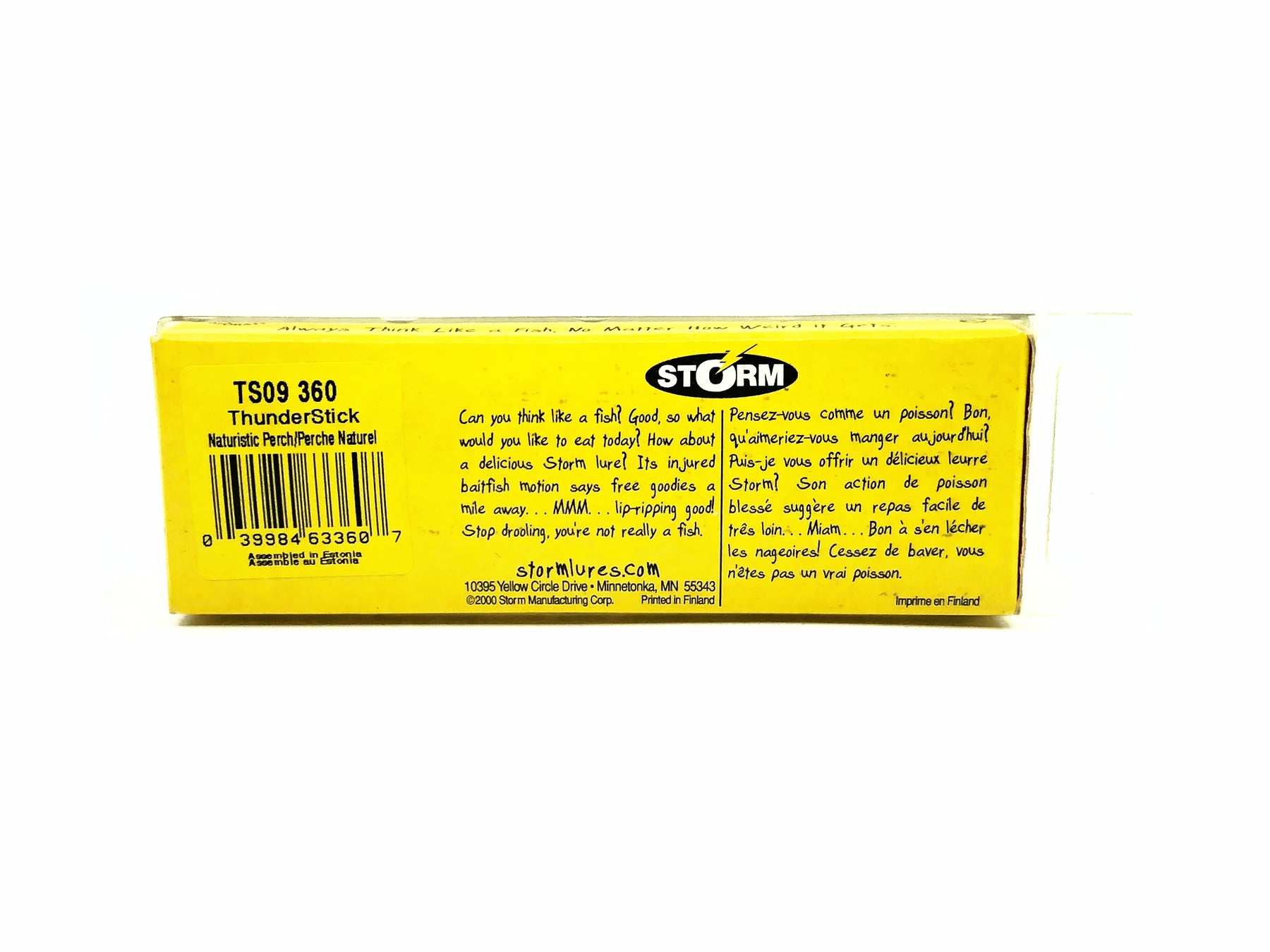 Storm Thunderstick, TS09-360 Naturistic Perch Color w/Box. Great lure here in a desirable Rapala Storm color. Lure is about 3 1/2" long. Lure is new in box and the box is in overall good condition. See photos.