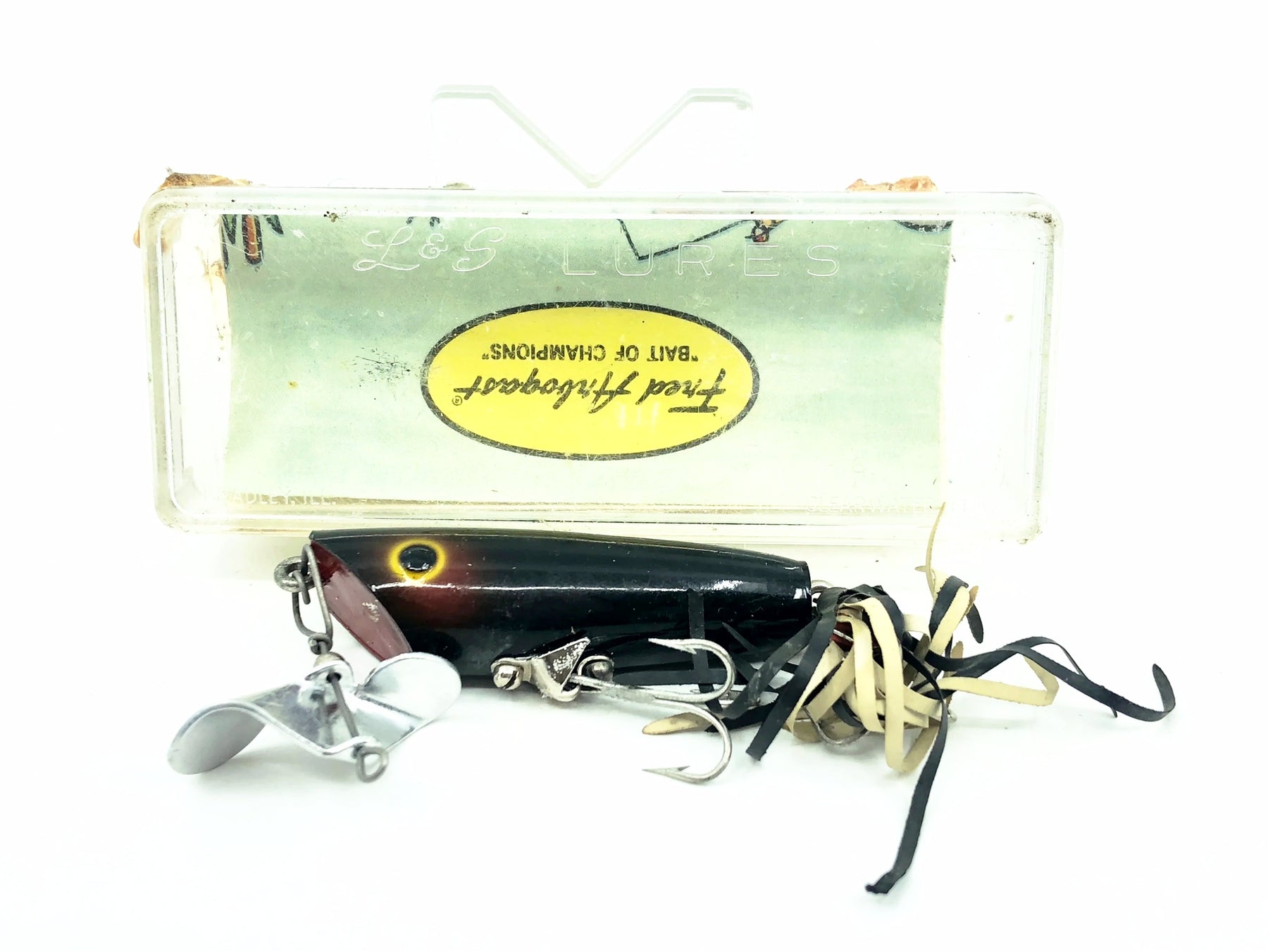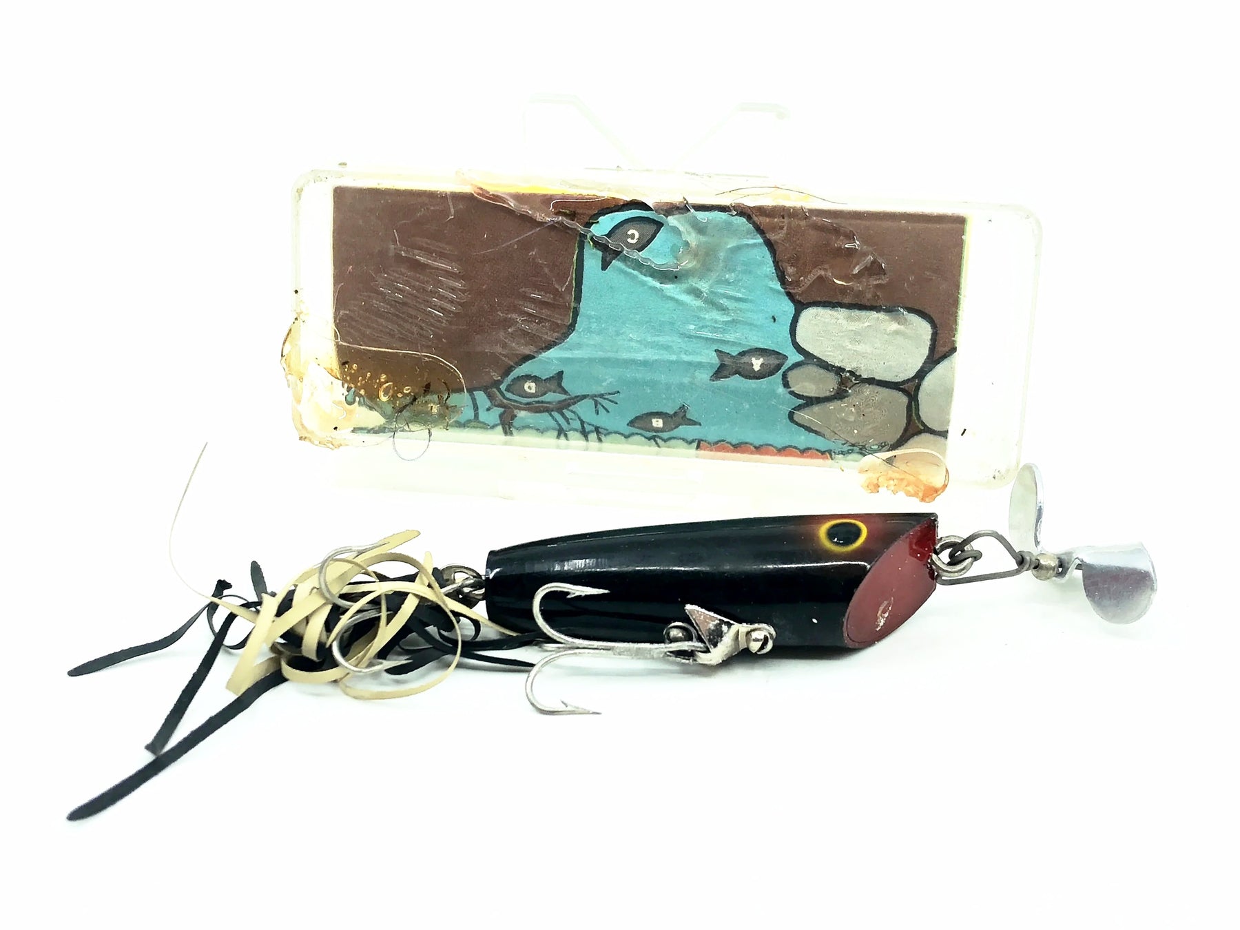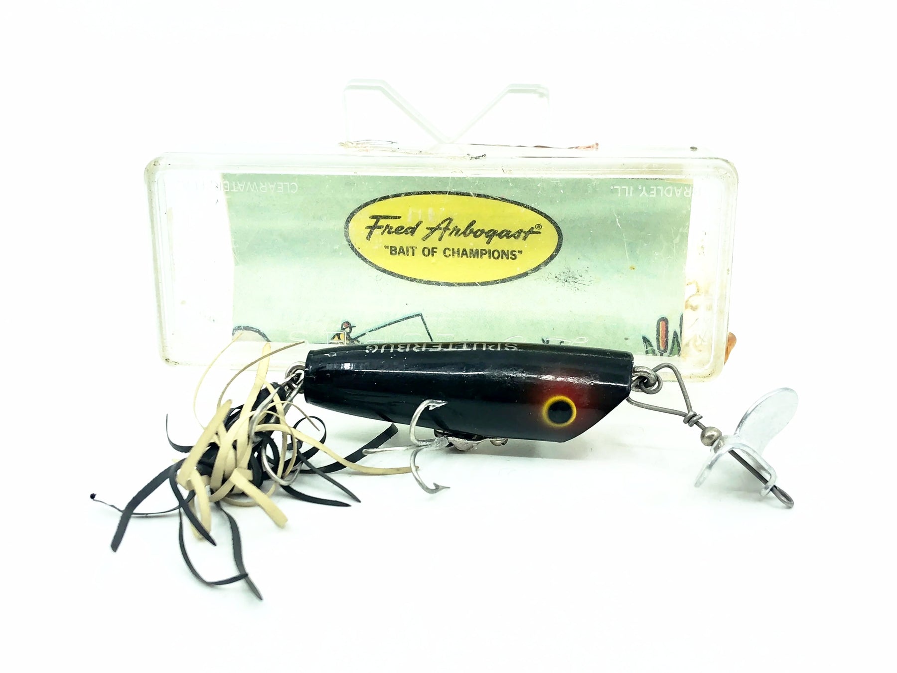 Arbogast Sputterbug, #02 Black Color w/Box. Box is for an L & S lure however it holds the paperwork and lure well. Great discontinued Arbogast bait here. Body of lure about 2 1/4" long. This bait is used with some minor wear but in overall good condition. Box has some damage and melted plastic on it. Collect or fish this one.