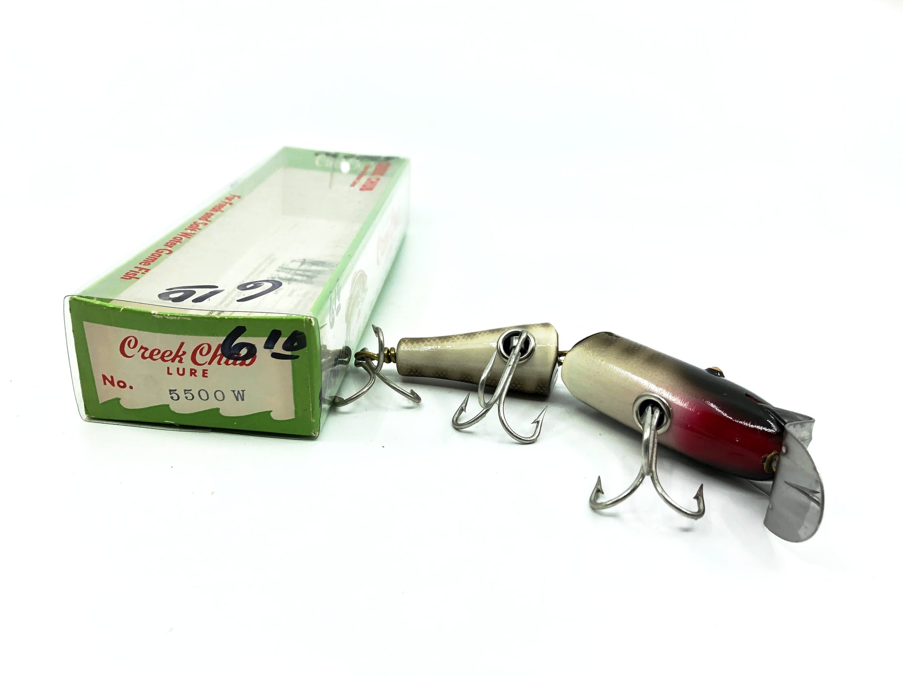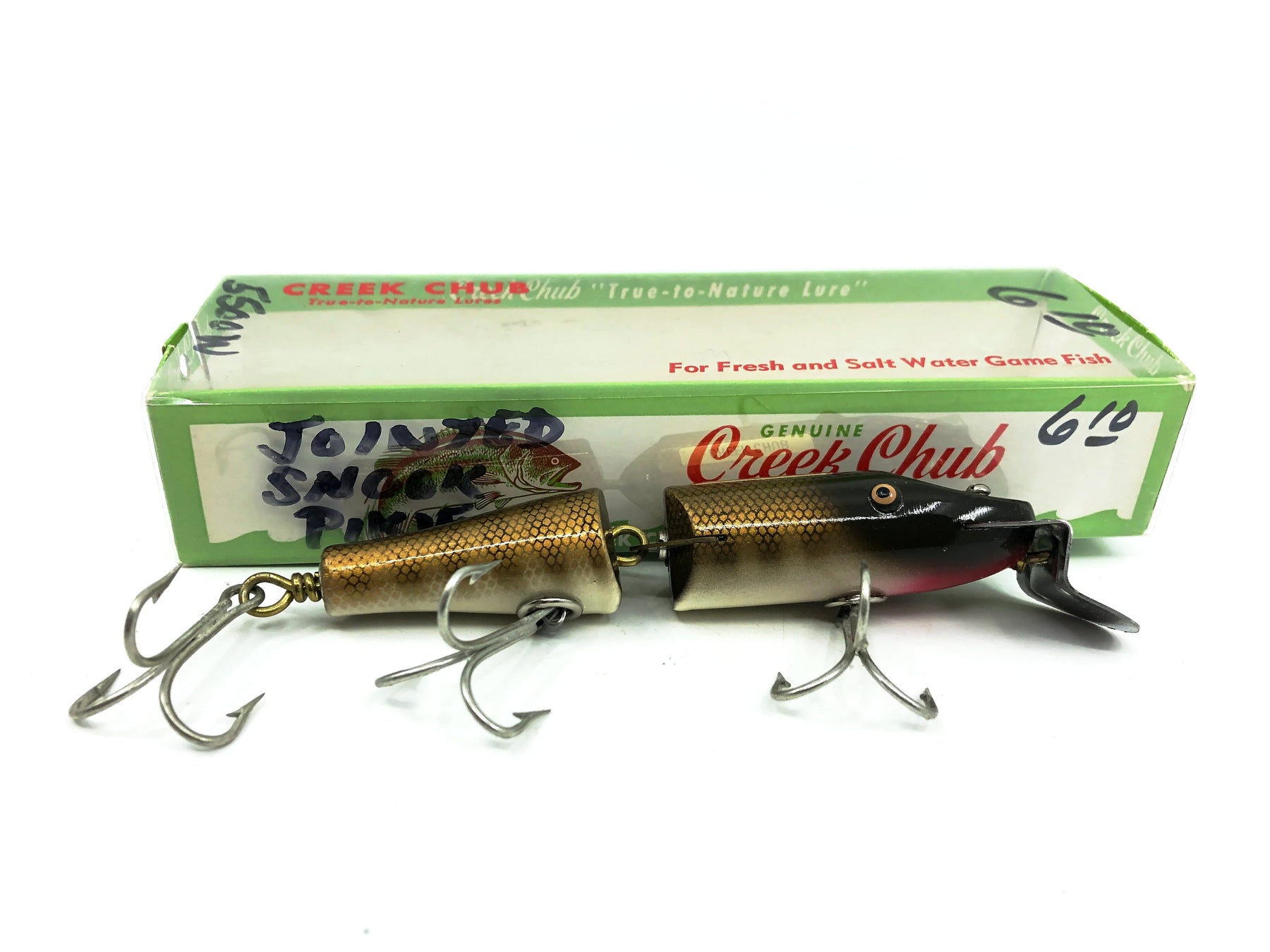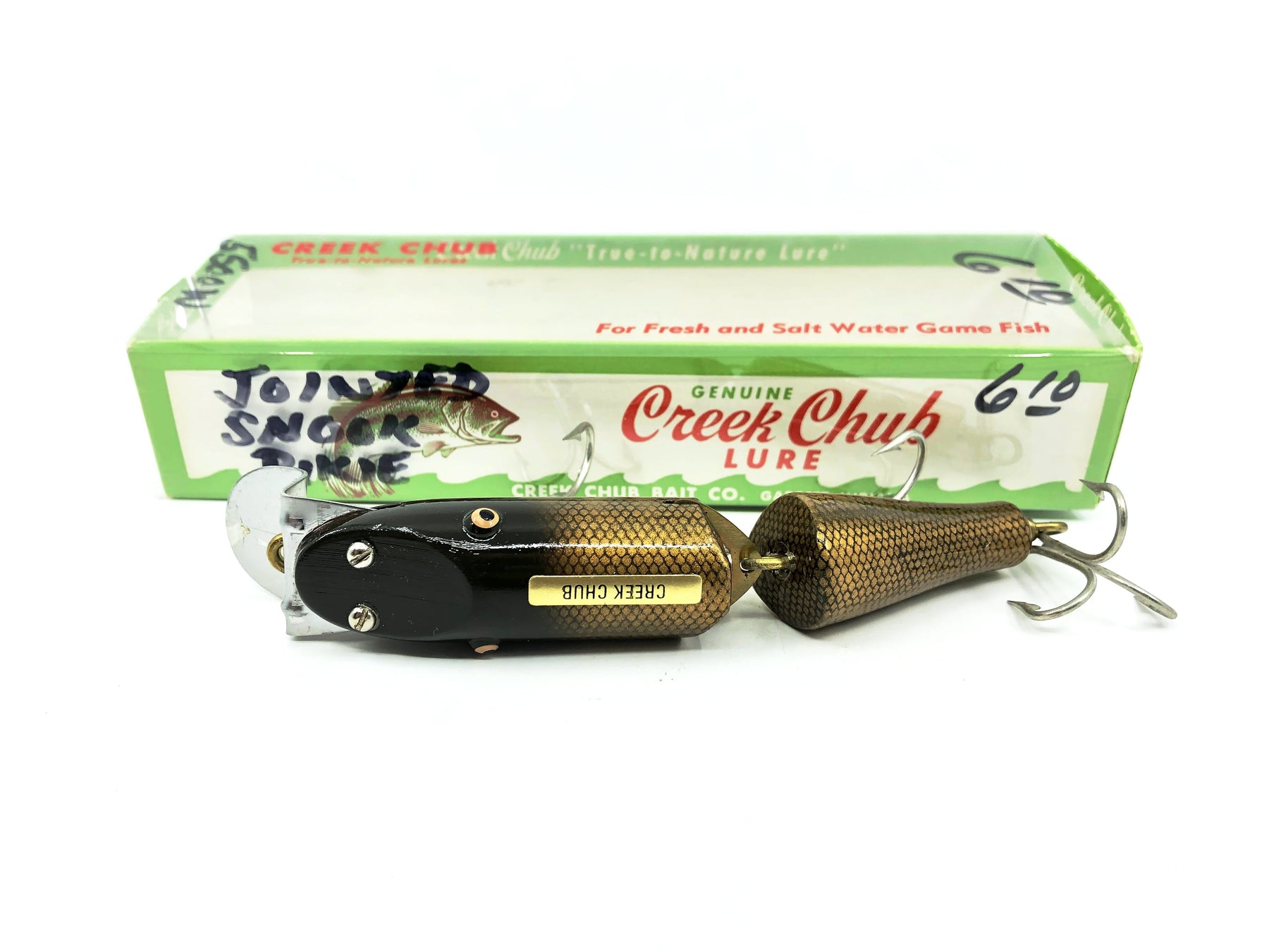 Creek Chub Jointed Snook Pikie 5500, Pikie Scale Color 5500W with Box. Matching box on this Creek Chub. About 5" long body excluding lip. Great vintage lure here. Wooden lure, tack eyes. Box has some markings with a sharpie but in good condition otherwise. The lure is in great condition. Nice combo. This one won't last long so grab it for your collection while you can. See photos.