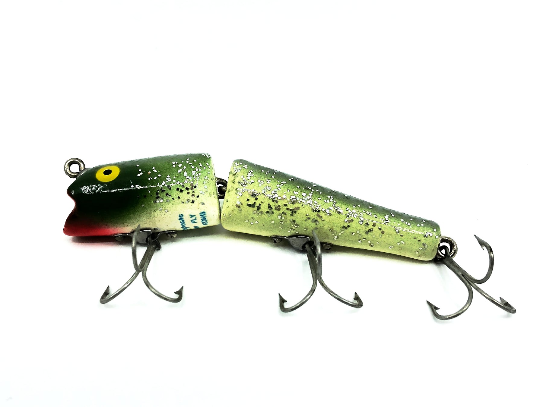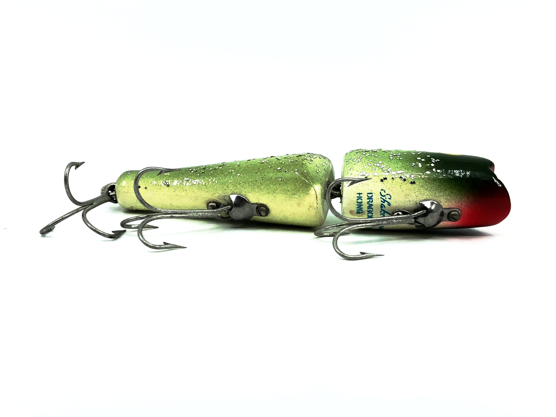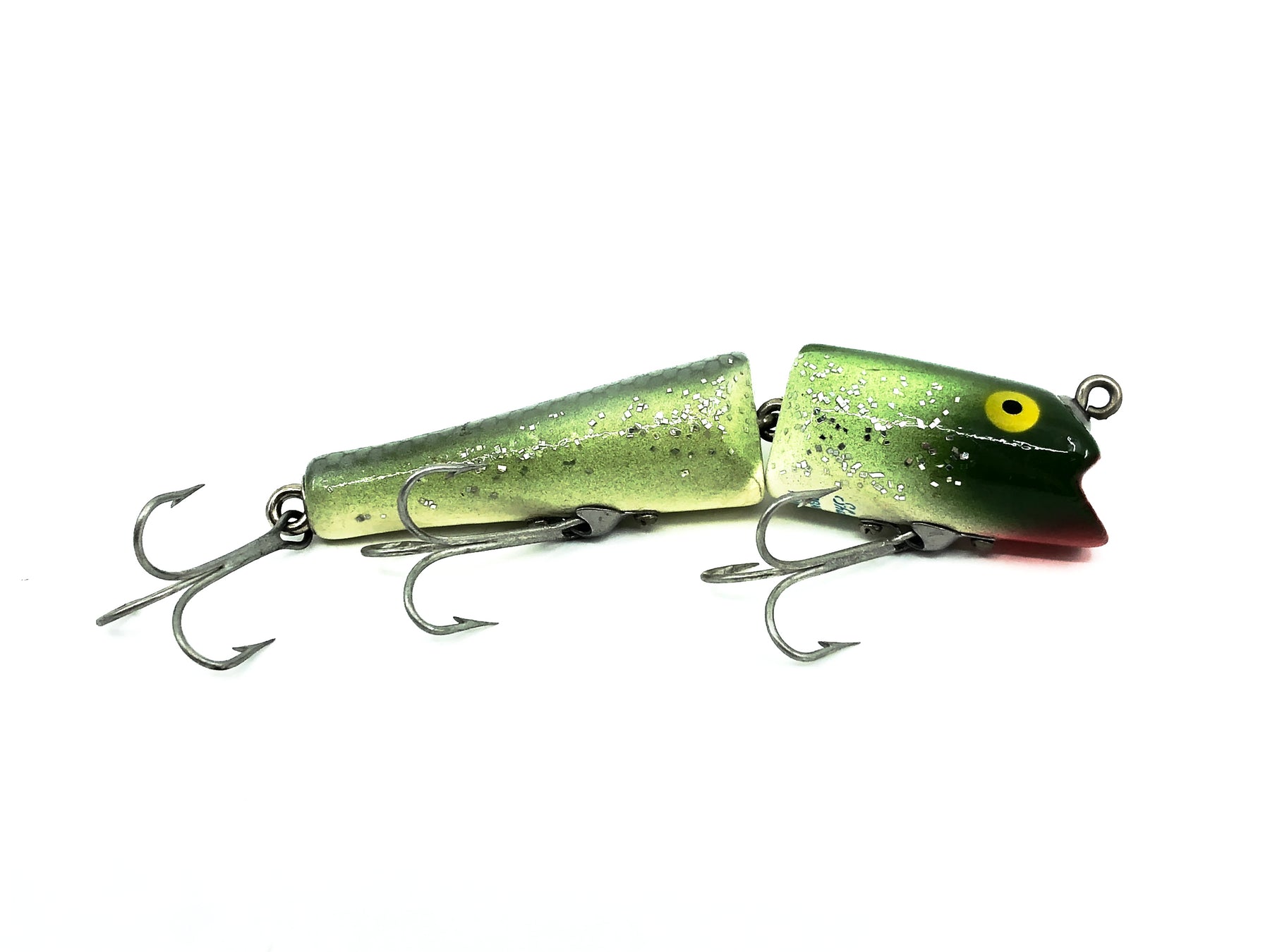 Shakespeare Jointed Dragon Fly, Green Flitter Color. About 4" long. Used vintage lure with some wear as shown but still in overall good condition. See photos. Harder to find Shakespeare. Fish or collect.
