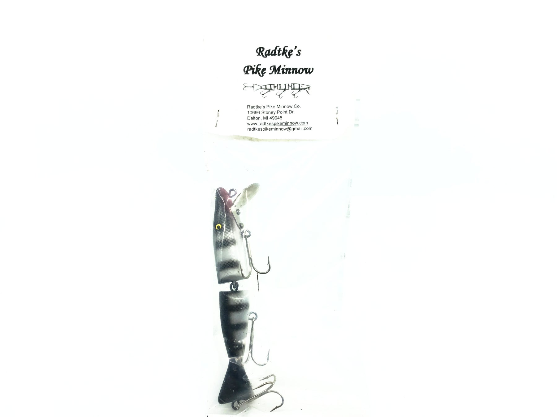 Radtke Pike Minnow, Gray Ghost Color on Card. About 5 1/2" long. Lure is new in packaging and packaging is in good condition. Classic Muskie, Pike, Walleye and Bass lure. See photos. Great lure to fish or collect.