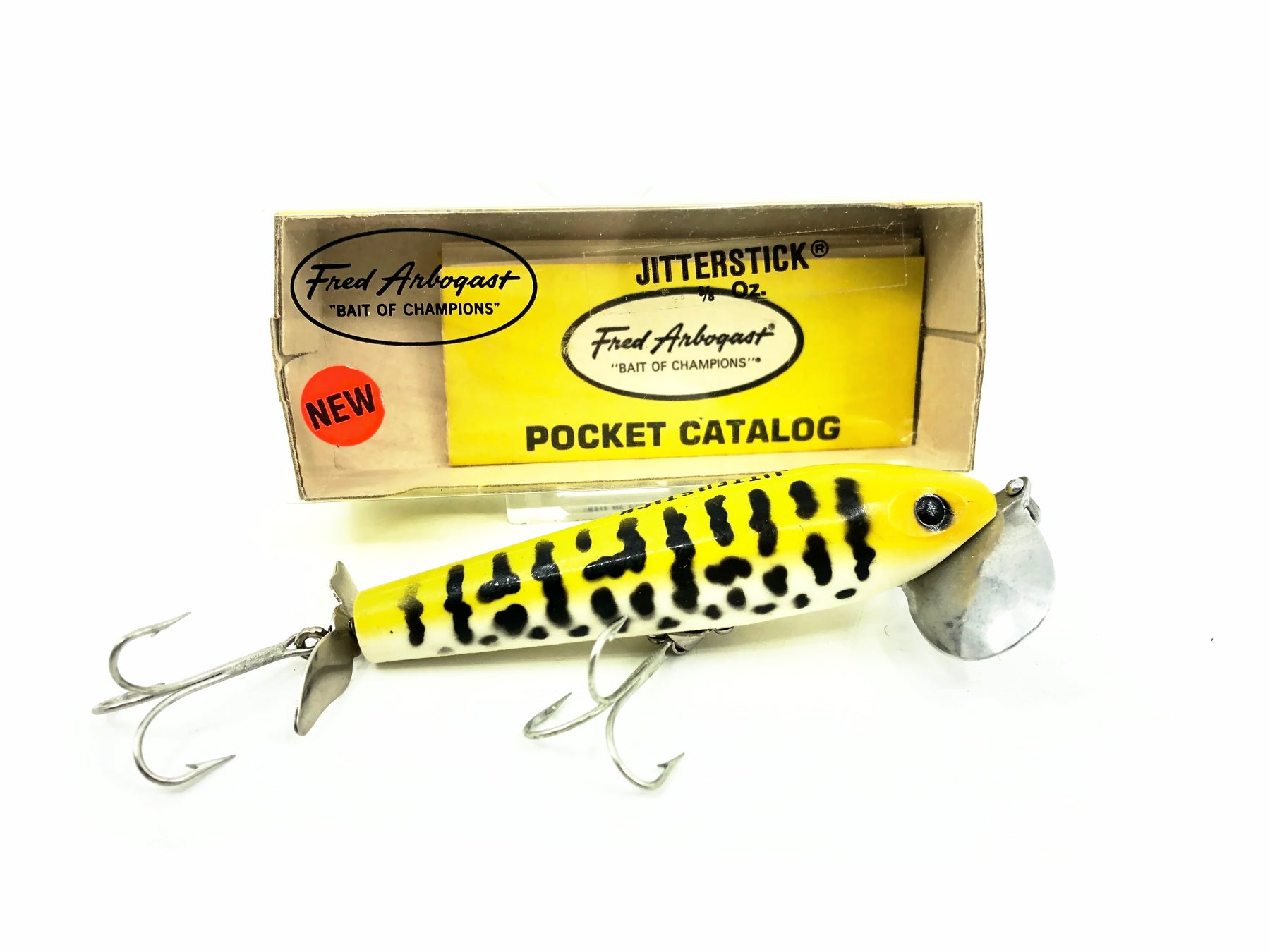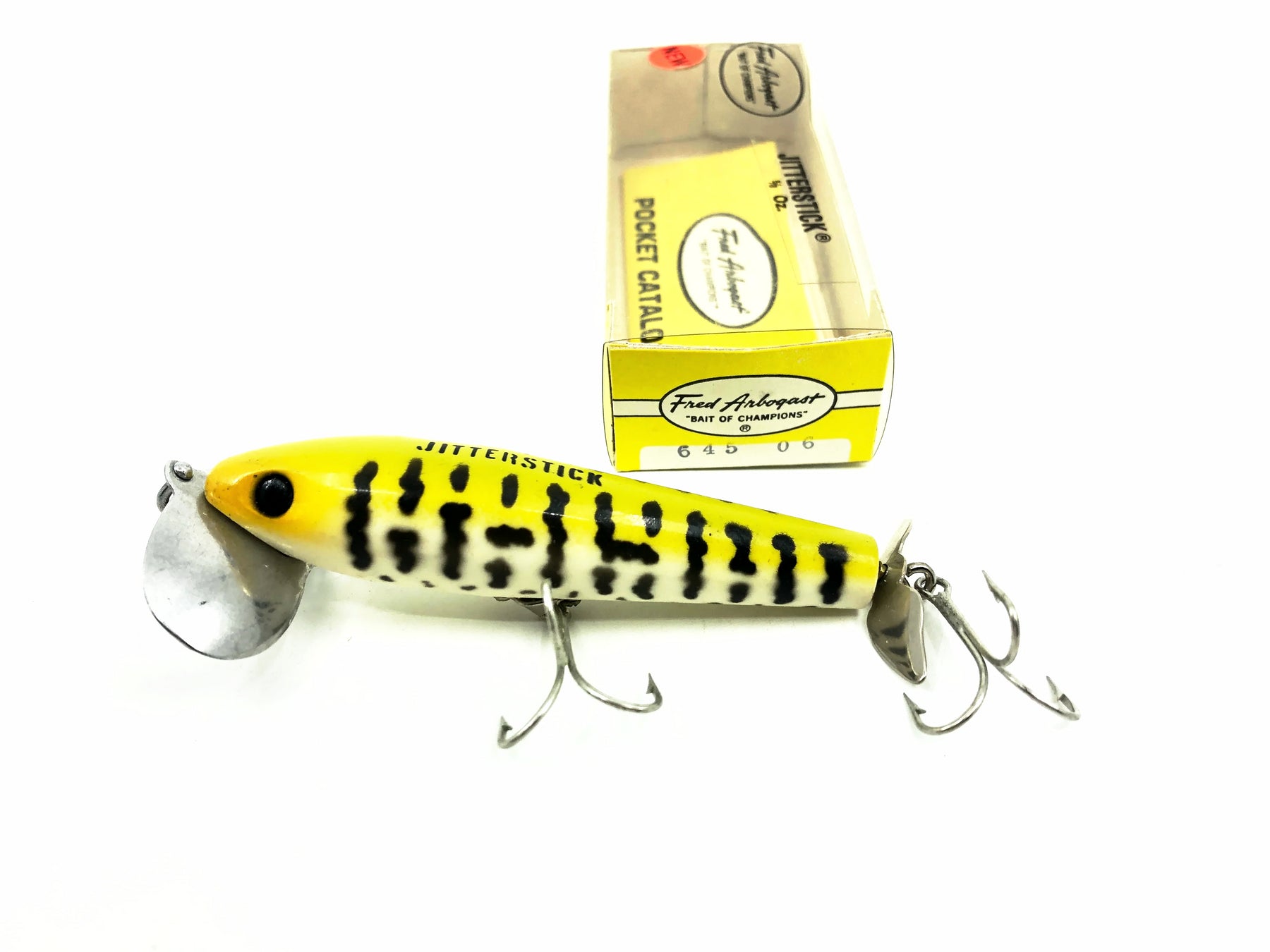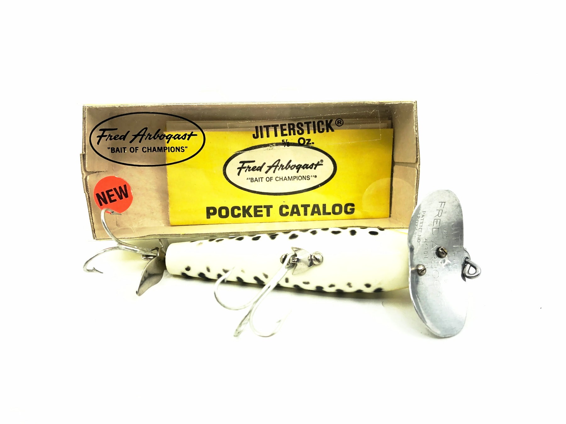 Arbogast Jitterstick, Frog/White Belly Color w/Box. Great combo here including box and box catalog. Body of lure about 4" long. This bait is new in an introduction box for this bait and the box is in great condition. Collect or fish this one.
