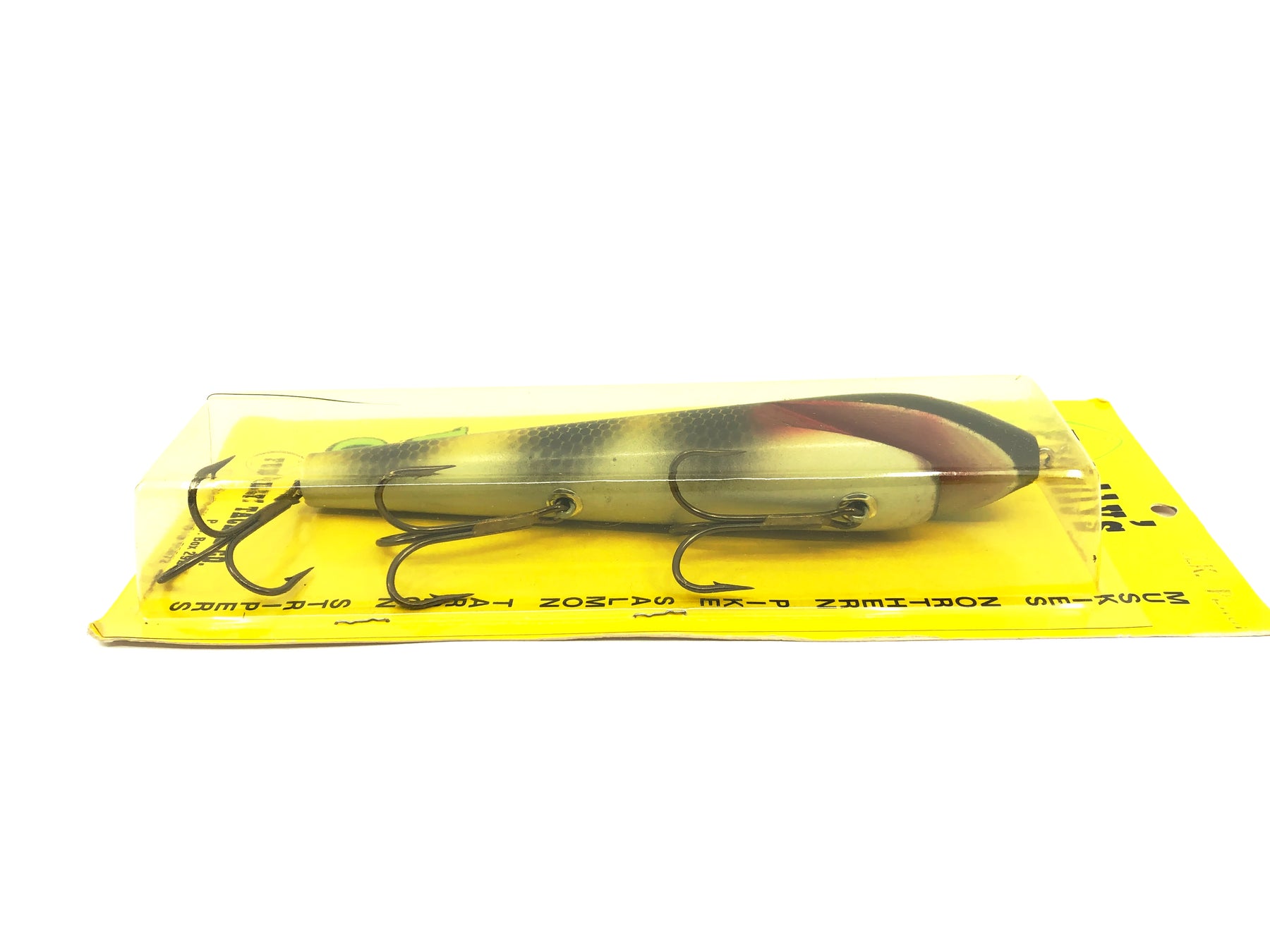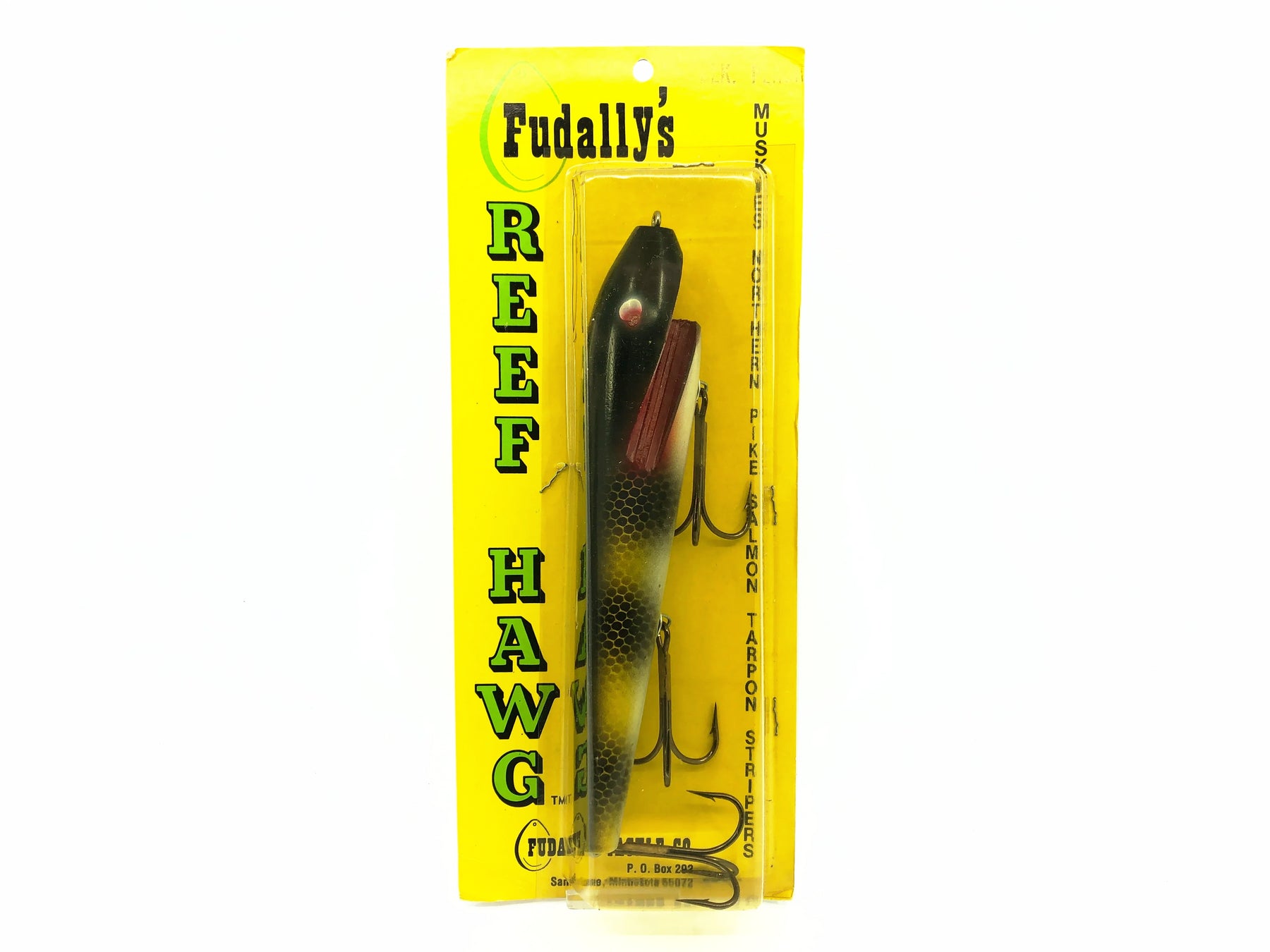 Fudally's Reef Hawg, Black Perch Color on Card. Quality wooden musky bait! Lure is about 7 3/4" long. This lure is new on card. The card is in ok condition with some uv staining and cracks in the bubble. See photos.