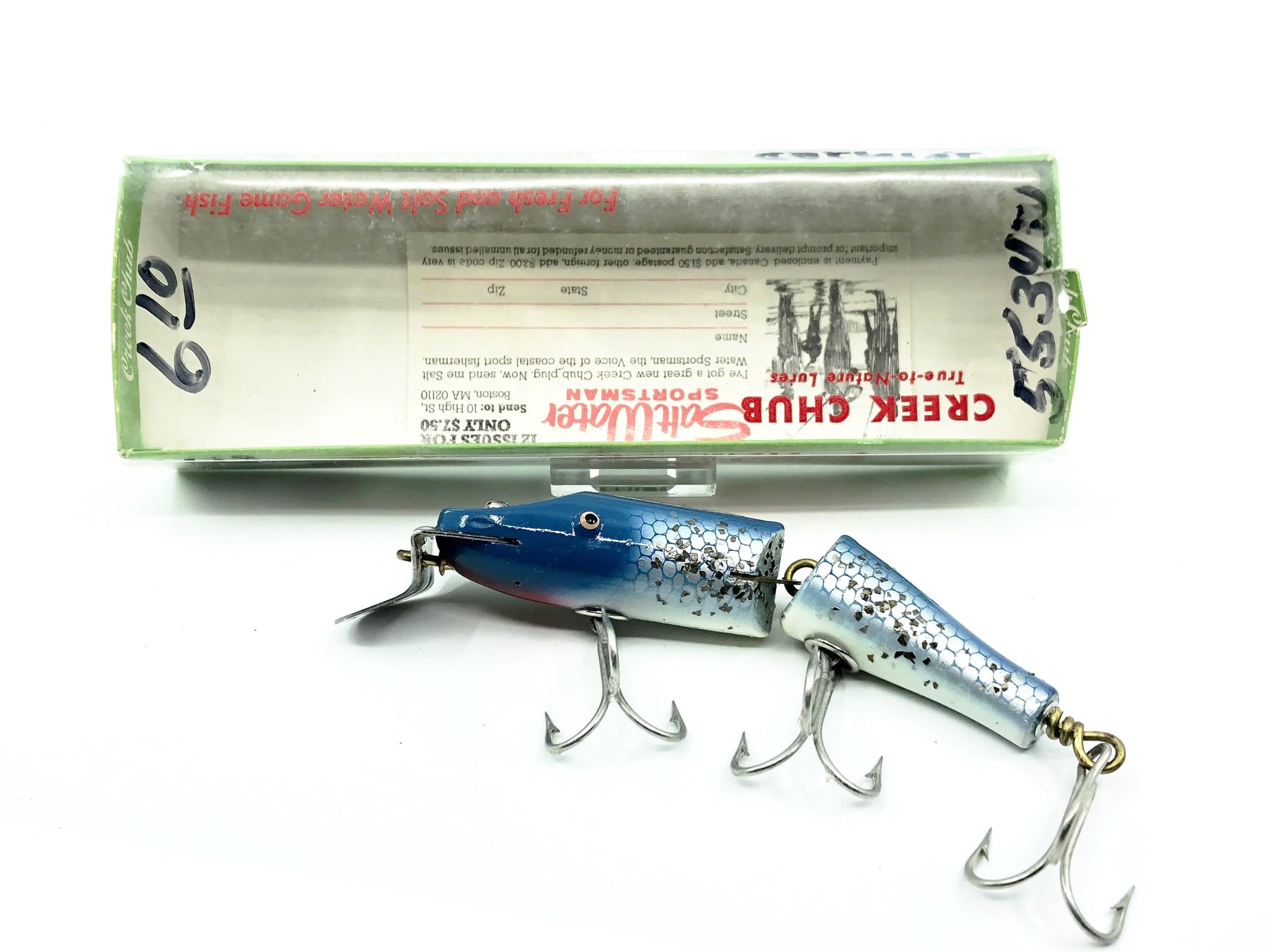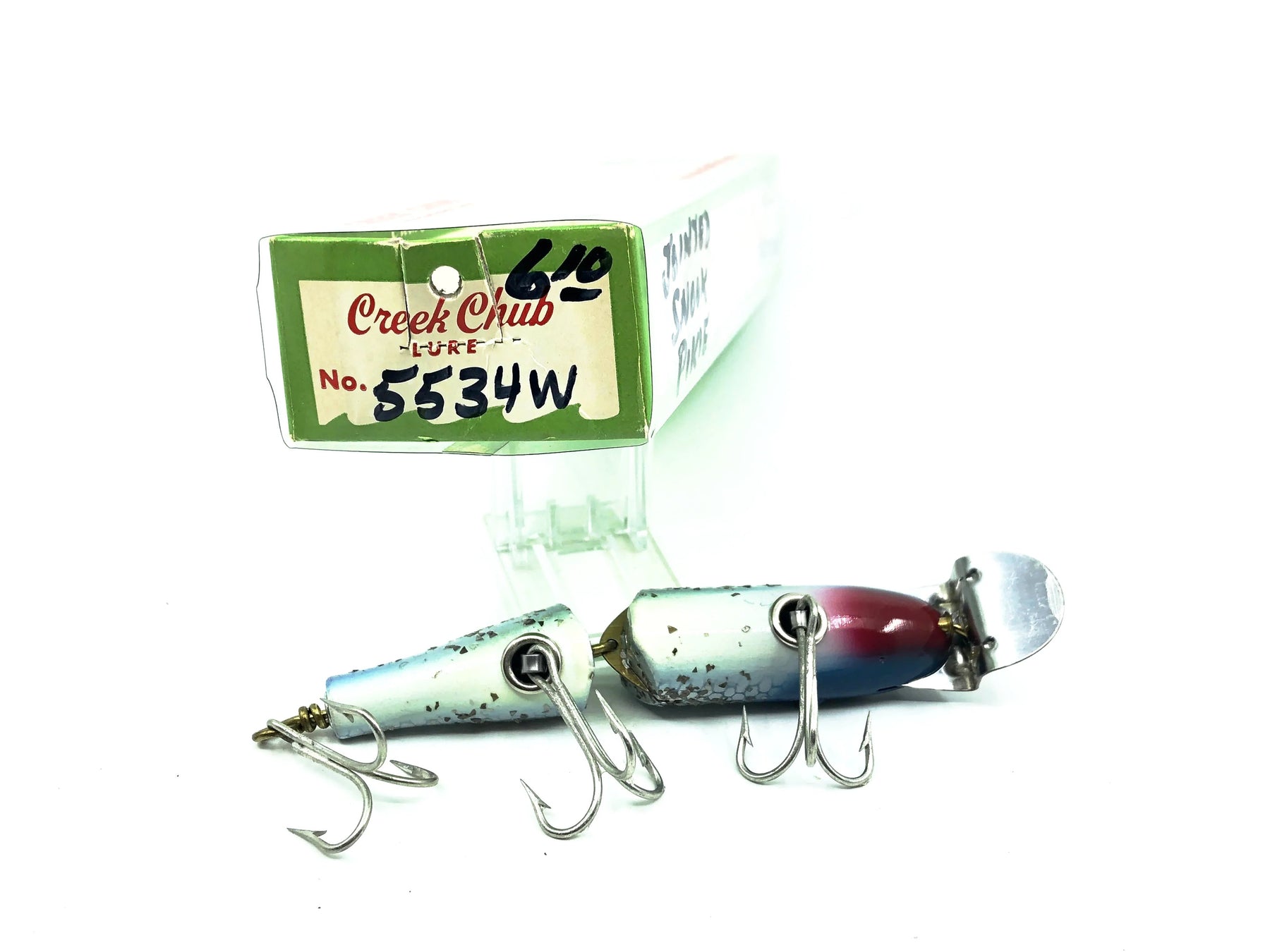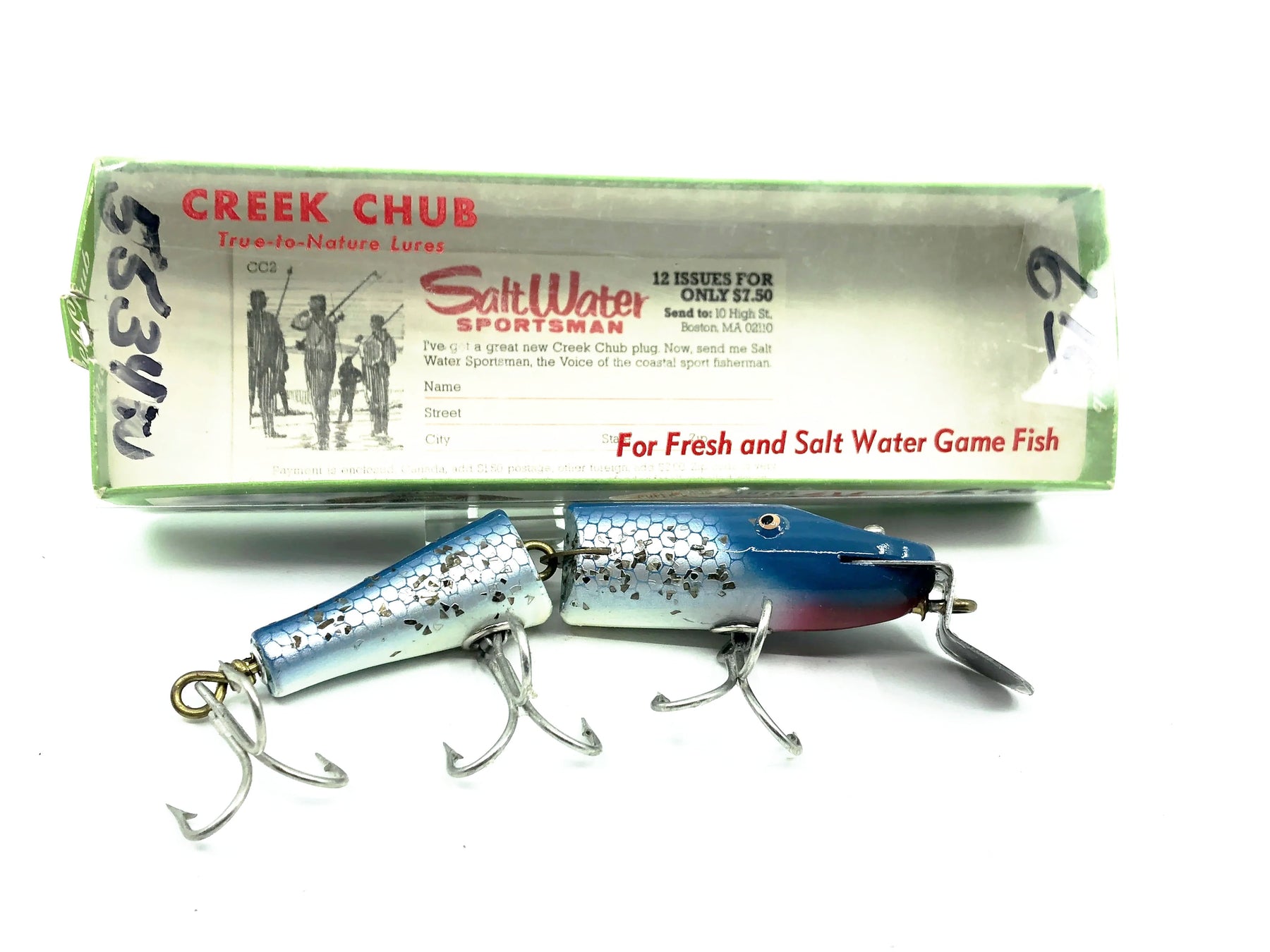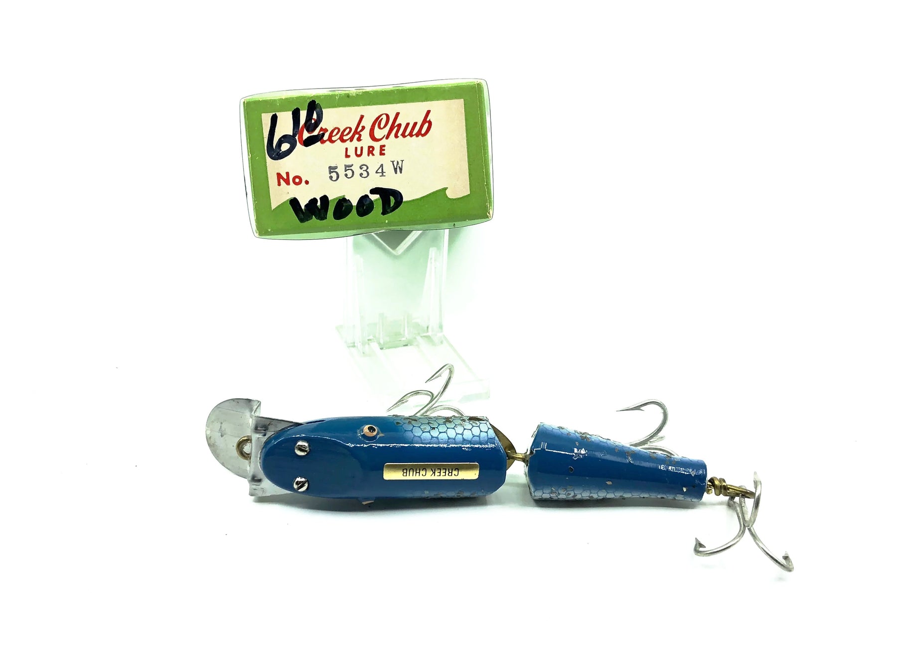Creek Chub Jointed Snook Pikie 5500, Blue Flash Color 5534 with Box. Matching box on this rarer Creek Chub. About 4 7/8" long body excluding lip. Great vintage lure here. Wooden lure, tack eyes. Box has some markings with a sharpie but in good condition otherwise. The lure is in great condition. Nice combo. This one won't last long so grab it for your collection while you can. See photos.