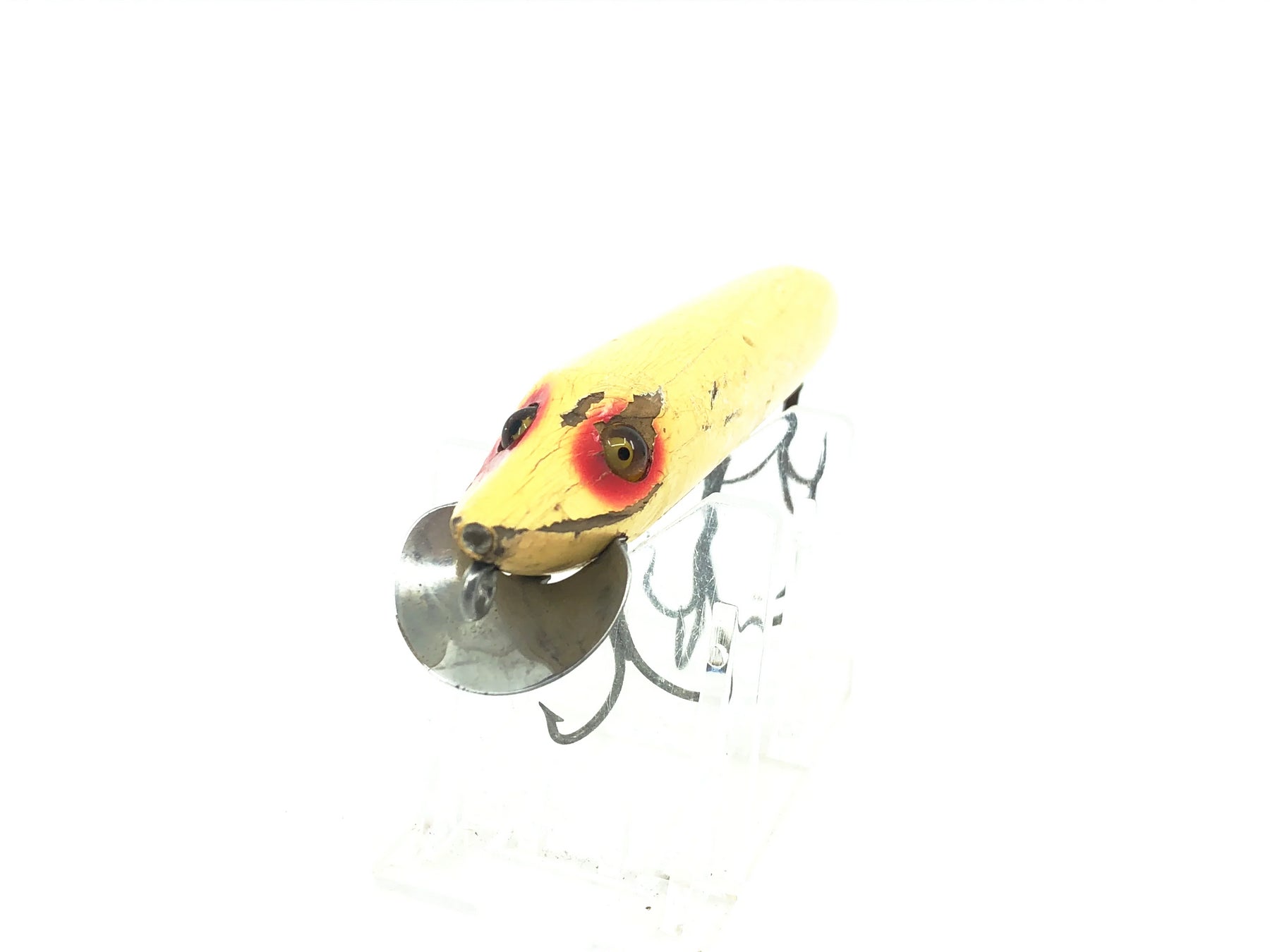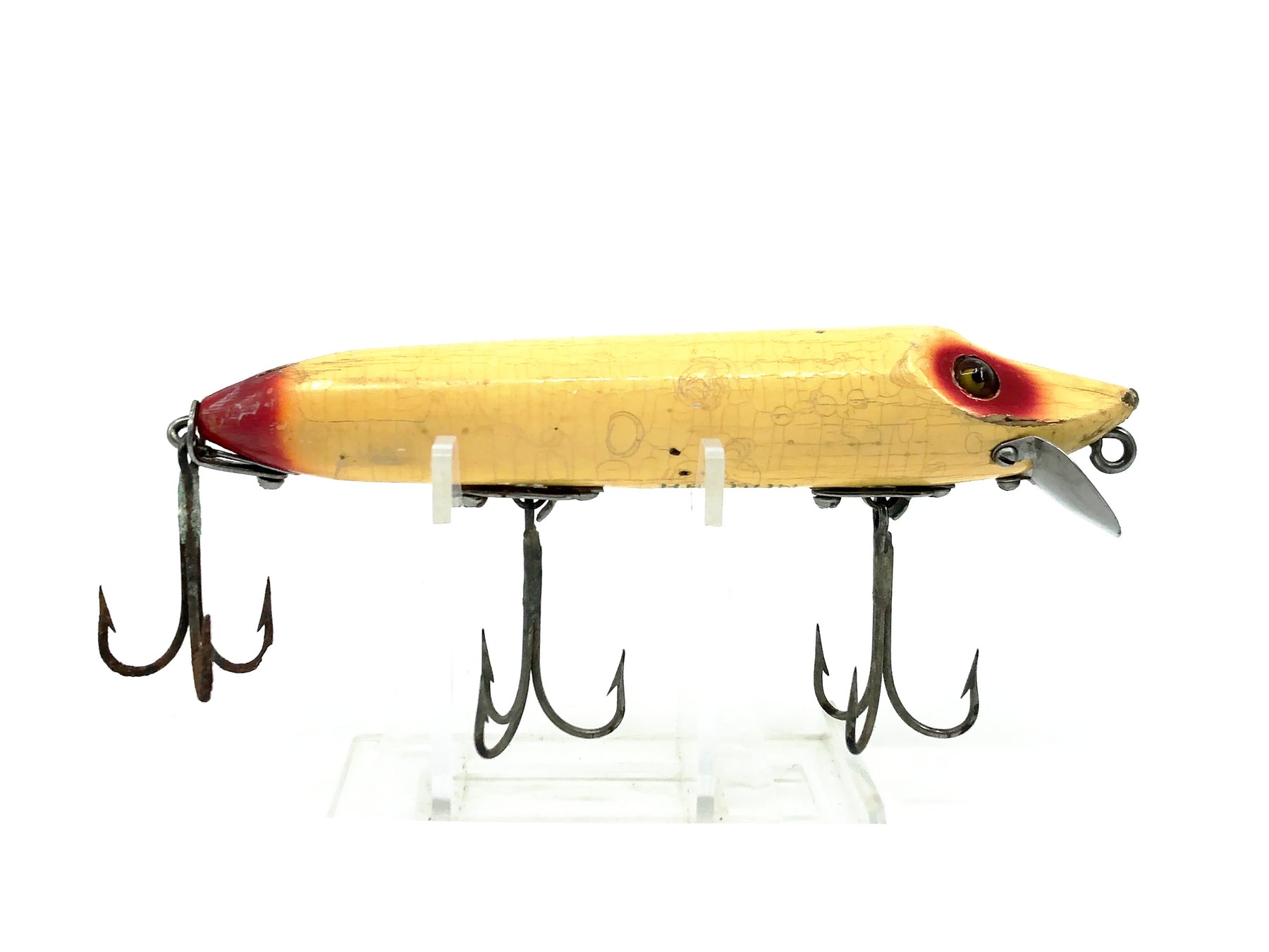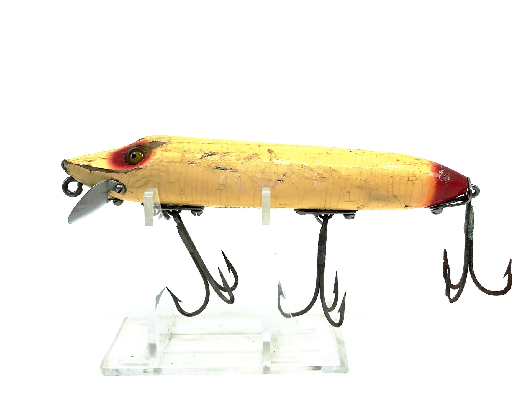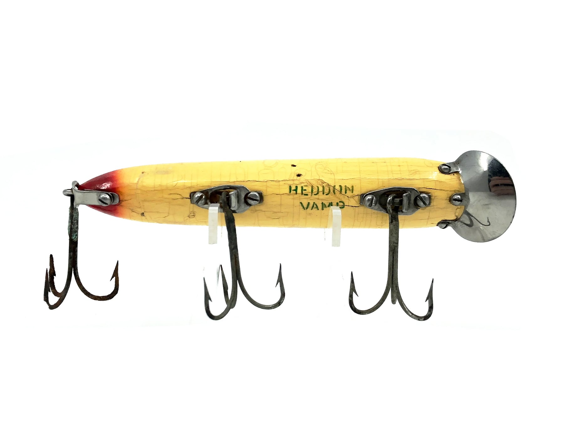 Heddon Vamp, RET Red Eye & Tail Color. Hard to find vintage bait here. Wooden lure, glass eyes and early flap rig hardware. Lure is about 4 1/2" long. Used with some wear and marks but still in overall good condition for this early lure, See photos. Grab this one for your collection. Tougher color to find in any condition.