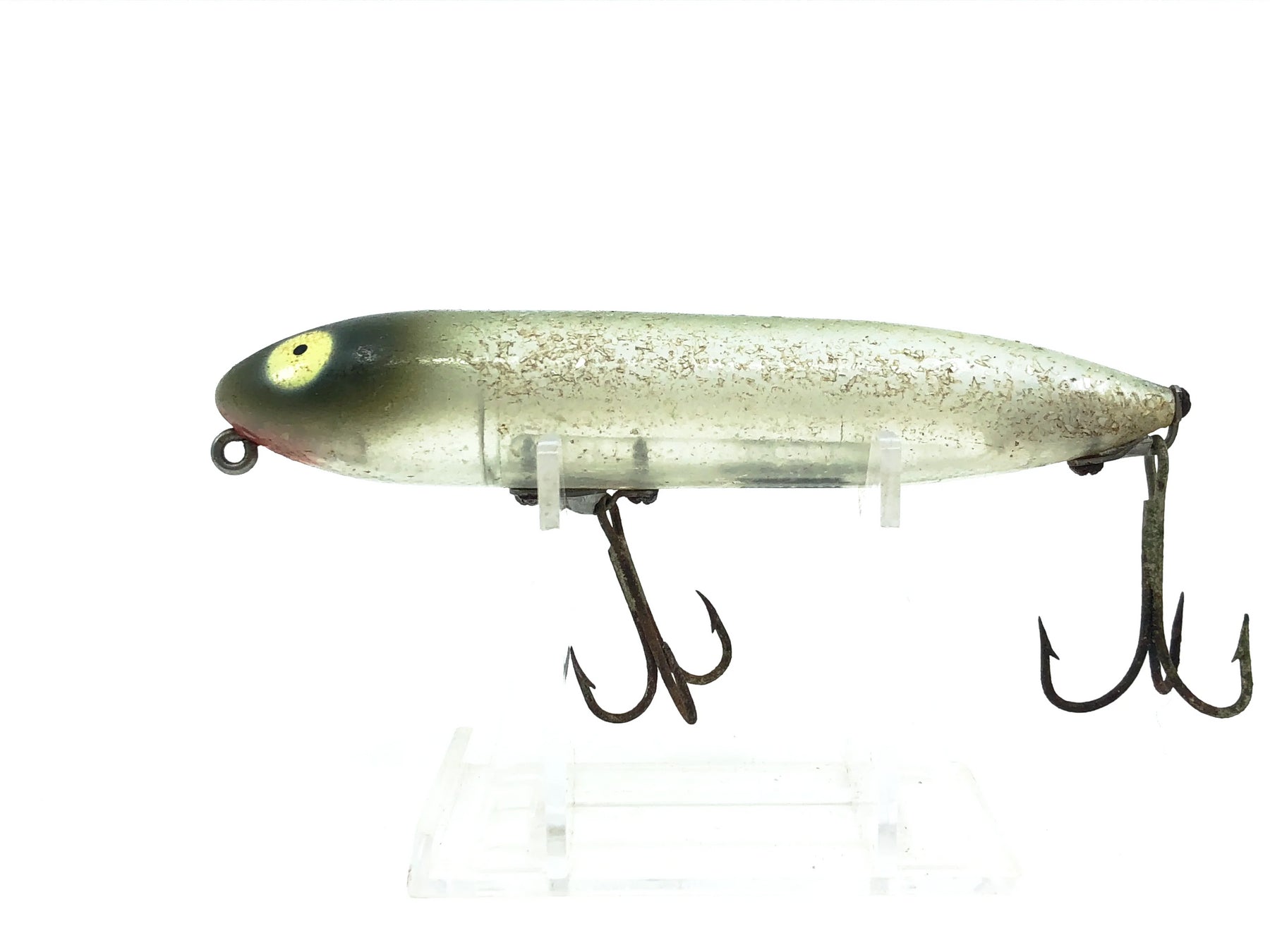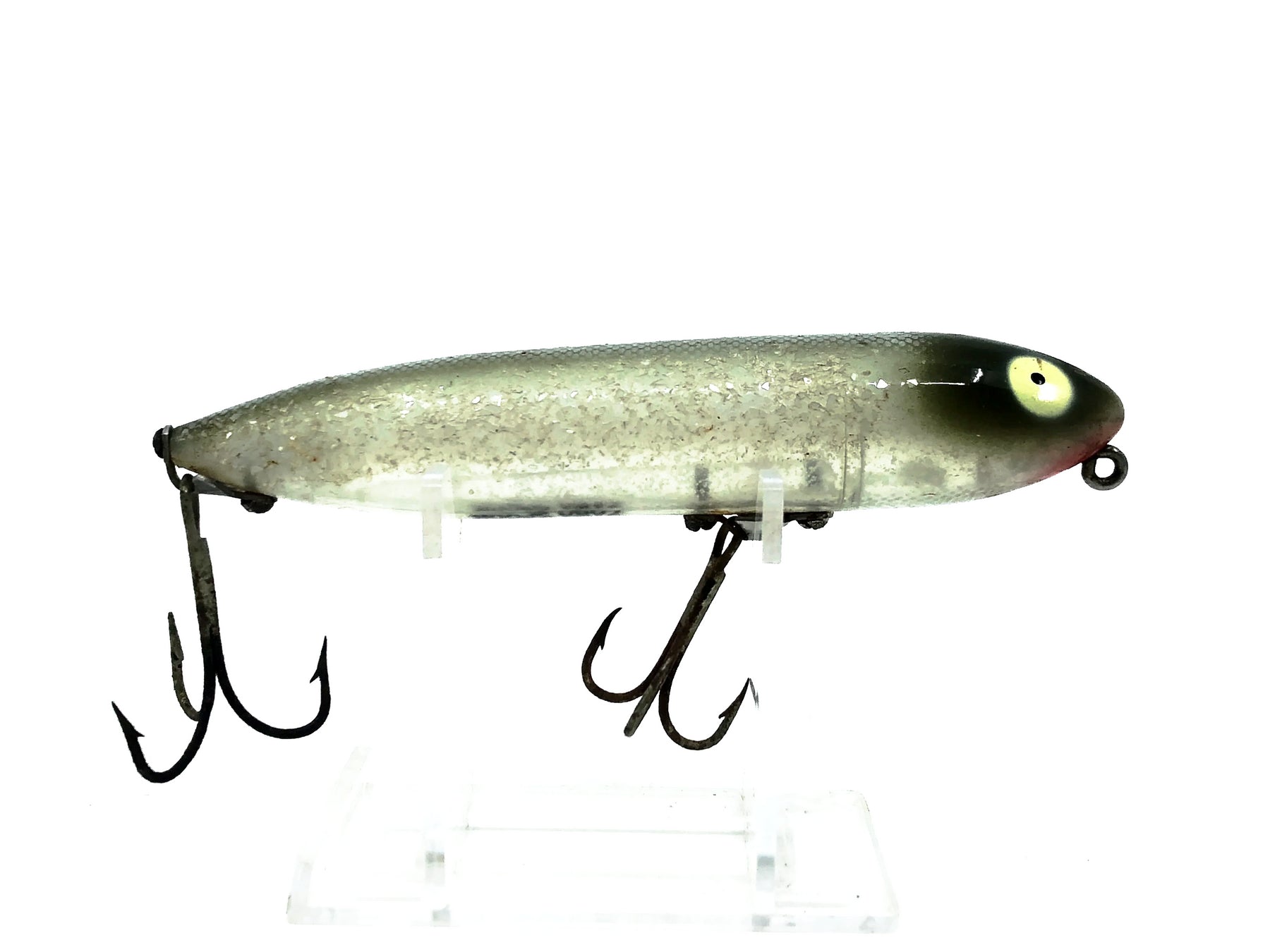 Heddon Original Zara Spook, SS Silver Flitter Color. About 4 1/4" long. Used with a lot of small marks and some minor wear but in overall good condition, see photos. Classic Heddon lure.