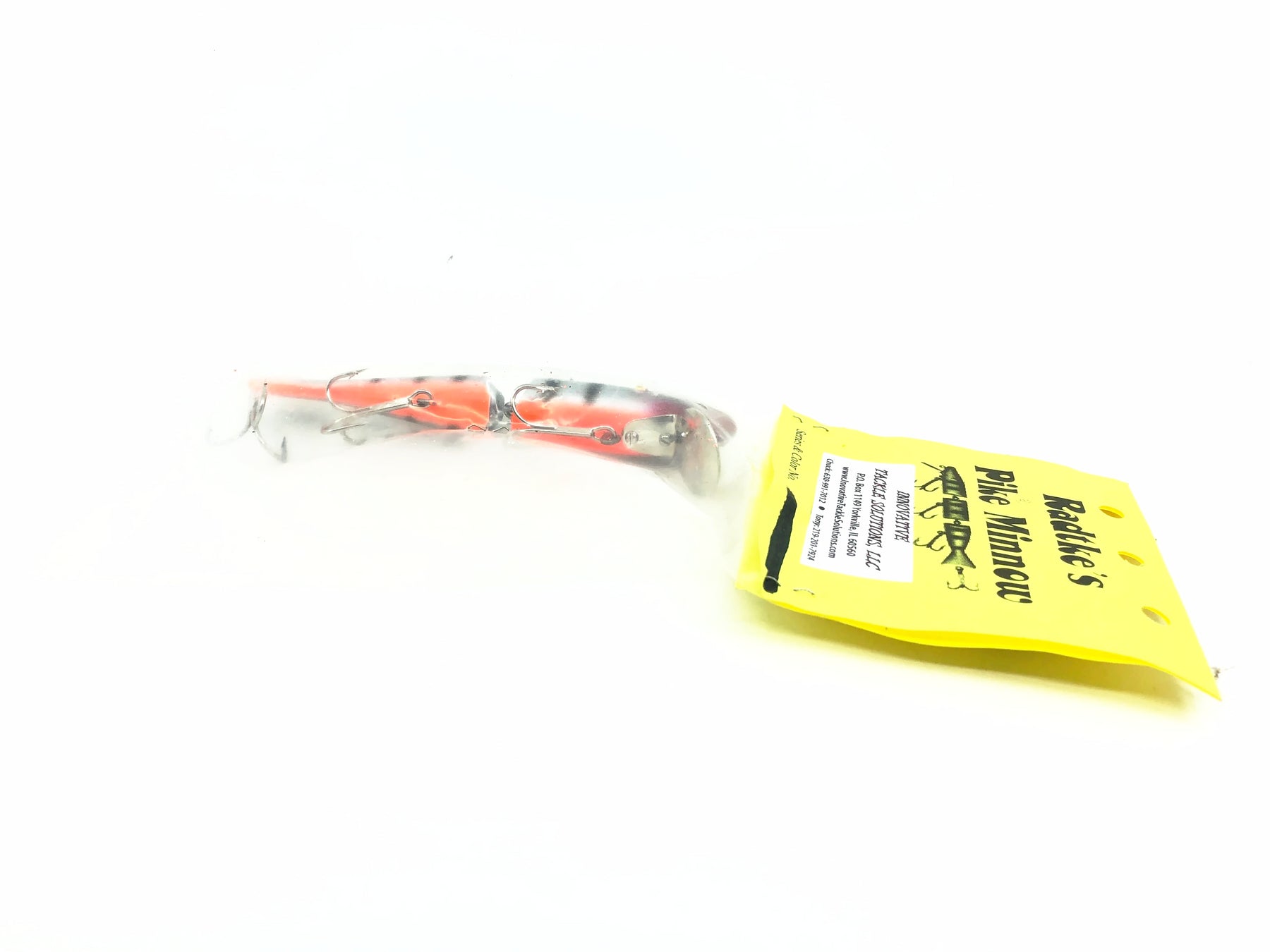 Radtke Pike Minnow, Chrome/Black Back/Orange Belly Color on Card. About 5 1/2" long. Lure is new in packaging and packaging is in good condition. Classic Muskie, Pike, Walleye and Bass lure. See photos. Great lure to fish or collect.