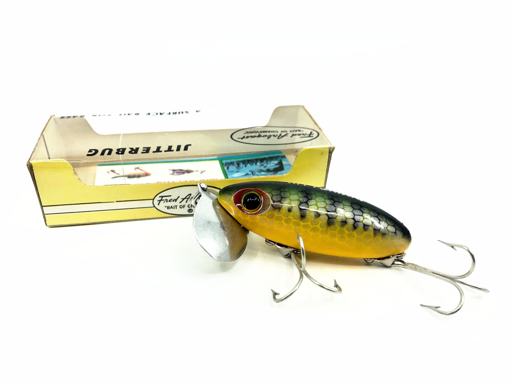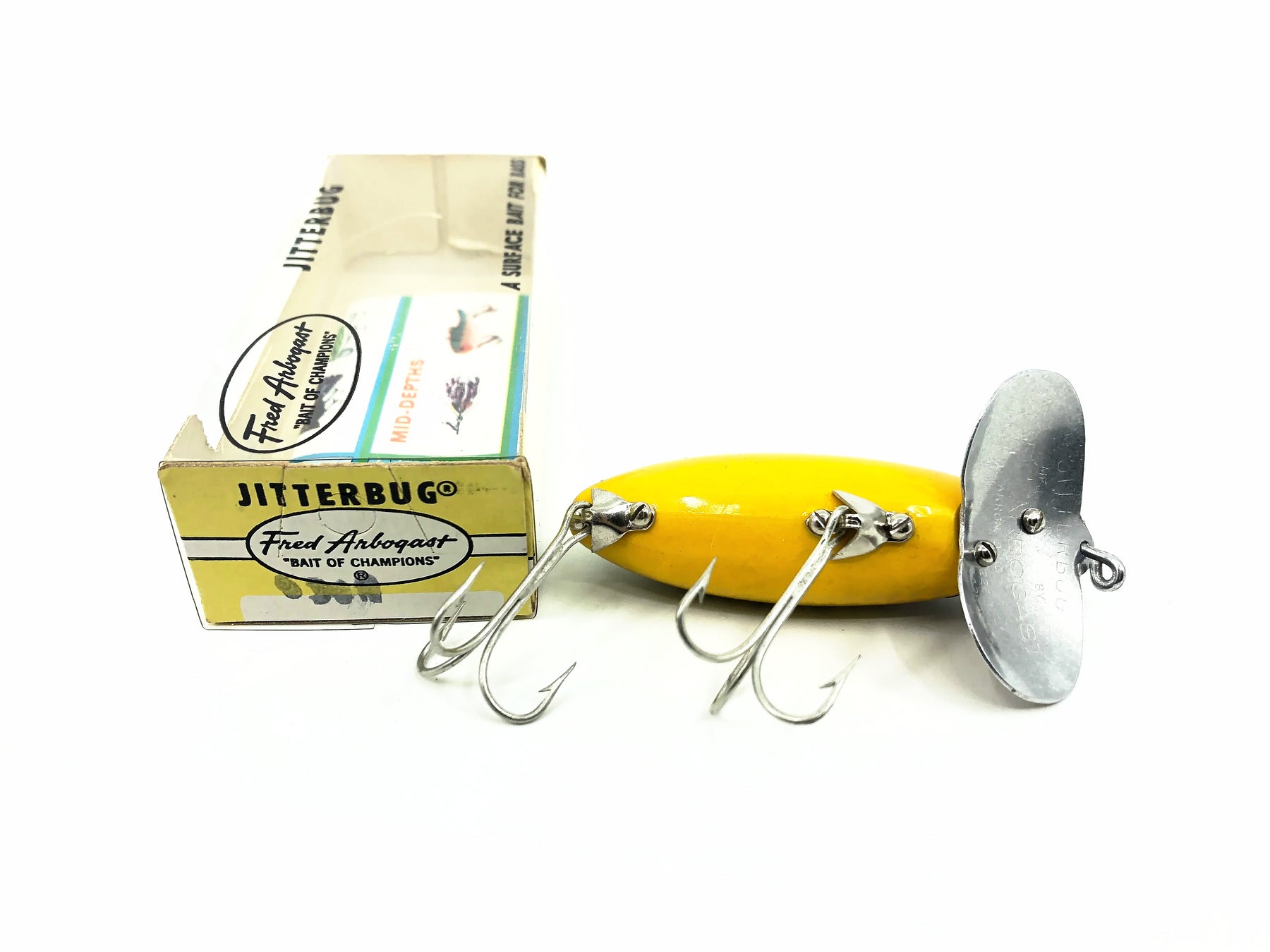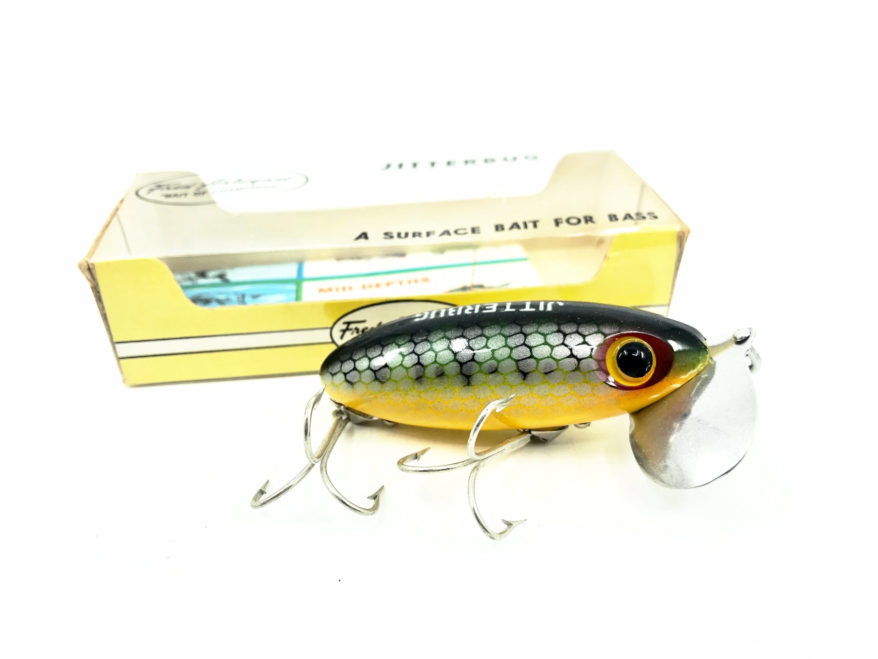 Jitterbug, World's best surface bait! Jitterbugs wobble. . . the double-lobed "lip" creates a loud paddling noise . . . takes bass day or night. Retrieve continuously or by hesitation.