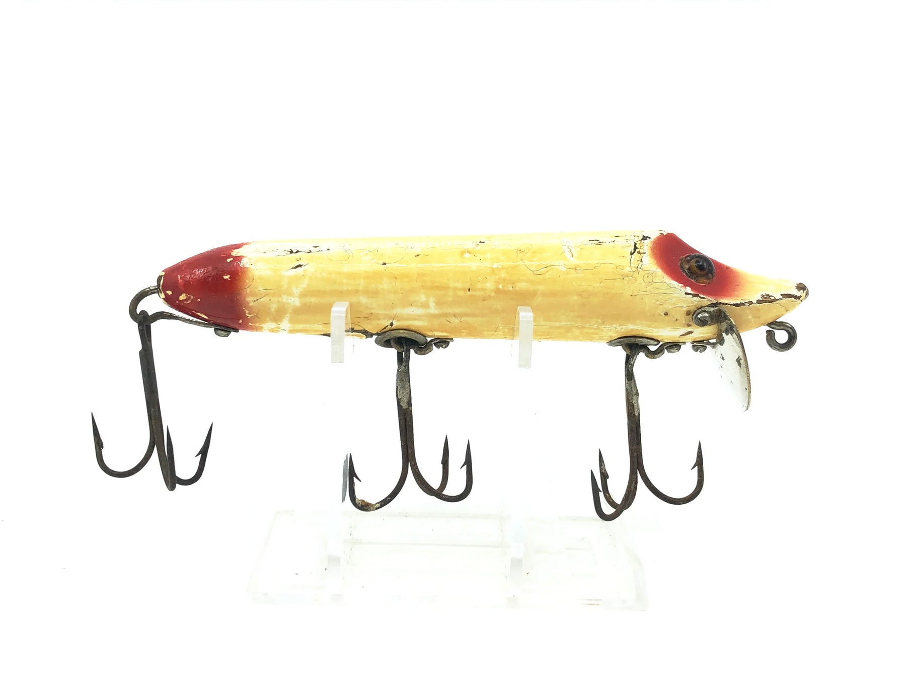 Heddon Vamp, RET Red Eye & Tail Color, L-Rig Hardware. Hard to find vintage bait here. Wooden lure, glass eyes and early L-rig hardware. Lure is about 4 1/2" long. Used with wear and marks but in overall ok condition for this early lure, See photos. Grab this one for your collection. Tougher color to find in any condition.