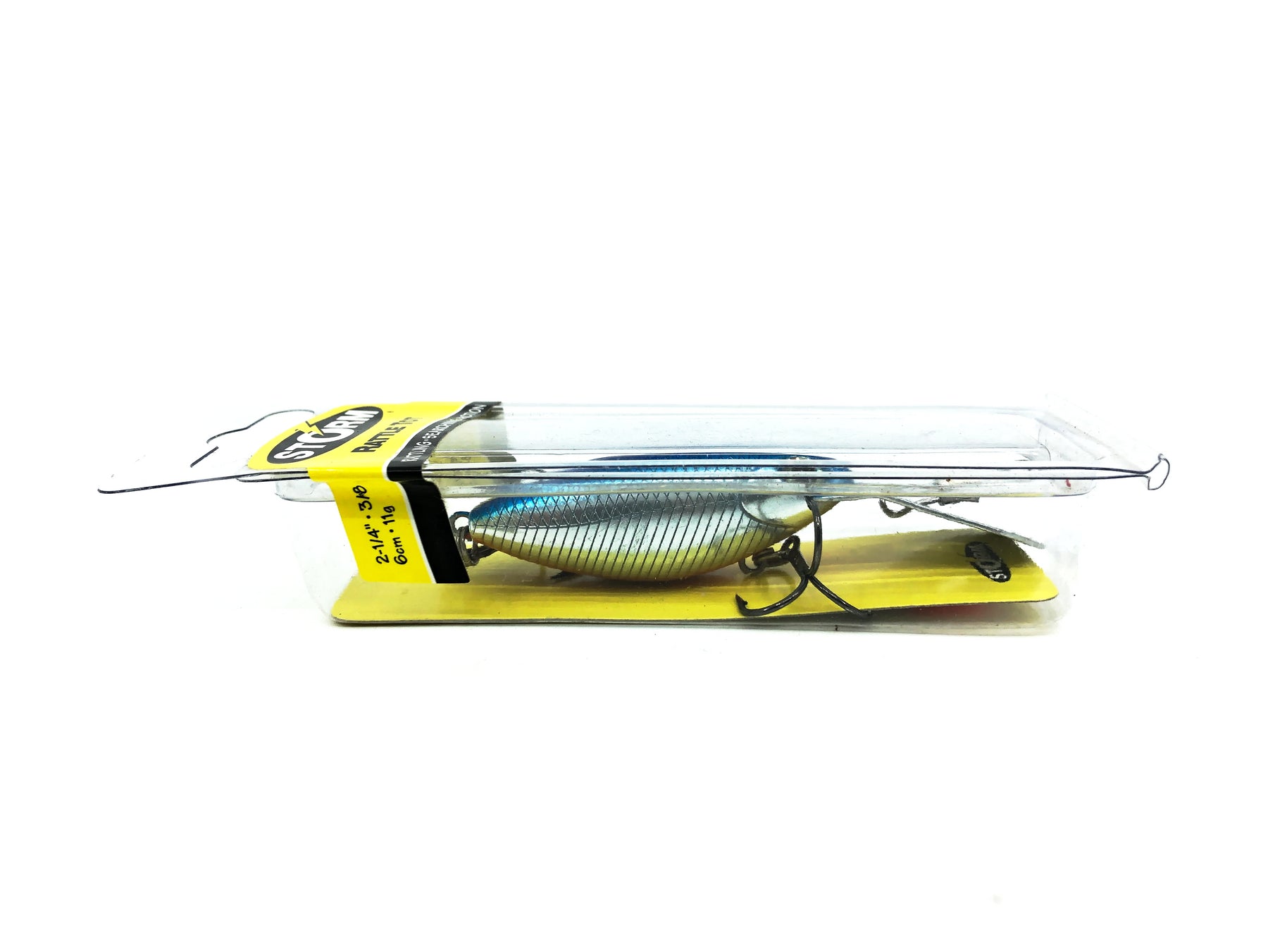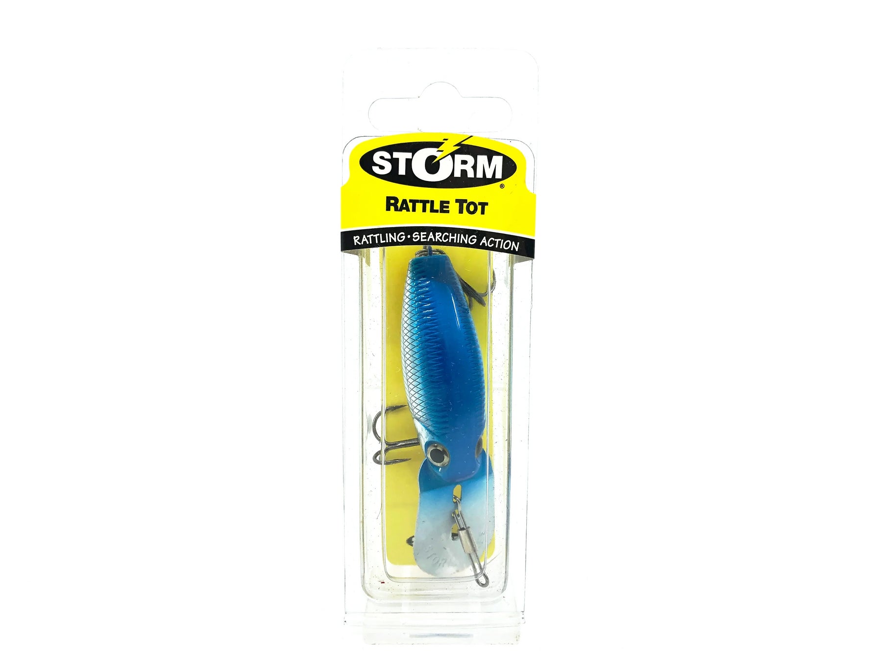 Storm Rattle Tot, Blue/Chrome/Orange Belly Color w/Box. Rapala Storm lure here. About 3 1/2" long including the lip. Lure is new in the box and the box has some minor dents. Great diving lure that provides plenty of action. See photos.