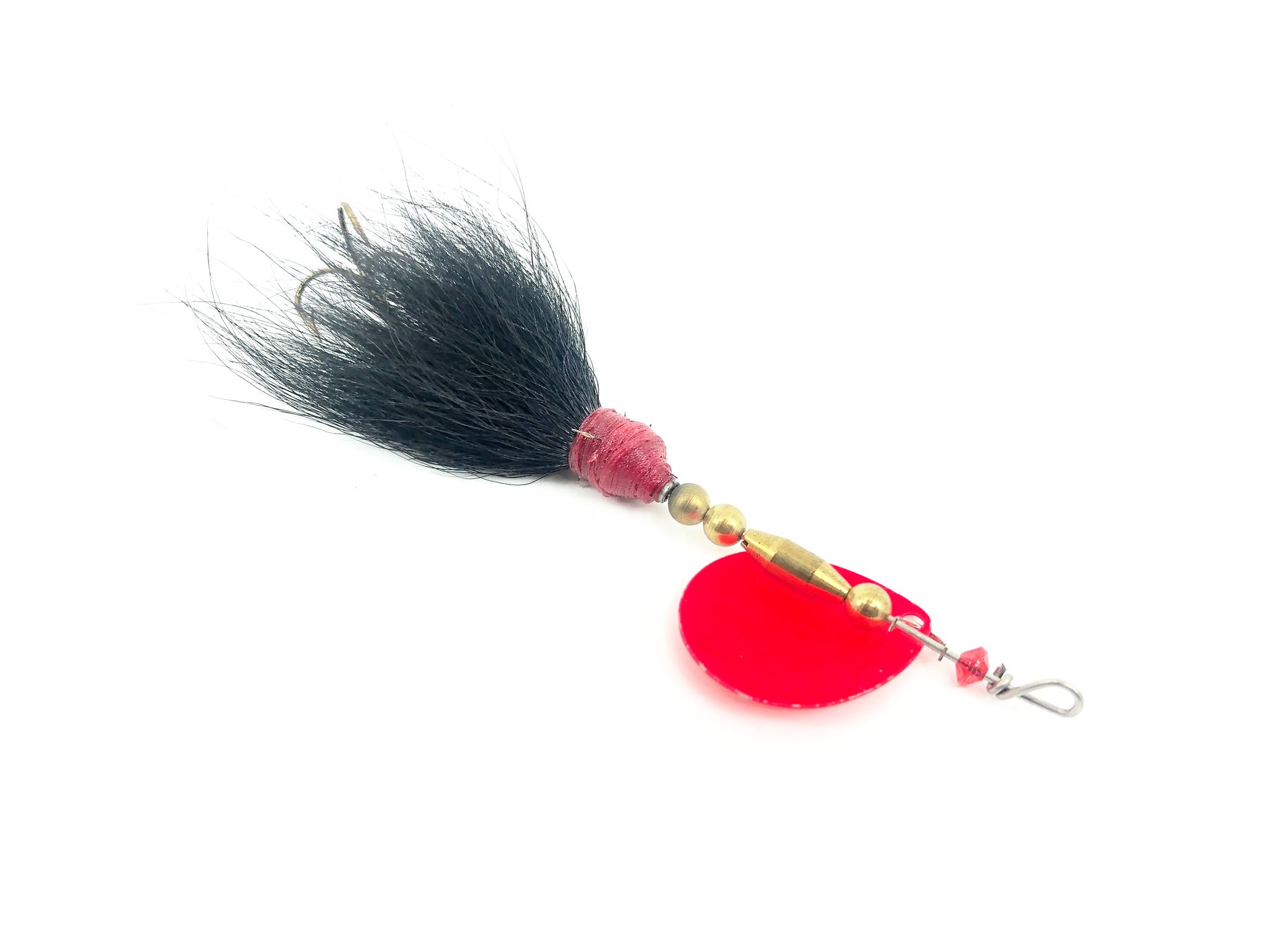 Pike Bucktail Spinner, Fluorescent Orange Blade/Black Tail Color. Great spinner here from an unknown maker. Lure is about 5 3/4" long from hook to body and weighs about 0.5oz. Lure is used but is in good condition. Fish this deal!