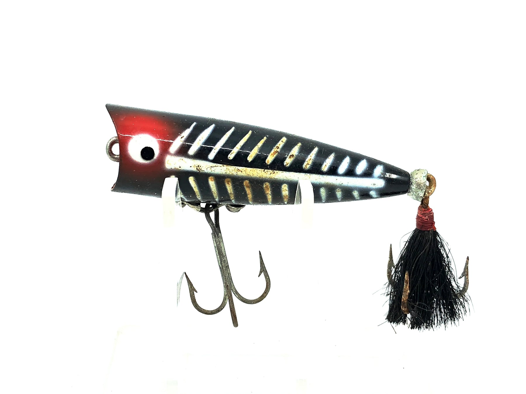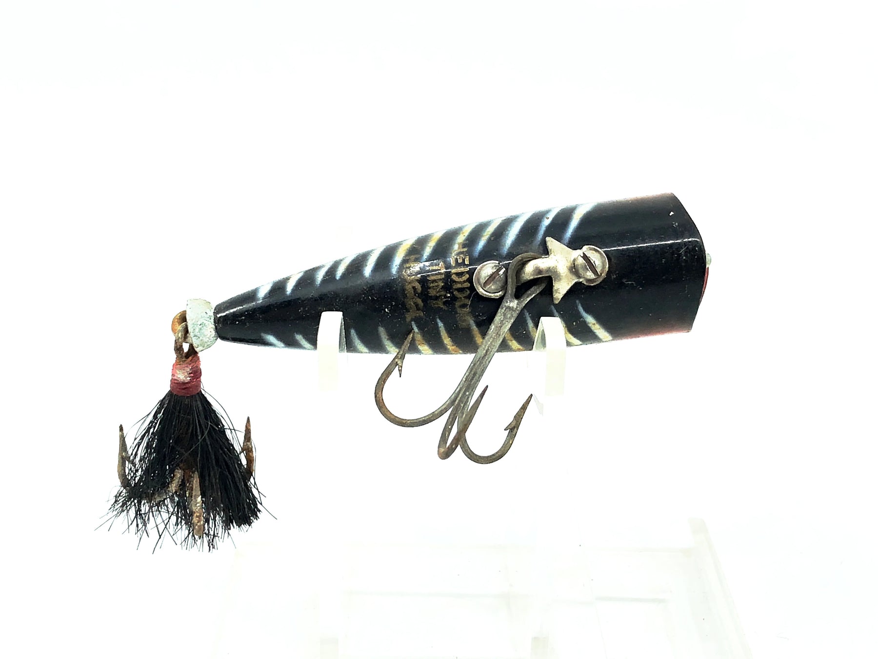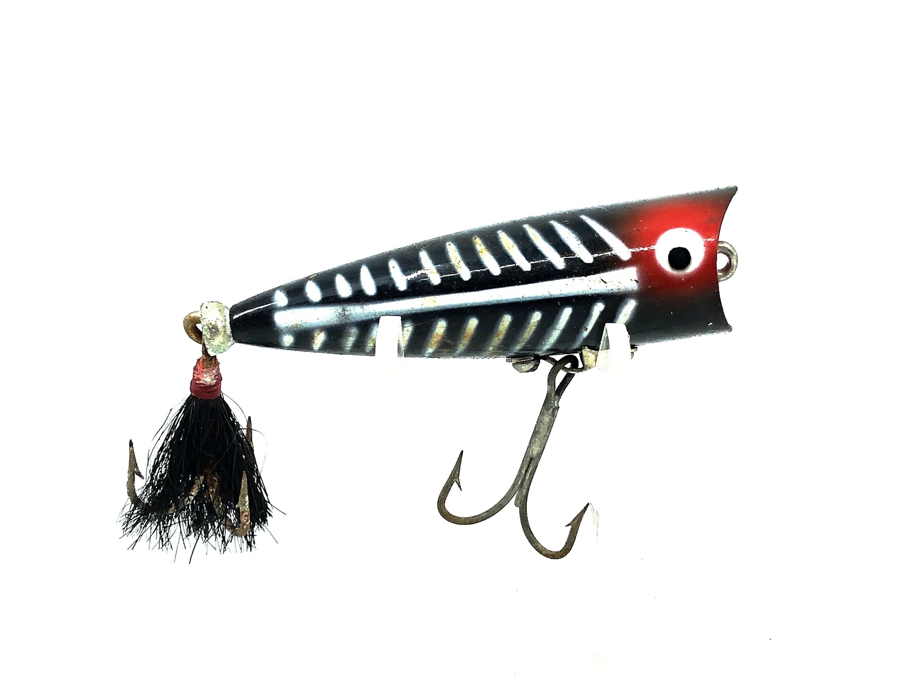 Heddon Tiny Chugger, XBW Black Shore Minnow Color. About 2 3/8" long. Used with some wear and an added bucktail but still in good condition. Fish or collect a classic Heddon bait.