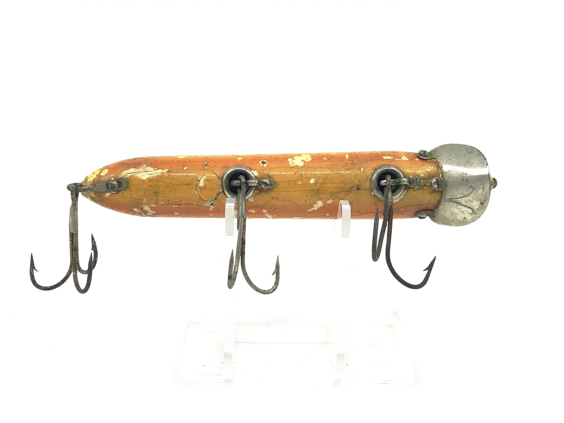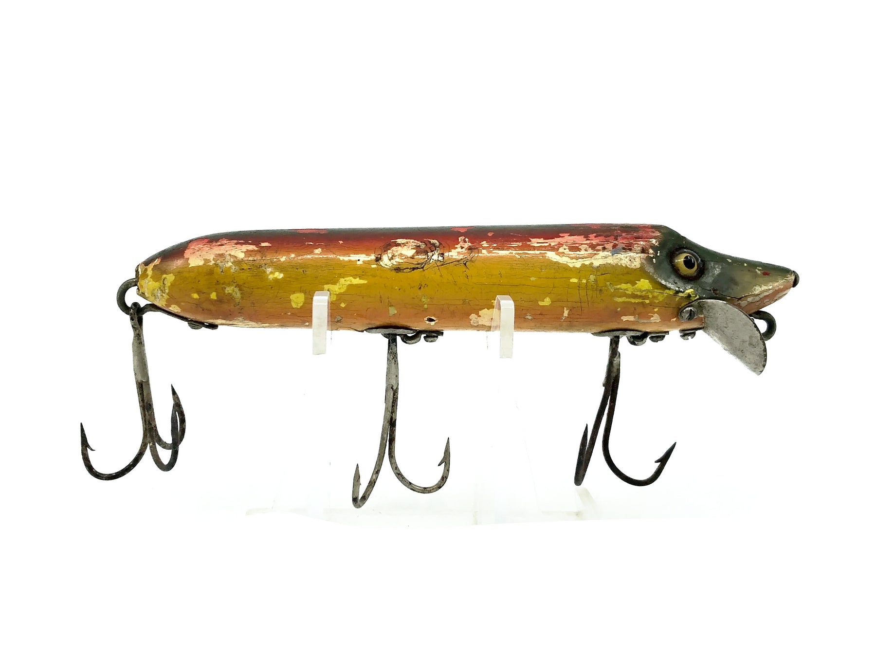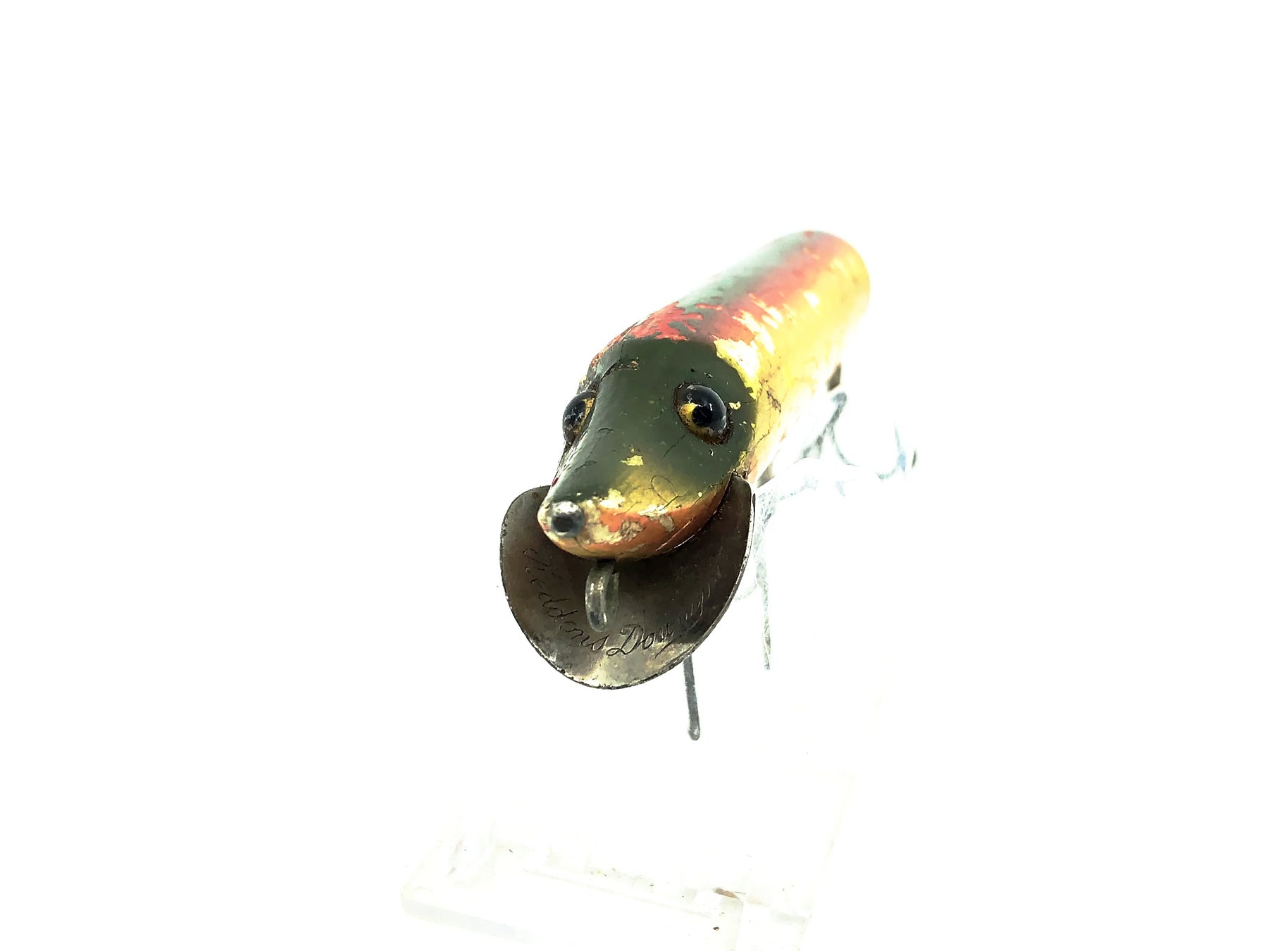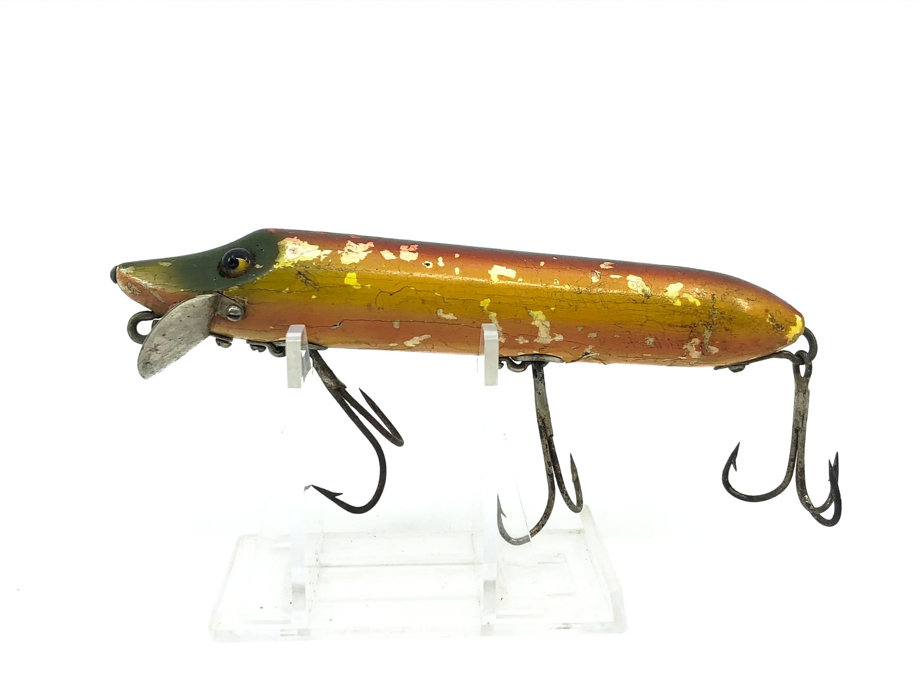 Heddon Vamp, RB Rainbow Color, L-Rig Hardware. Hard to find vintage bait here. Wooden lure, glass eyes and early L-rig hardware. Lure is about 4 1/2" long. Used with wear, marks, and two broken barbs but in overall fair condition for this early lure, See photos. Grab this one for your collection. Tougher color to find in any condition.