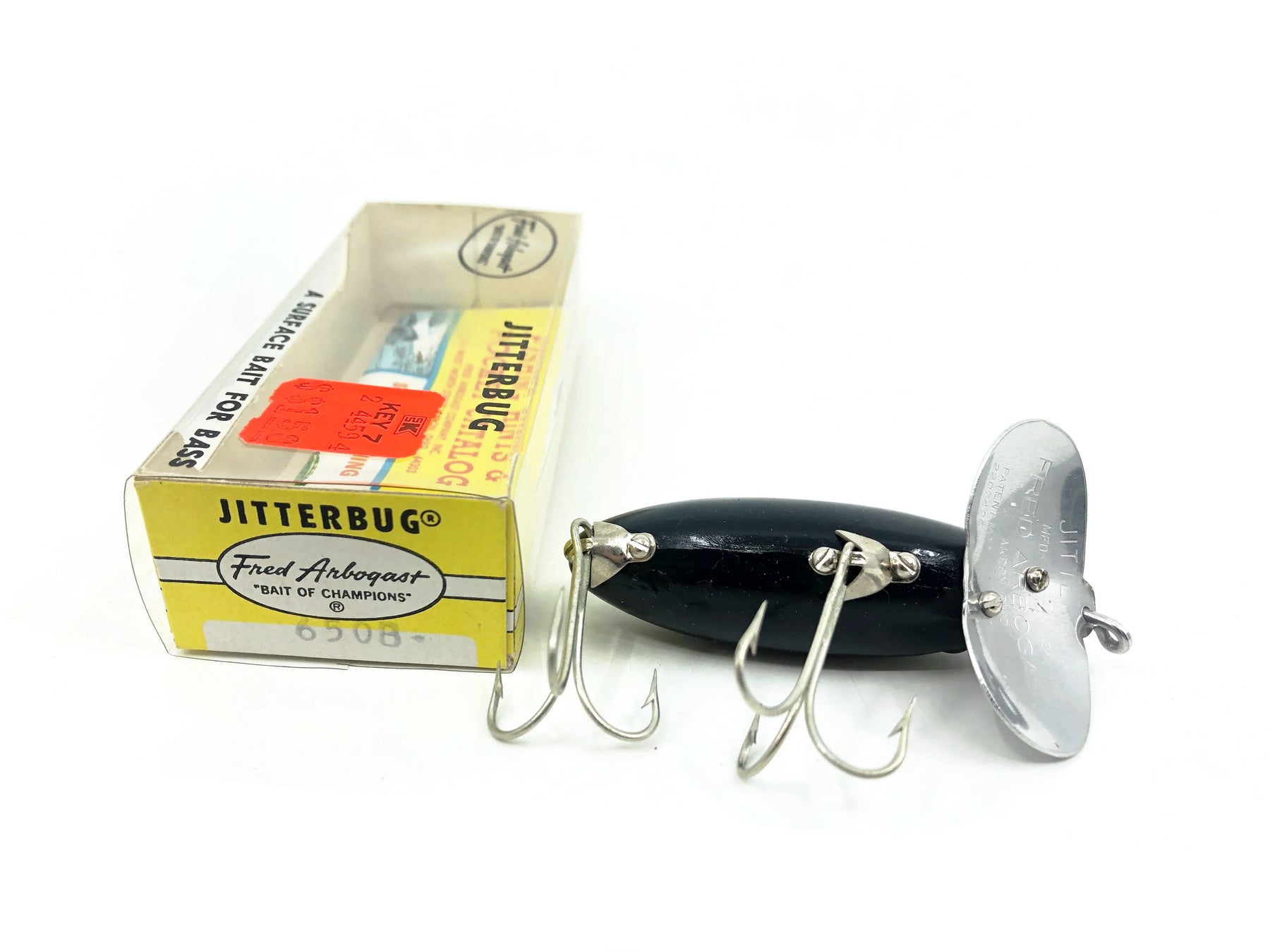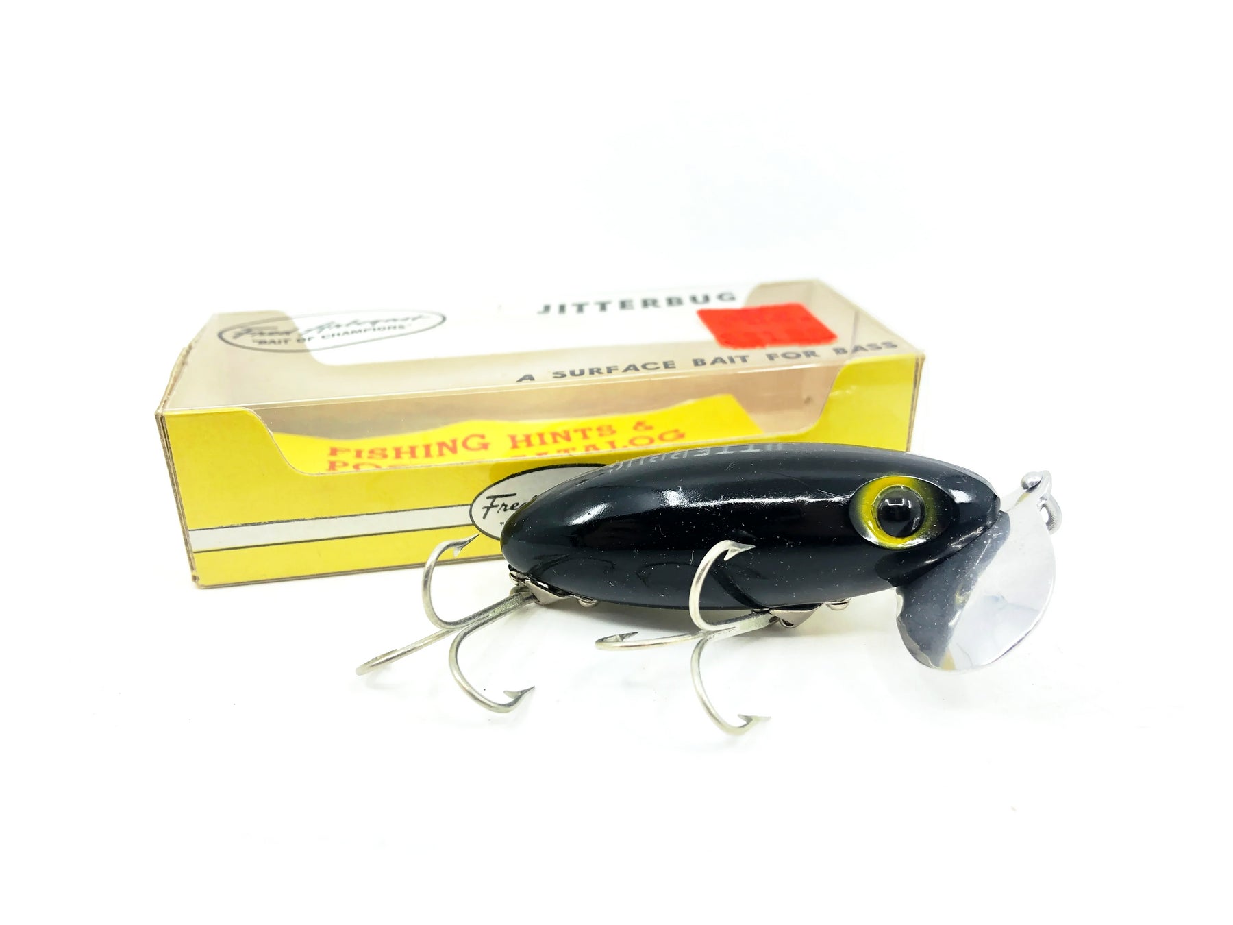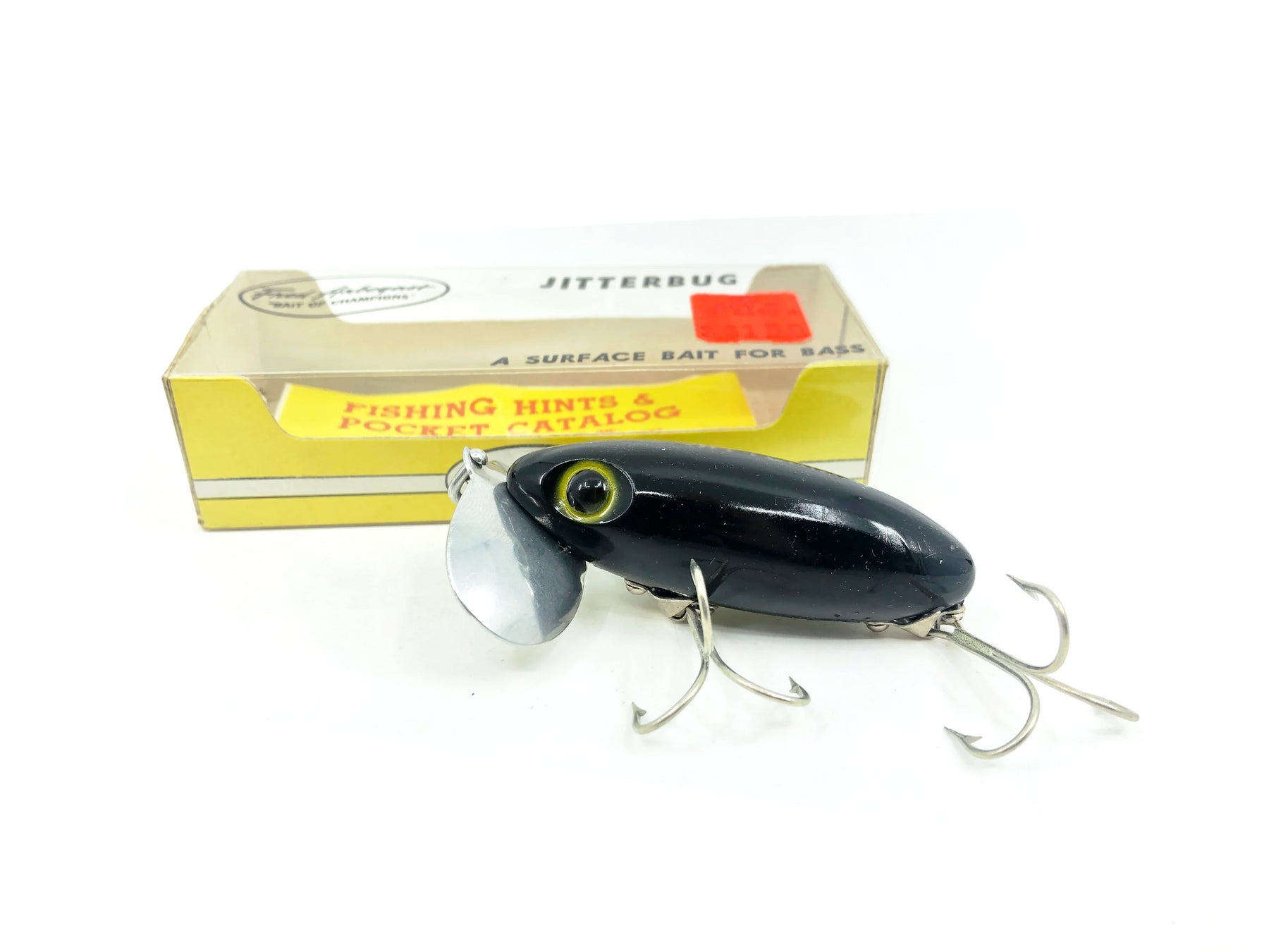 Arbogast Jitterbug 5/8oz, B Black Color with Box, Bugged-Eyed Model. Matching combo with box and pocket catalog. Body is about 2 5/8" long. Bait is in great condition with some minor wear. Box is in great condition as well. Fish or collect this iconic lure, see photos.