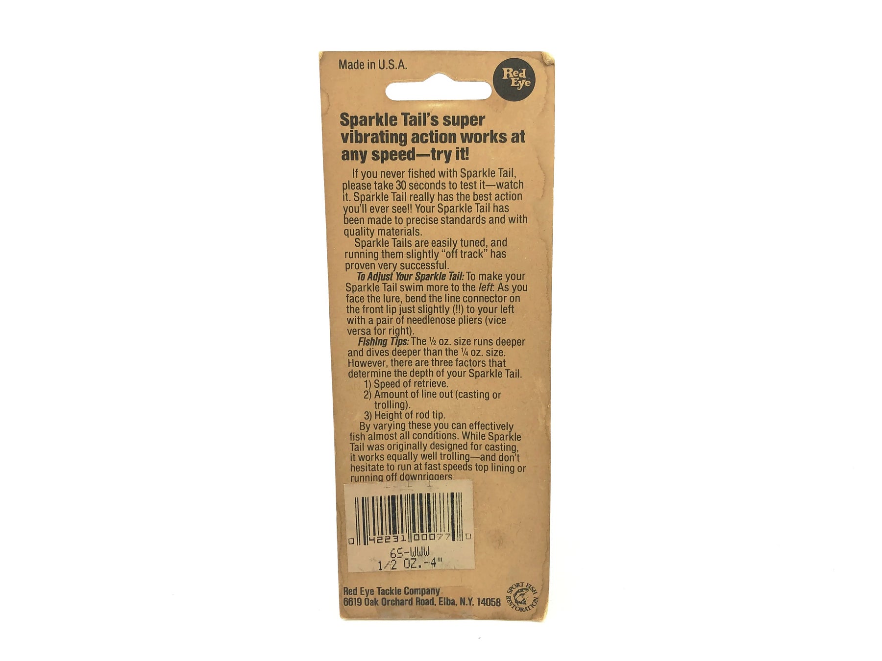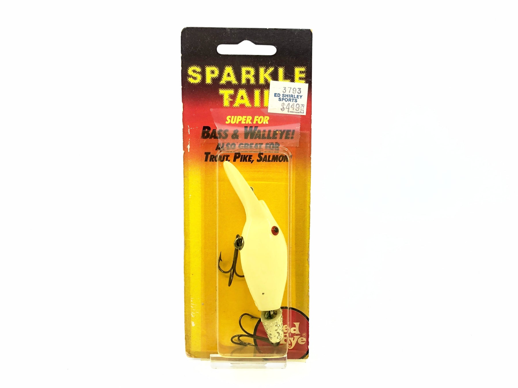 Sparkle Tail, White Color on Card. Great lure here. Awesome for walleye and bass. Great to collect. About 3 3/4" long including lip and weighs 1/2oz. Lure is new on card. The card is taped on and uv staining, see photos. This is a Red Eye Tackle Company sparkle tail.