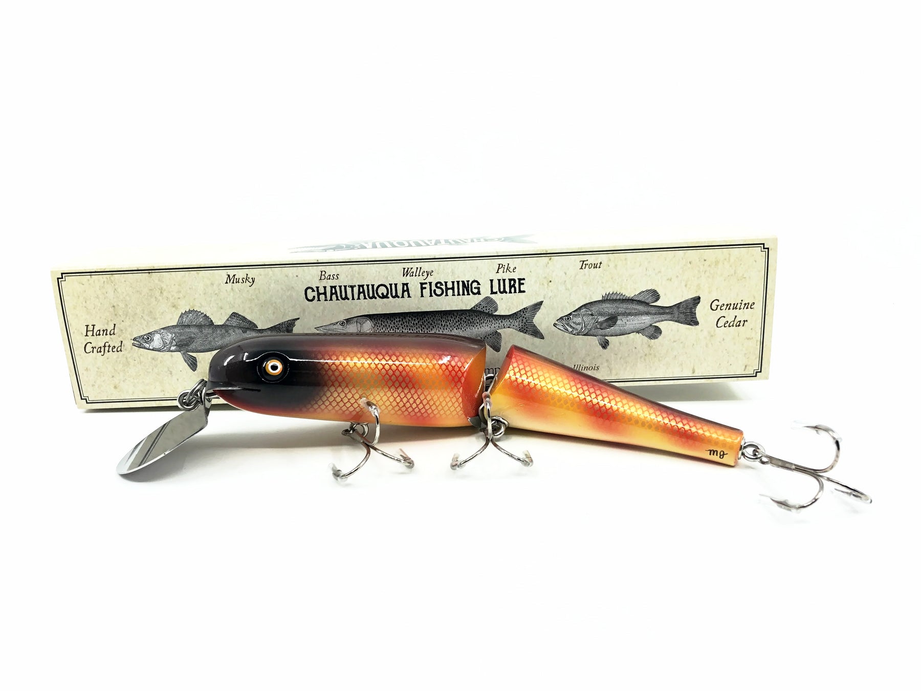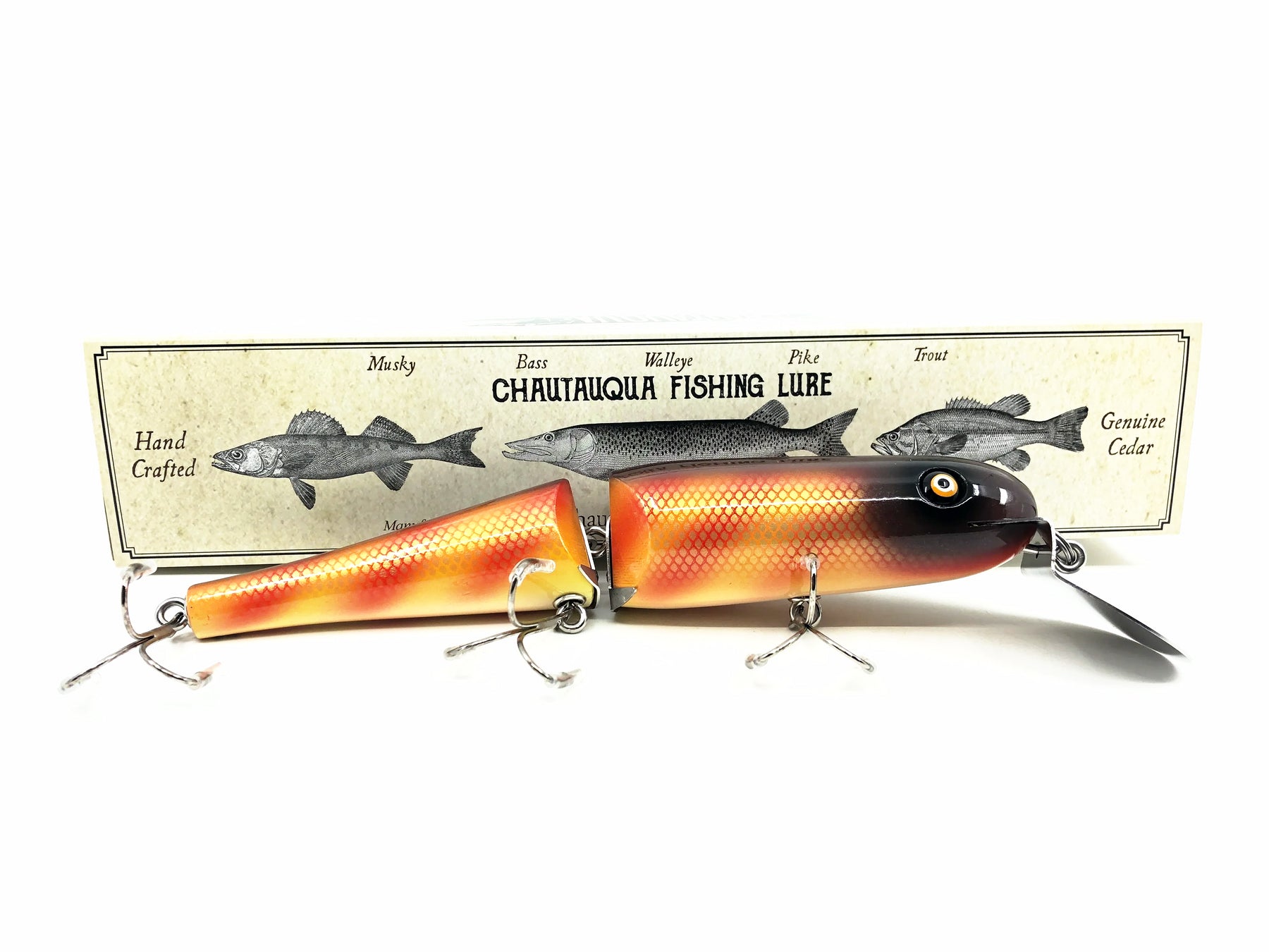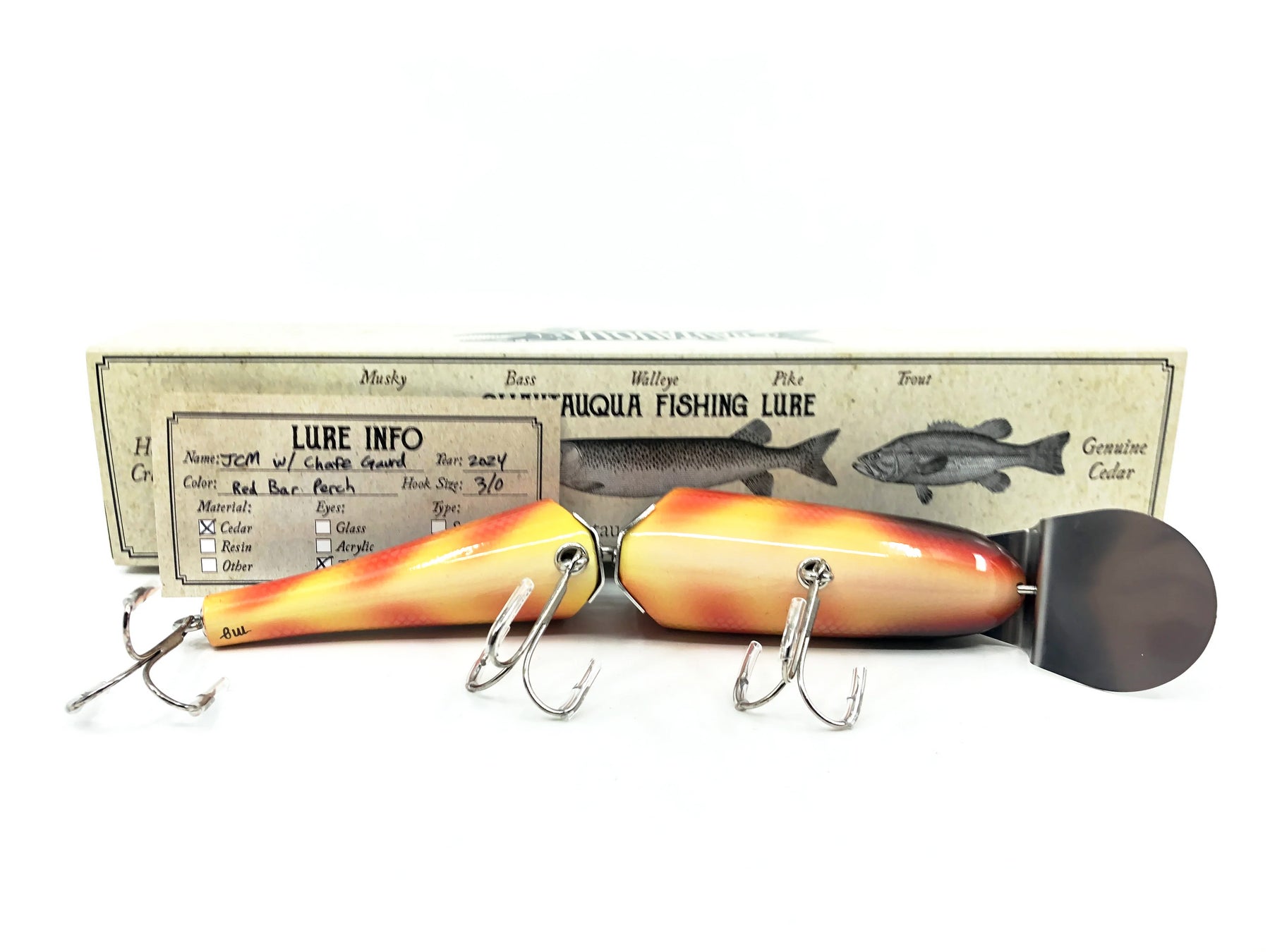 Jointed Chautauqua 8" Minnow w/Chafe Guard, Red Bar Perch Color. Get this very special bait and add to your collection or better yet take fishing! That's what it was made for!