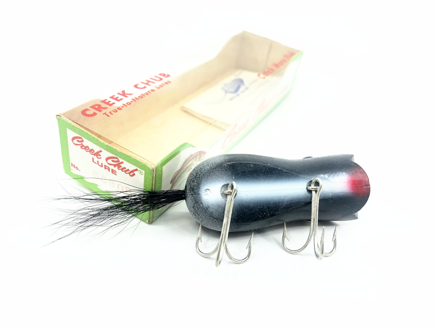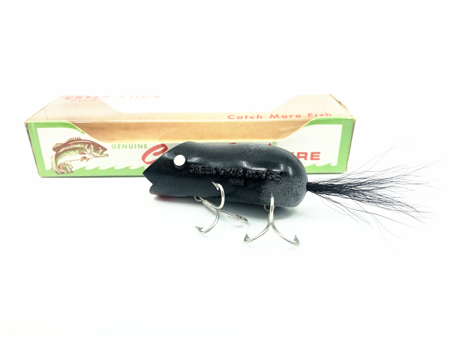 Creek Chub 6580 Mouse, Black Color w/Box. About 2 3/4" long body. Used vintage lure with some wear and waxing as shown but still in overall good condition. Box is in great condition. See photos. Made from 1957-1978 by the Creek Chub Bait Company.