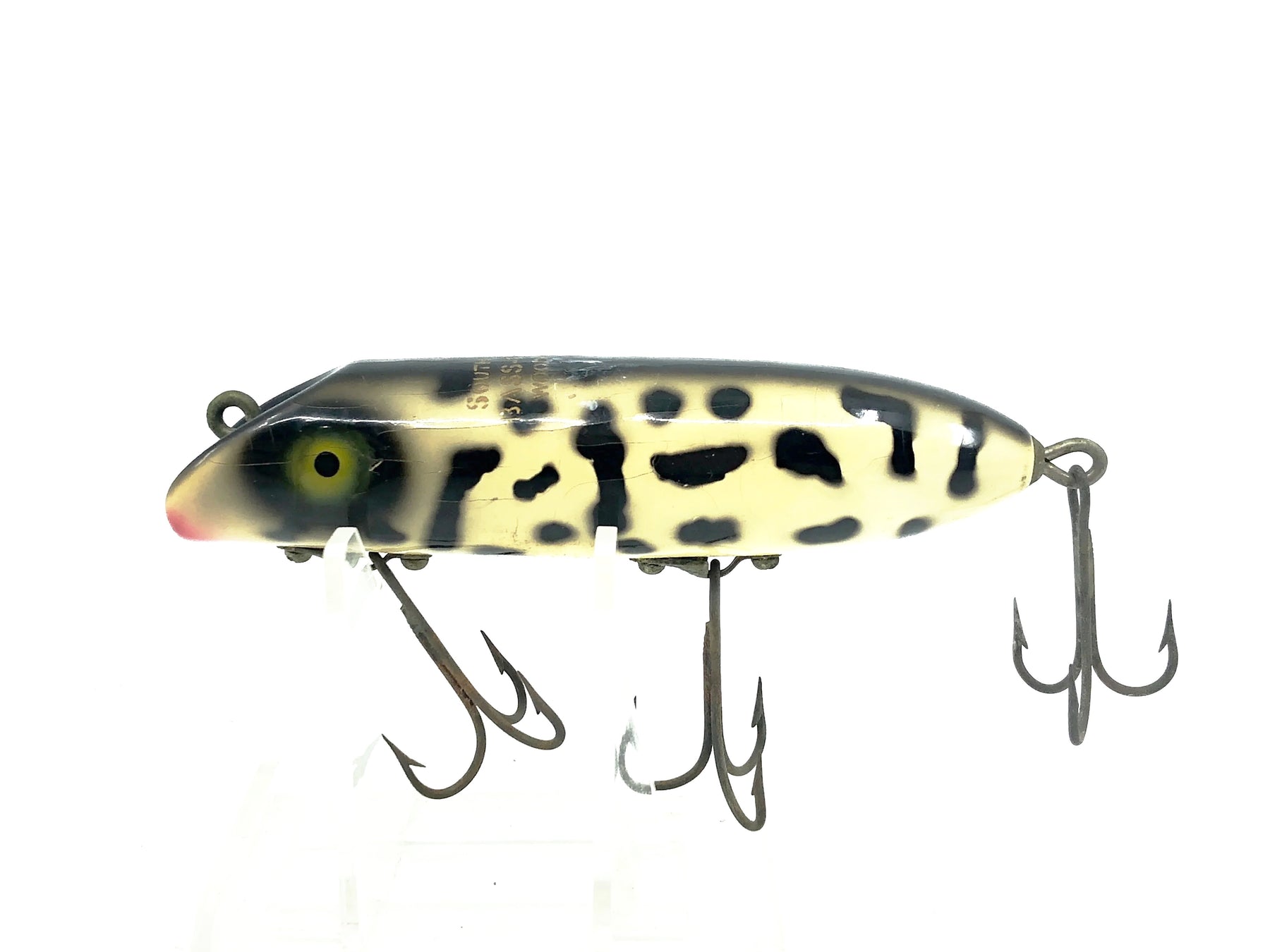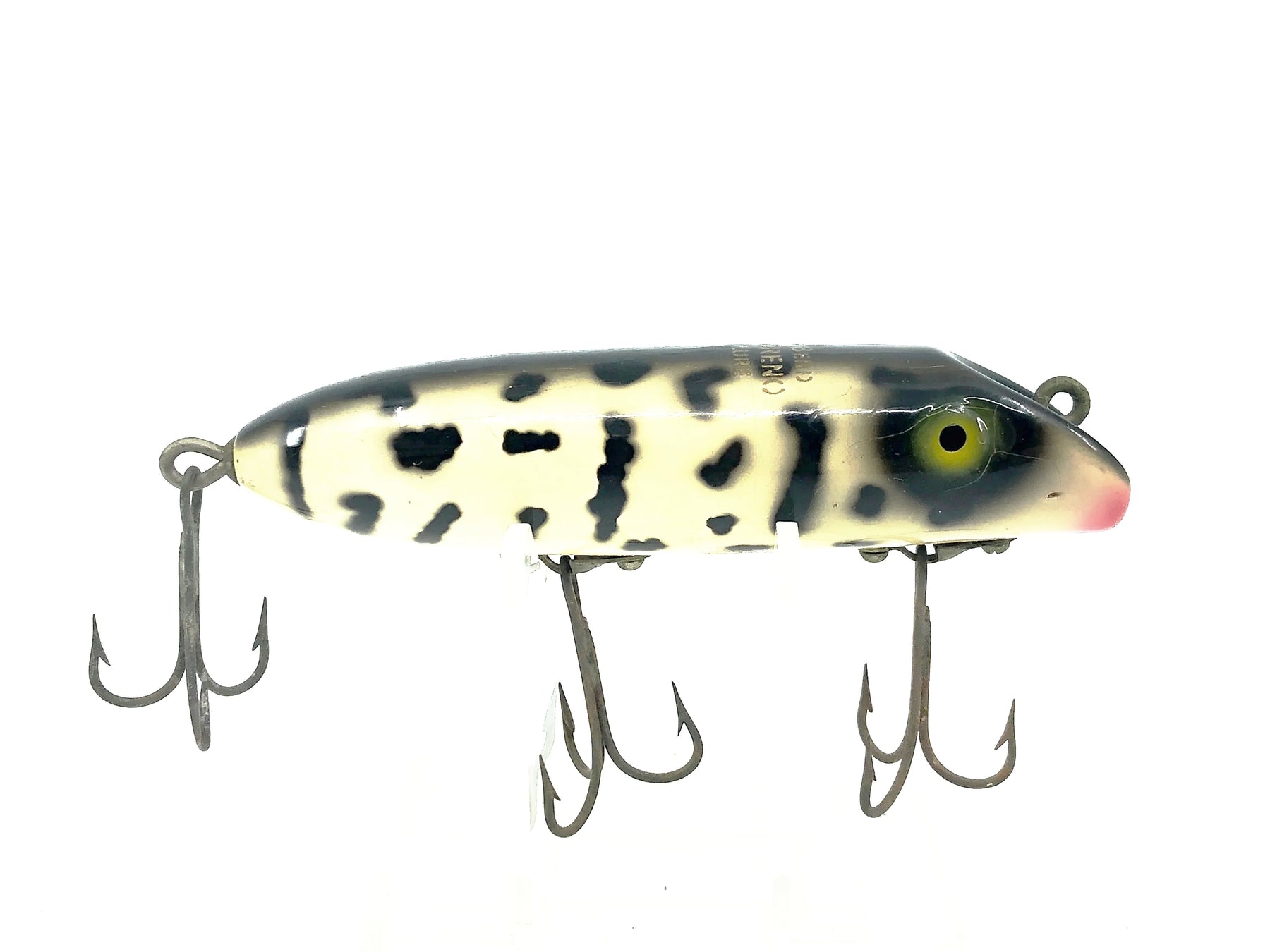South Bend Bass-Oreno, White Coachdog Color-Pressed Eyes. About 3 3/4" long body. Great vintage lure here. Used with some wear but overall in good condition, see photos. Wooden lure, pressed eyes.