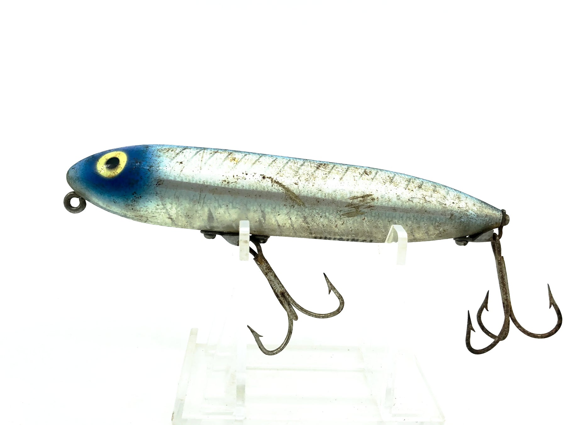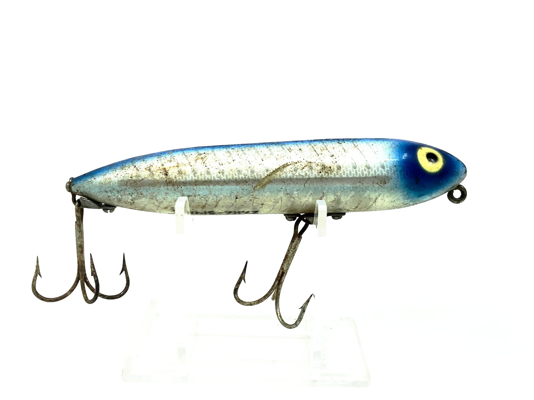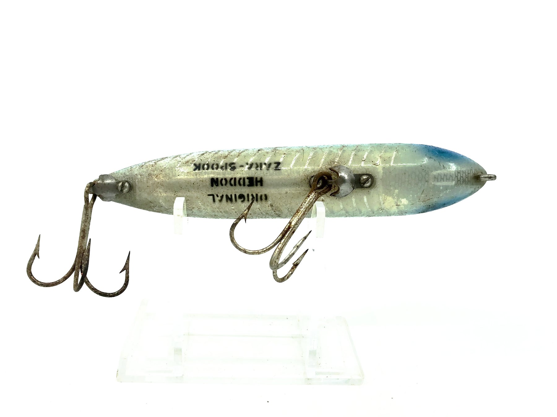 Heddon Original Zara Spook, XBL Blue Shore Minnow Color. About 4 1/4" long. Used with wear and marks but in overall fair condition, see photos. Classic Heddon lure.