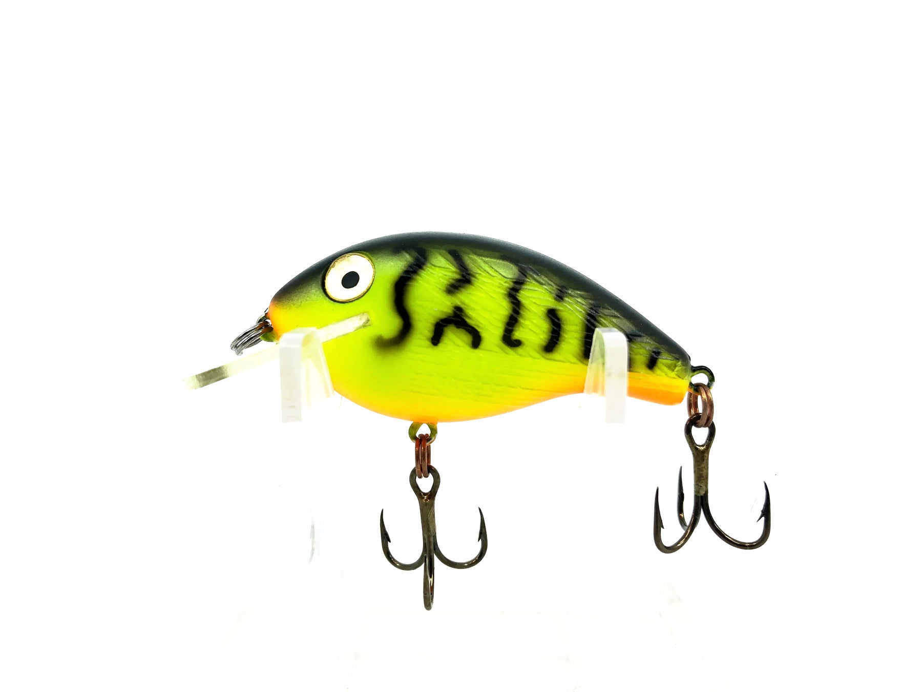 Rebel Wee R, #38 Chartreuse Black Stripes/Orange Belly Color. About 2" long body excluding lip. This bait is used but appears to have never been fished before and is in overall great condition. Get this vintage Rebel while it lasts.
