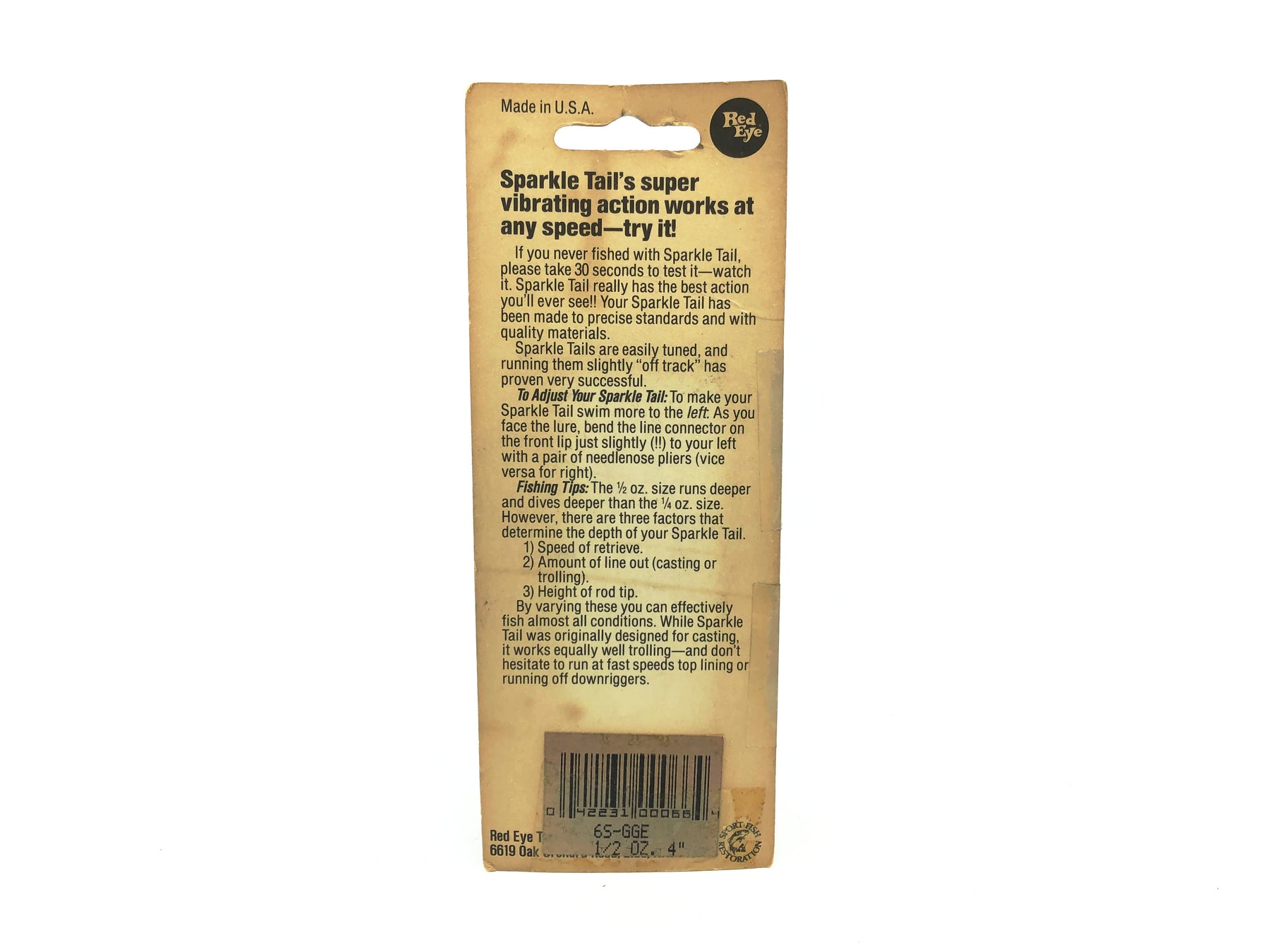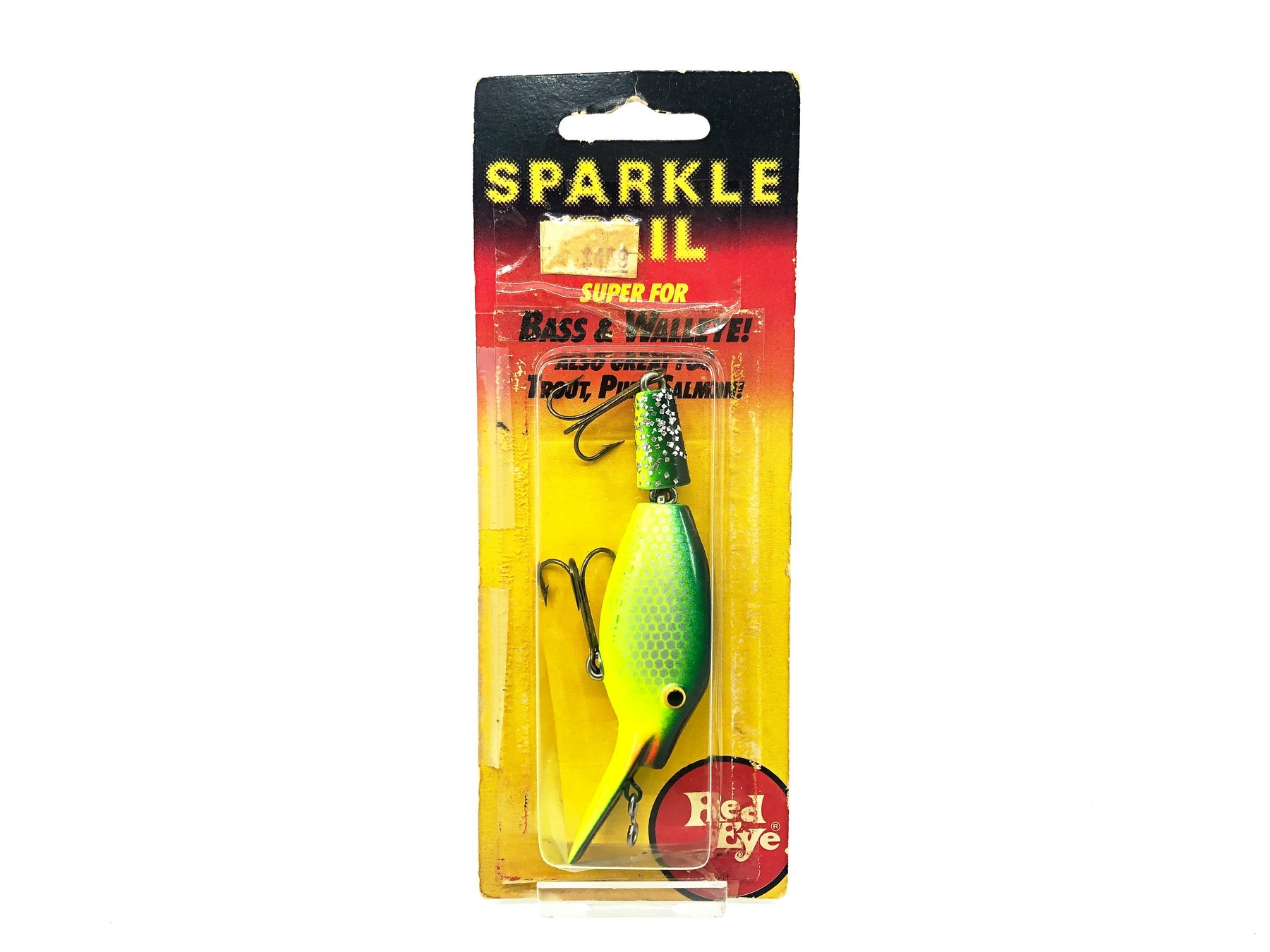 Sparkle Tail, Parrot Color on Card. Great lure here. Awesome for walleye and bass. Great to collect. About 3 3/4" long and weighs 1/2oz. Lure is new on card. The card is taped on and uv staining, see photos. This is a Red Eye Tackle Company sparkle tail.