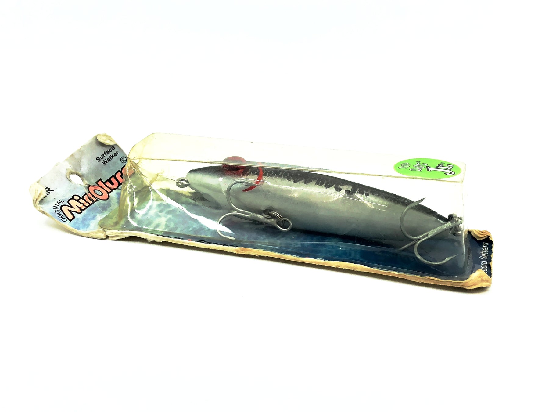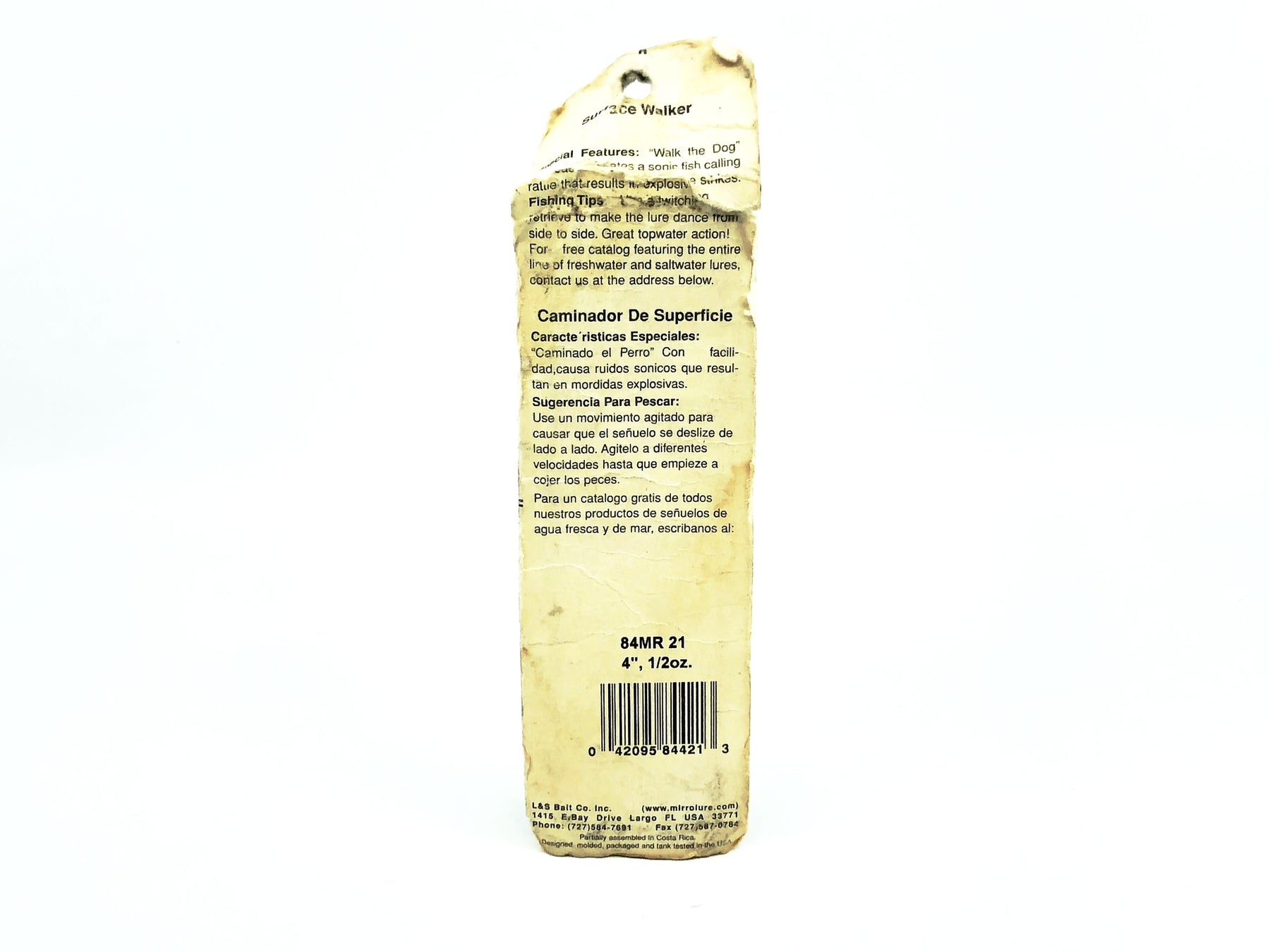 L & S Top Dog Jr., 84MR-21 White/Black Back Color on Card. Great topwater bait from Original Mirrolure. This bait is new on card. The card has some wear and damage but still in ok condition. See photos.