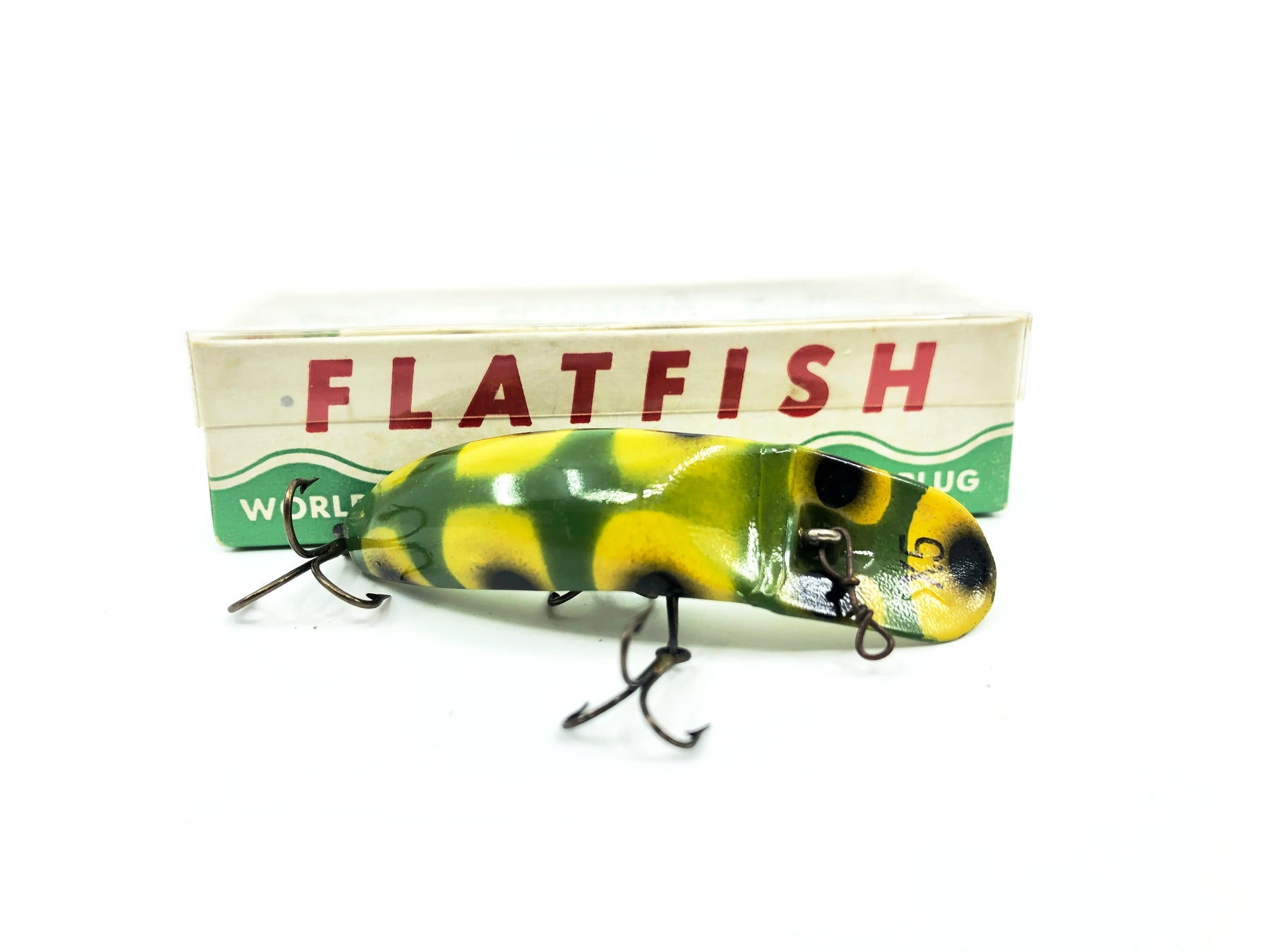 Vintage Helin Flatfish X5, Frog Color with Box. Lure is about 3" long. Lure has some dirt and marks from storage. Matching box has some wear but is in overall good condition. See photos.