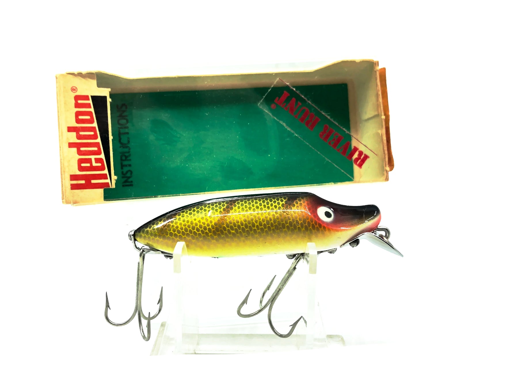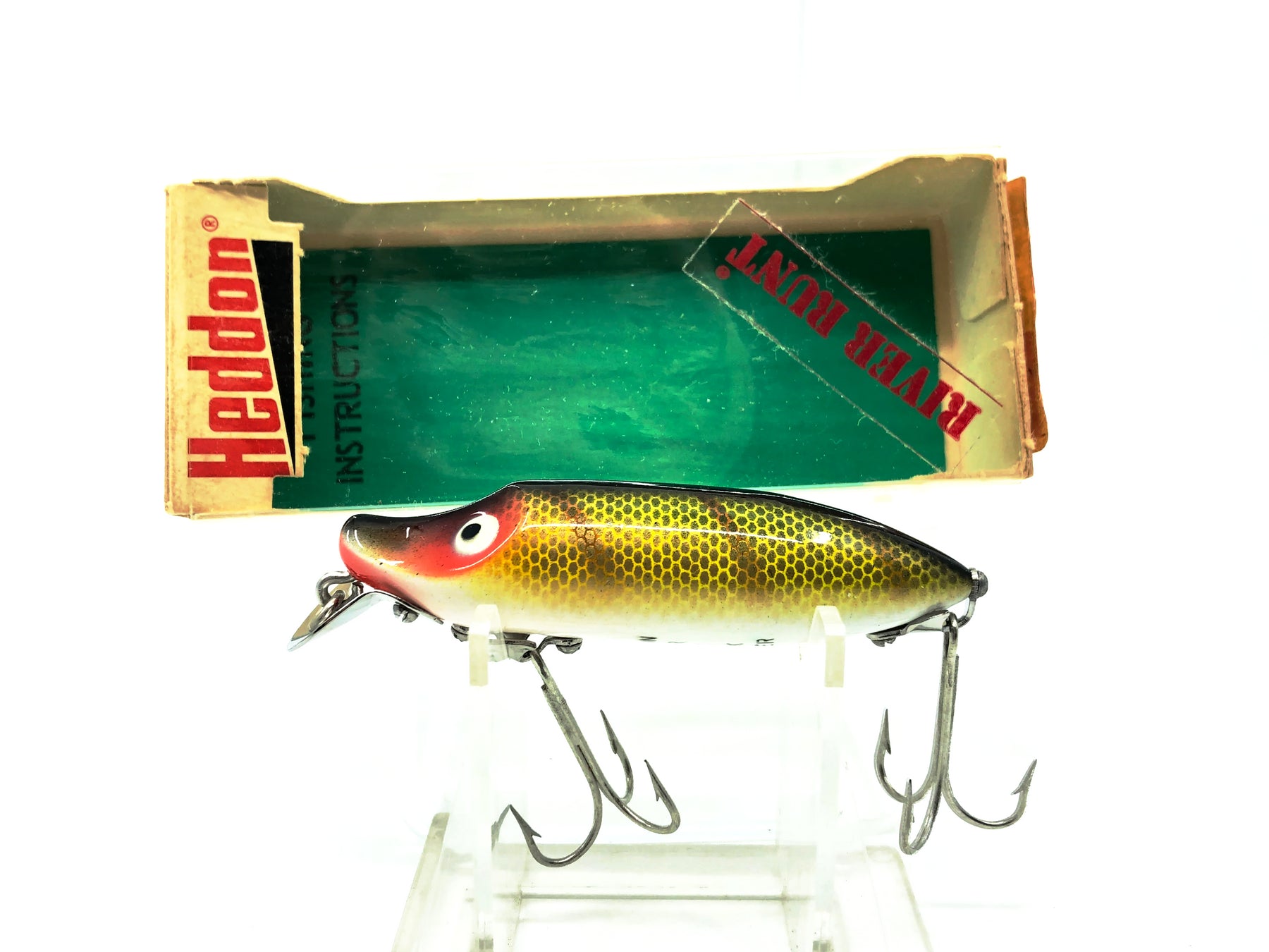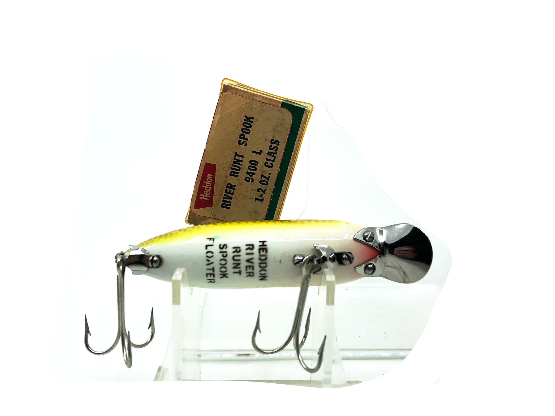 Heddon River Runt Spook Floater 9400, L Perch Color w/Box. Amazing condition combo with this vintage runt in new like condition. Lure is about 3" long. Box has some minor wear but is still in overall good condition. One of the most iconic fishing lures of all time. Collect or fish you can't go wrong with a Heddon River Runt.