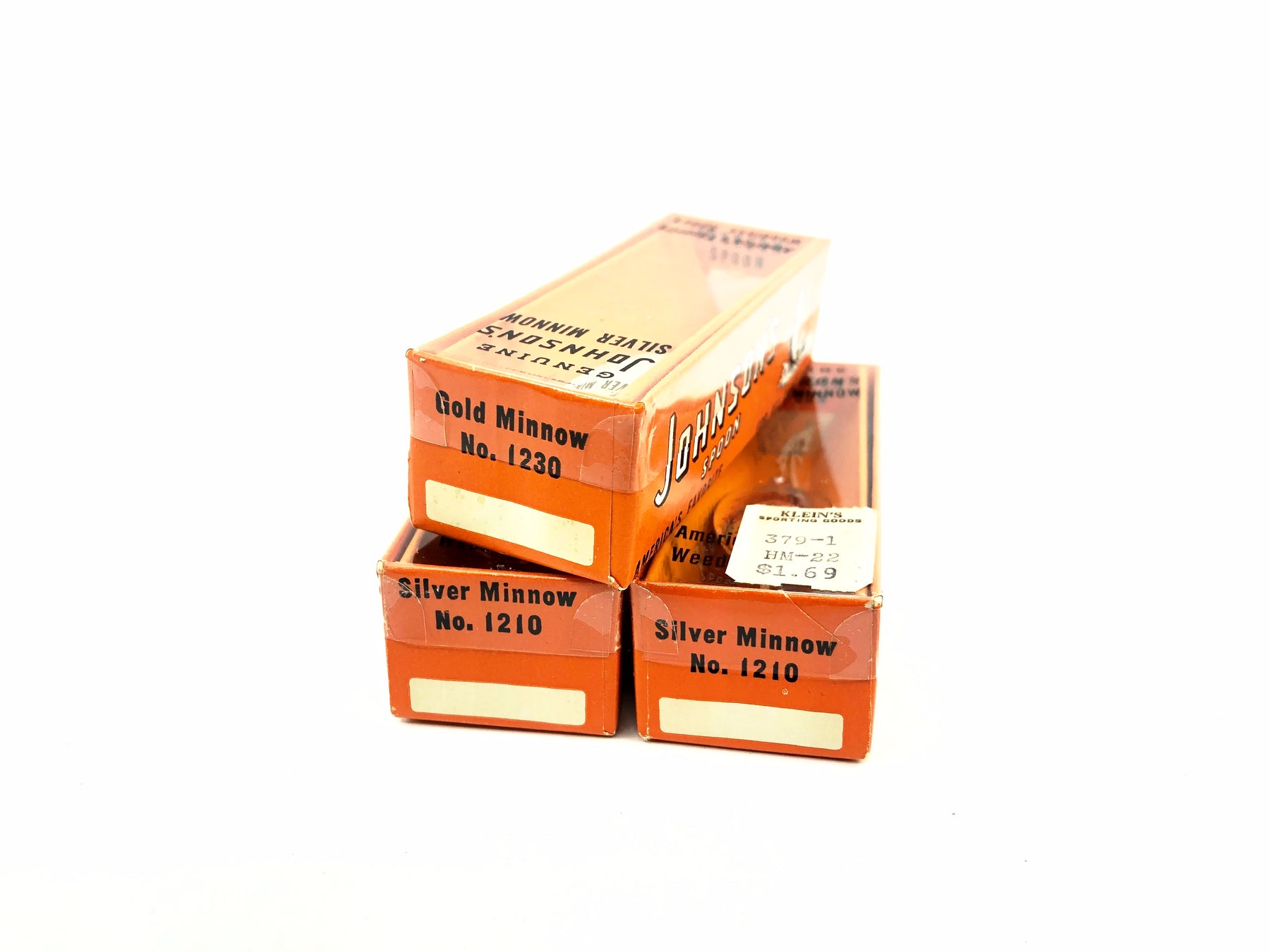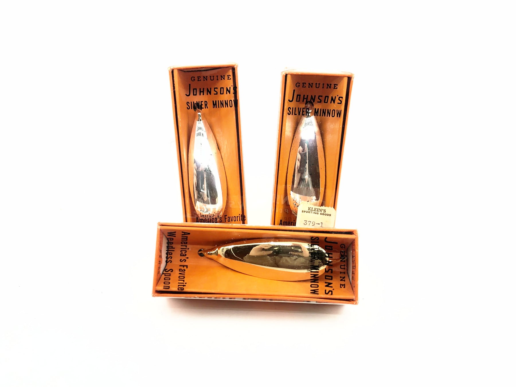 Johnson's Silver Minnow Trio Pack. This pack includes two no.1210 and one no.1230 new in box These vintage spoons are about 2 1/2" long overall. Lures are sealed in the cardboard fold, however the baits have some minor wear from age, overall these baits are in overall very good condition. See photos. Fish or collect. Great vintage lure here.
