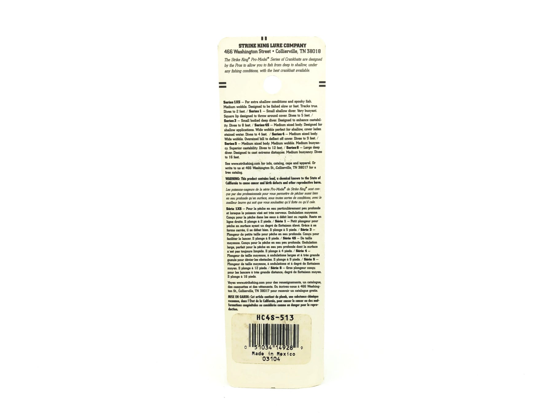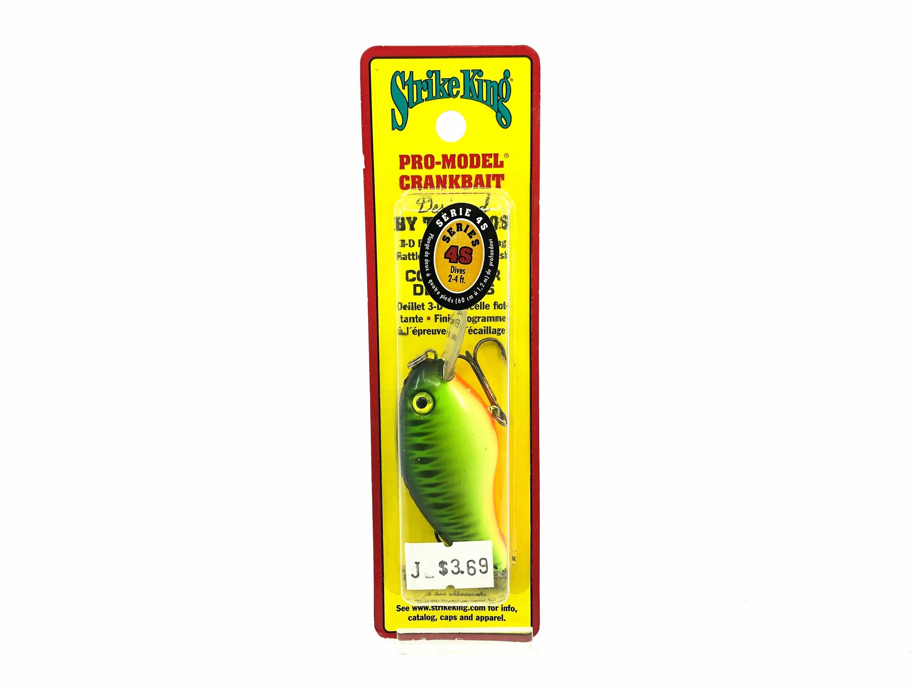 Strike King Pro Model Series 4S Shallow Crankbait, #513 Fire Tiger Color on Card. This bait is new on card and the card in in good condition. Lure is about 2 1/2" long excluding the lip. See photos.
