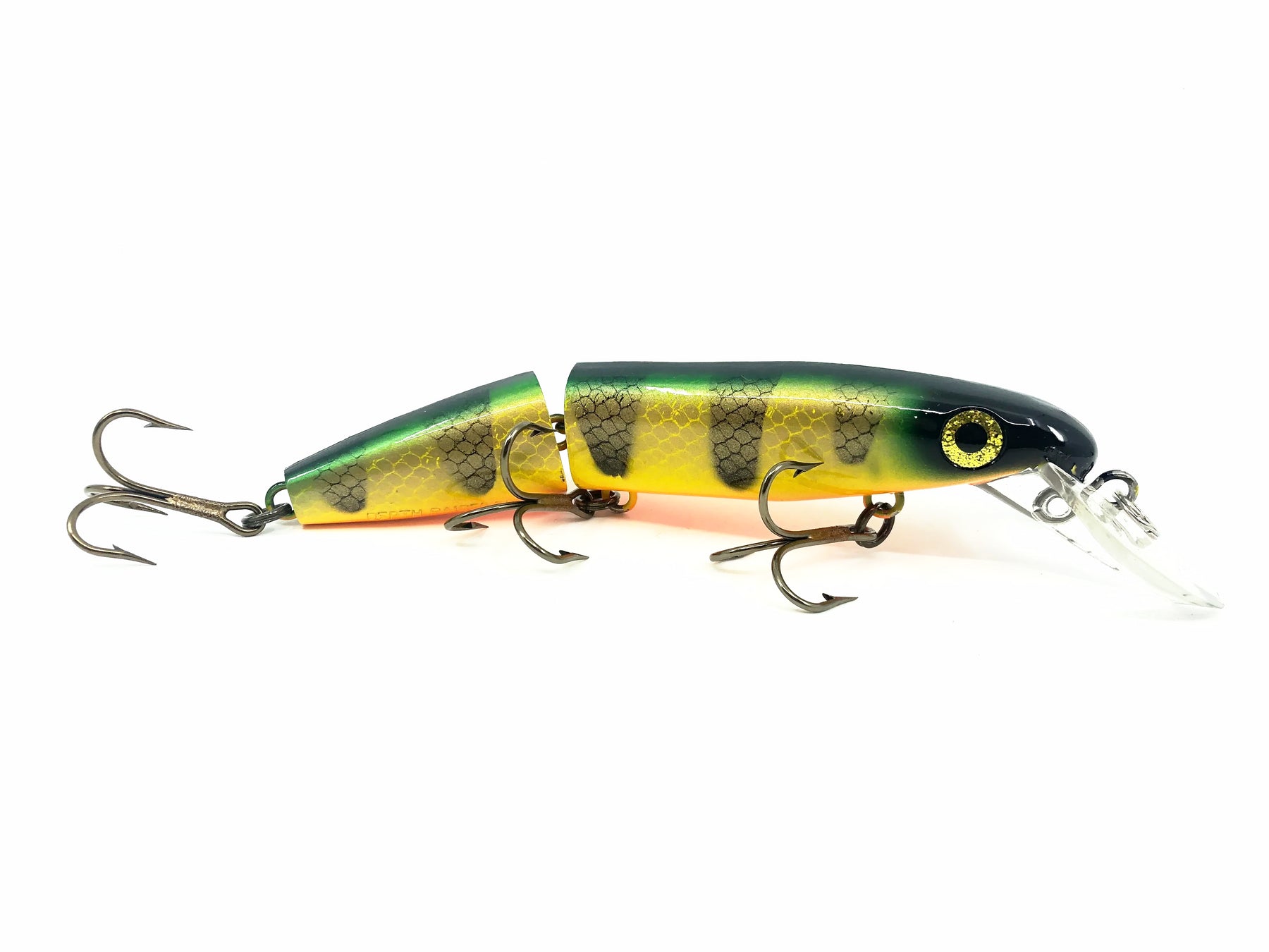 Joe Bucher Tackle Co. Buchertail Jointed Depth Raider 8", Perch Color. Classic Wisconsin lure brand here. About 8" long including lip, 7" body. This bait is used but appears to have never been fished before and is in overall great condition.