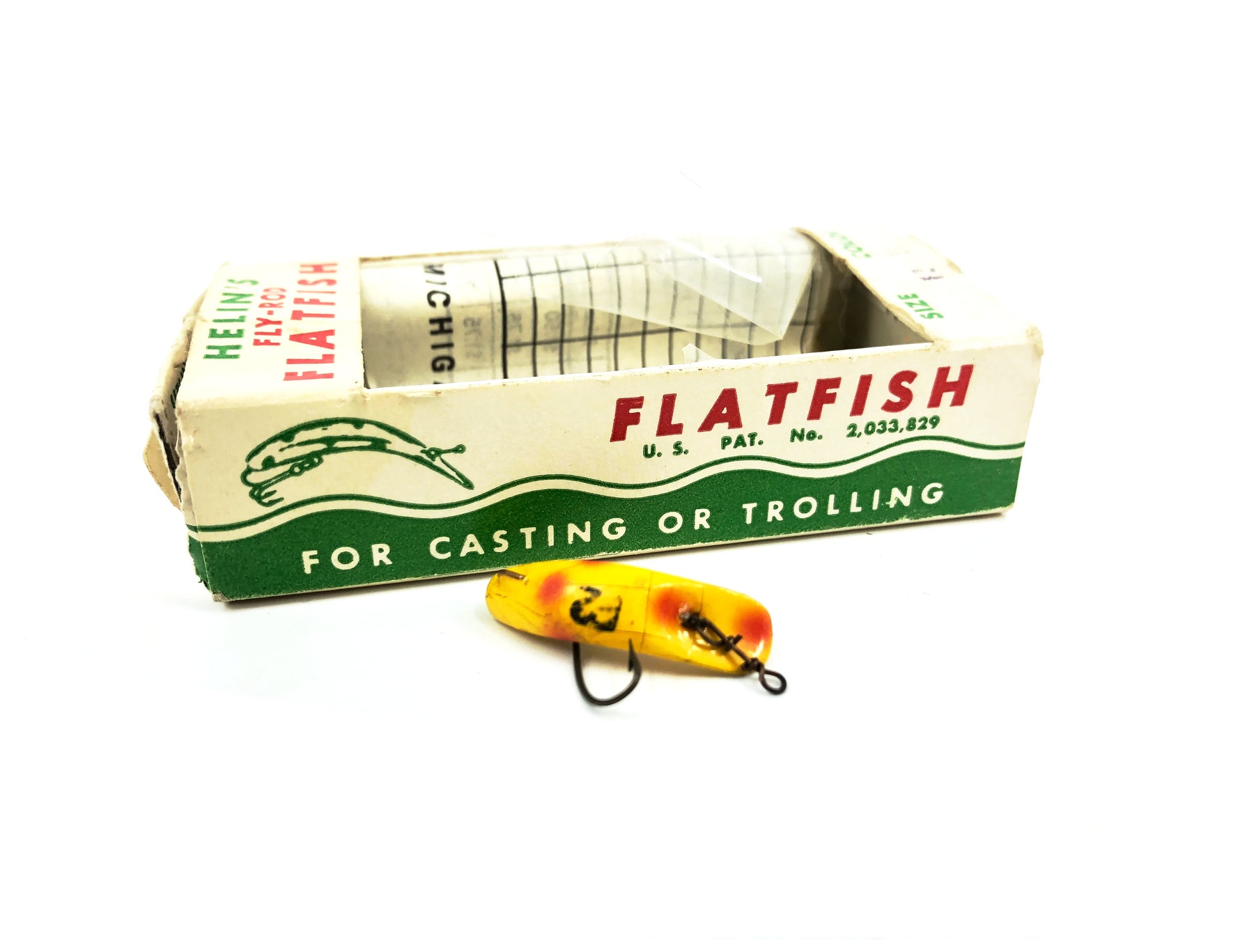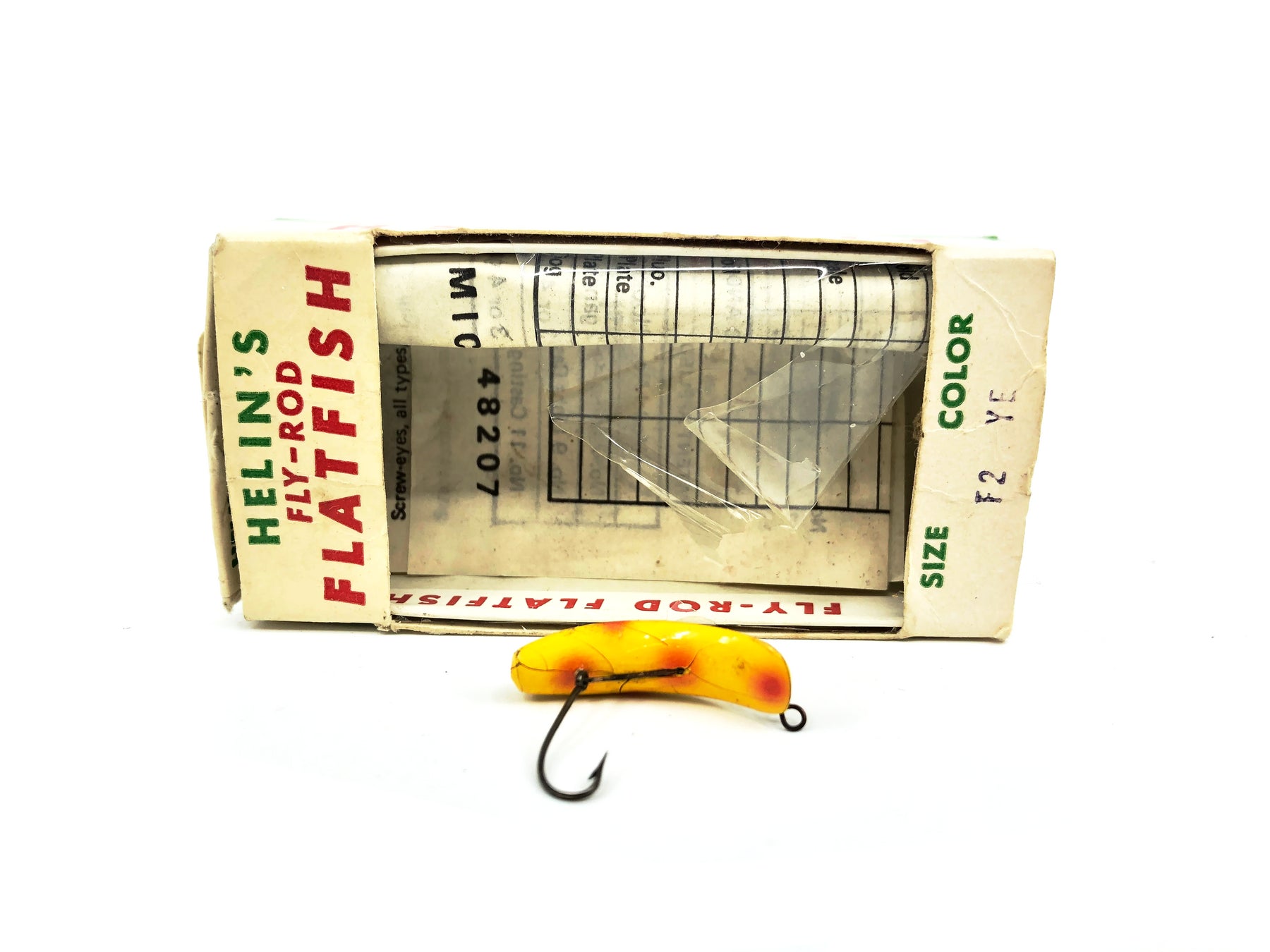 Vintage Helin Flatfish F2, YE Yellow with Box. Lure is about 1" long. Lure has some minor wear from storage but in overall good condition. Matching box is in pretty good condition as well aside from the bubble being cracked open. See photos.