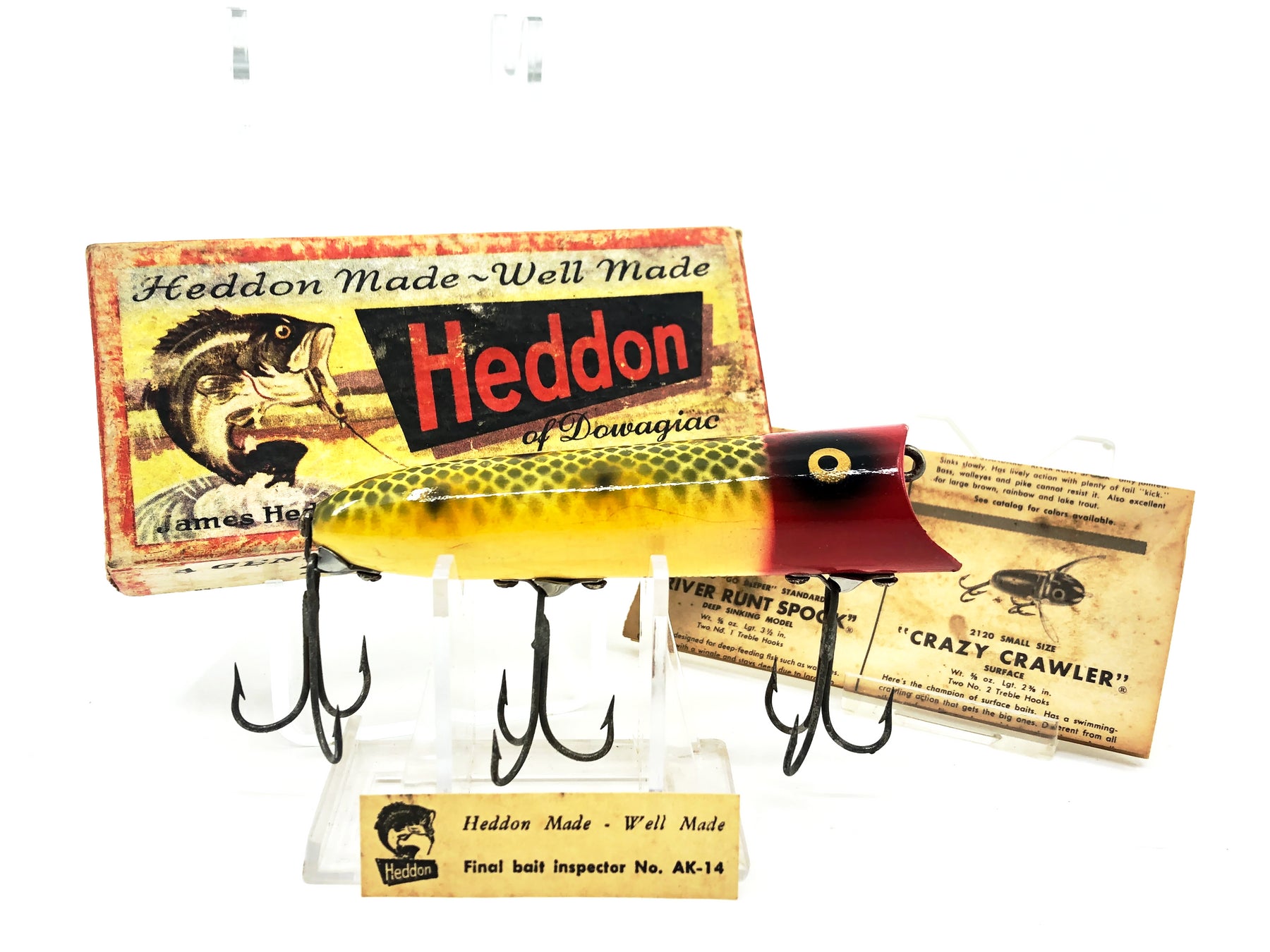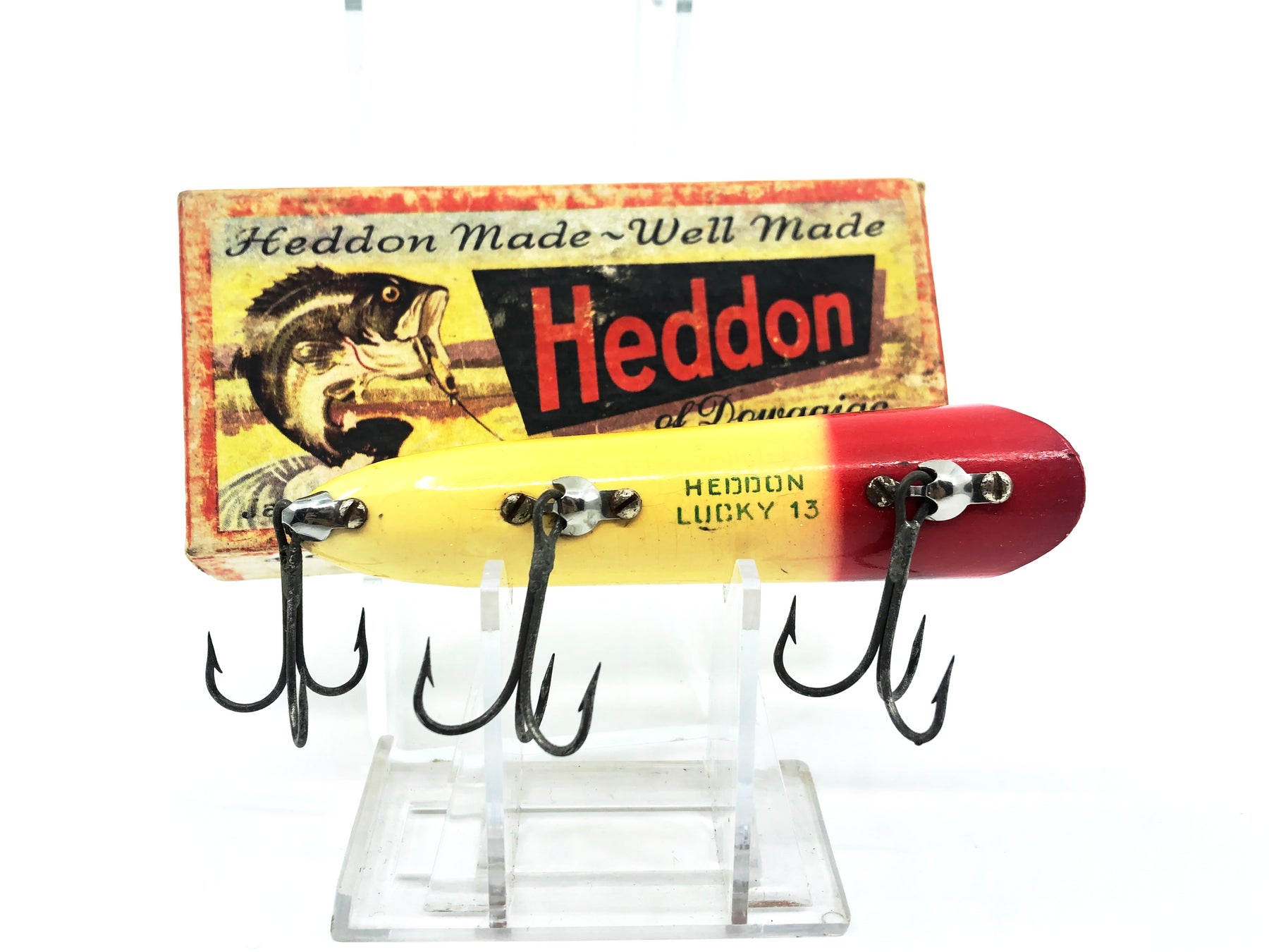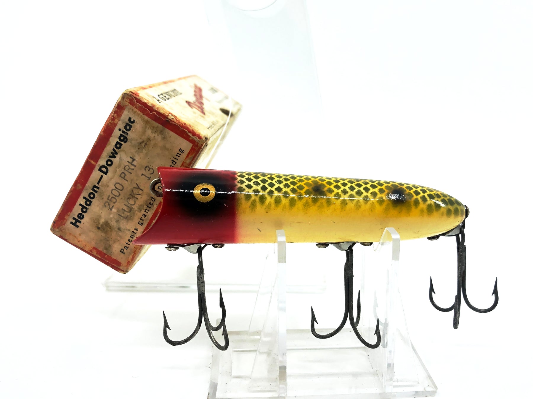 Heddon Lucky 13, JRH Red Head Frog Scale Color with Box. Great wooden Heddon lure here with box, paperwork and inspection slip. Box is for a lucky 13 in PRH. About 4" long. Box in good condition with some minor wear. Lure has some minor wear but overall it is in very good condition. Great combo to grab here. See photos.