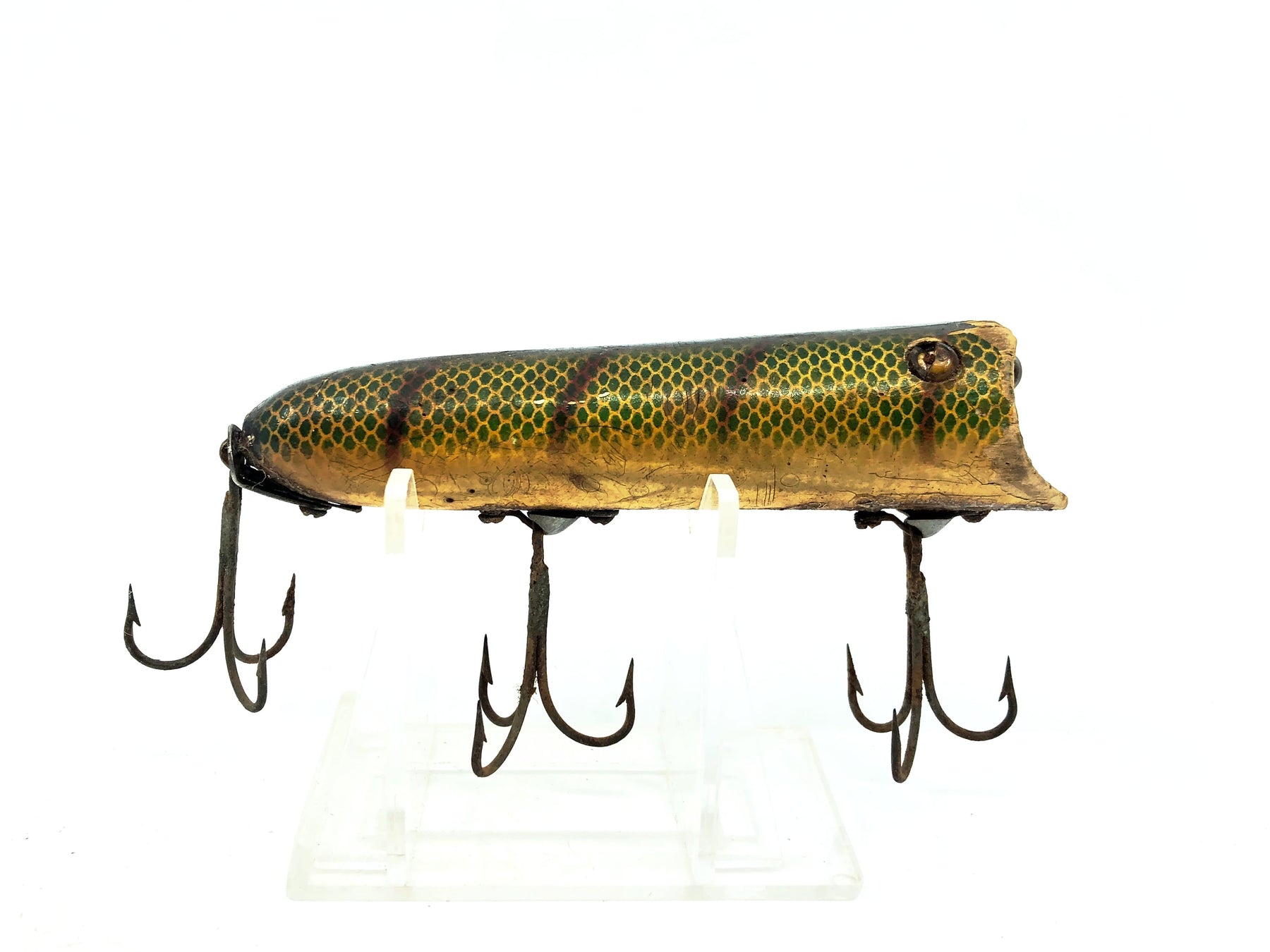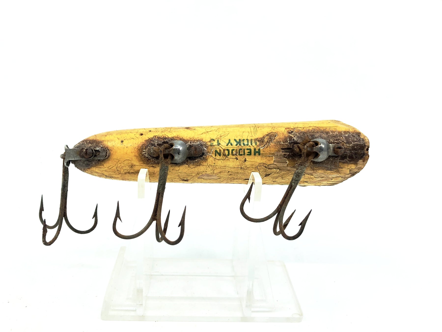 Wooden Heddon Lucky 13, L Perch Color.  About 3 3/4" long.  Used with considerable wear as shown but still in ok condition. Older glass eye/nail eye model. Despite its wear this is still a nice piece for your collection or tackle box.  See photos.