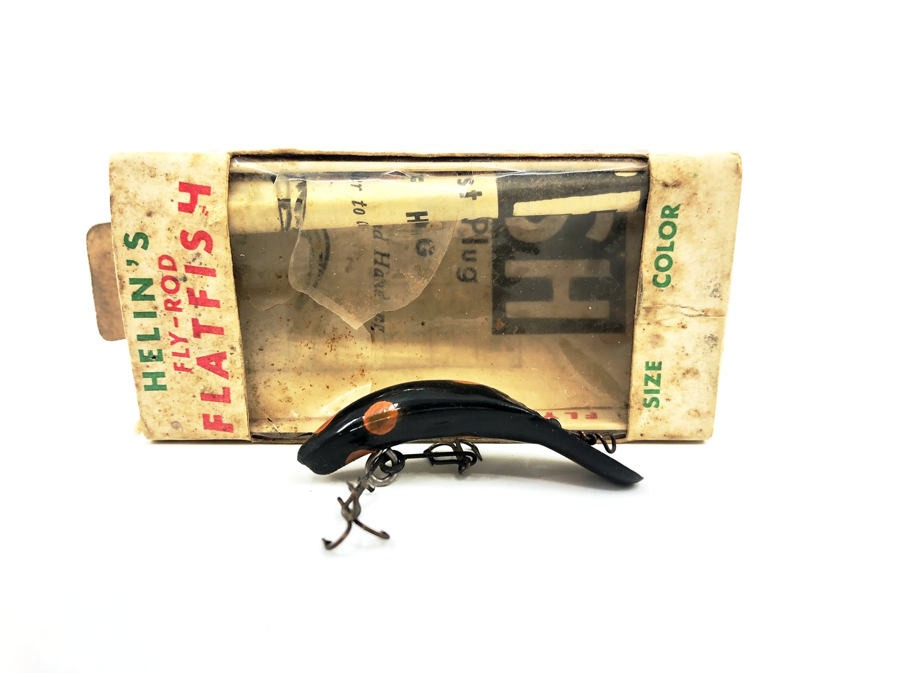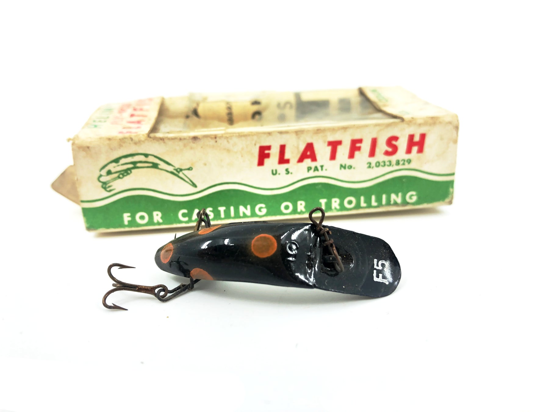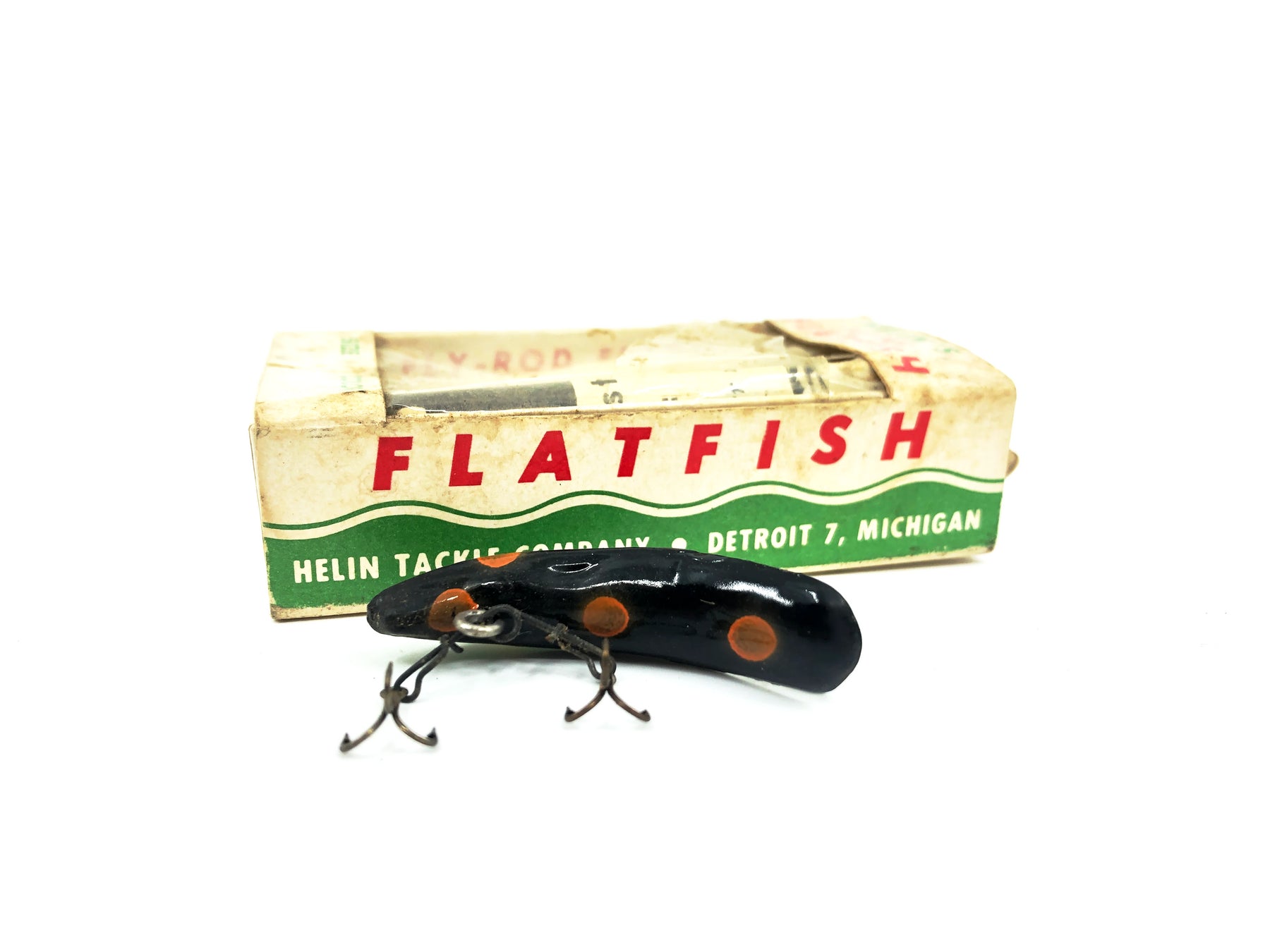 Vintage Helin Flatfish F5, BL Black/Orange Spots Color with Box. Lure is about 1 3/4" long. Lure has some minor wear from storage but in overall good condition. Matching box is in pretty good condition as well aside from the bubble being cracked open. See photos.