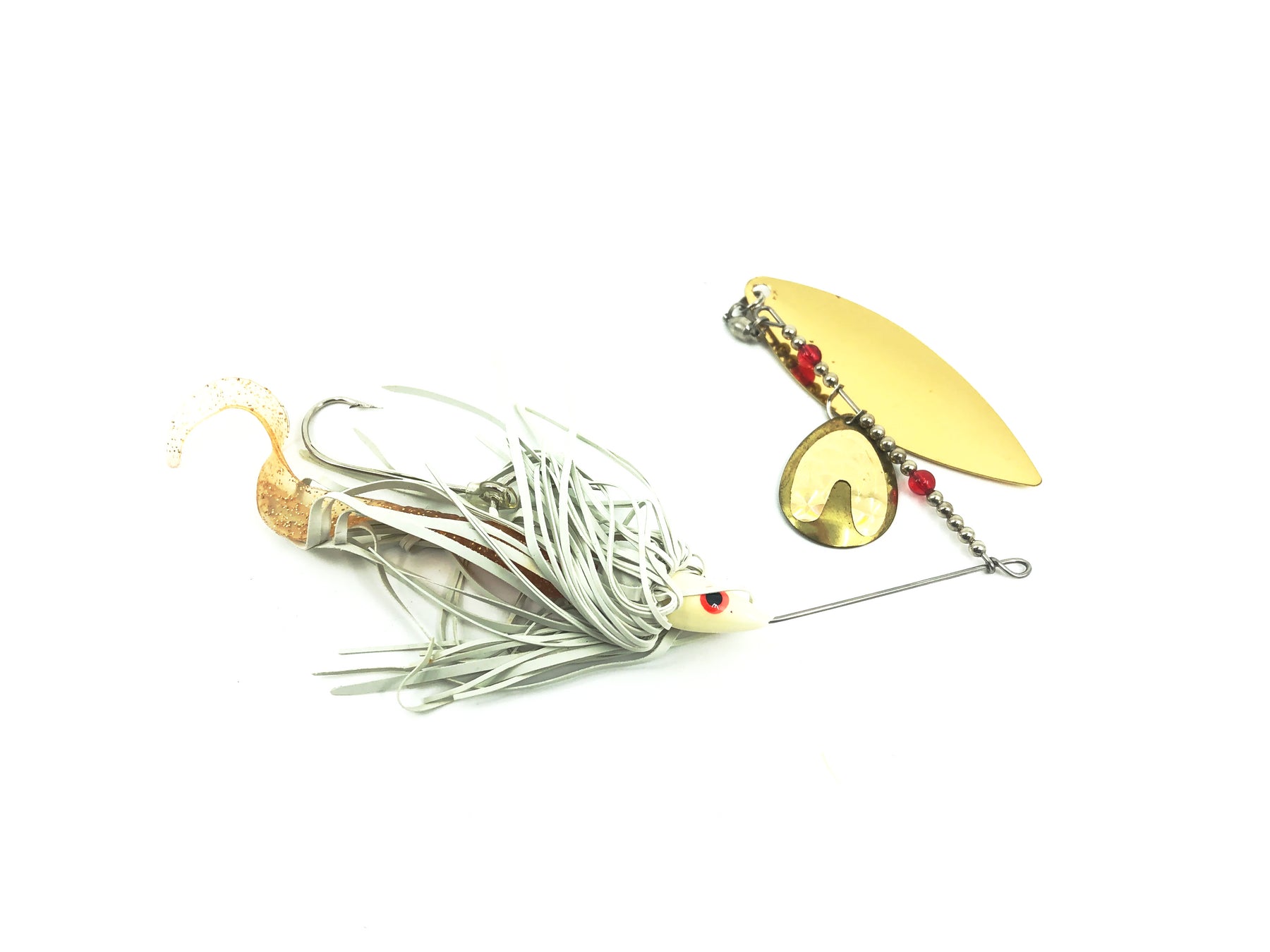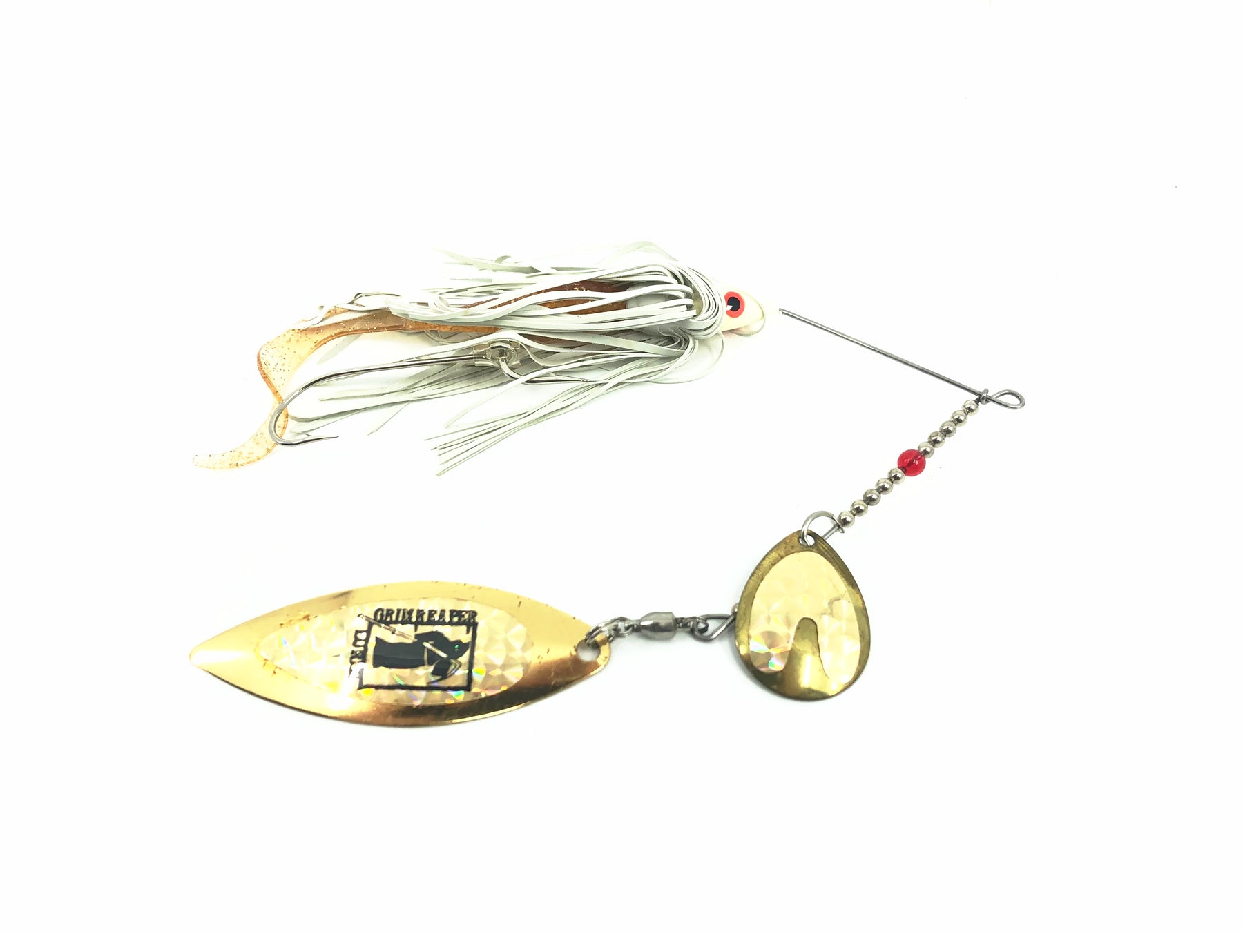 Grim Reaper 1 Ounce Tandem Spinner, White Body/Gold Blade & Tail. About 6" long in total. Older version of this model here. Lure weighs a little over 1oz. This bait is used with some minor wear but in overall great condition. See photos.