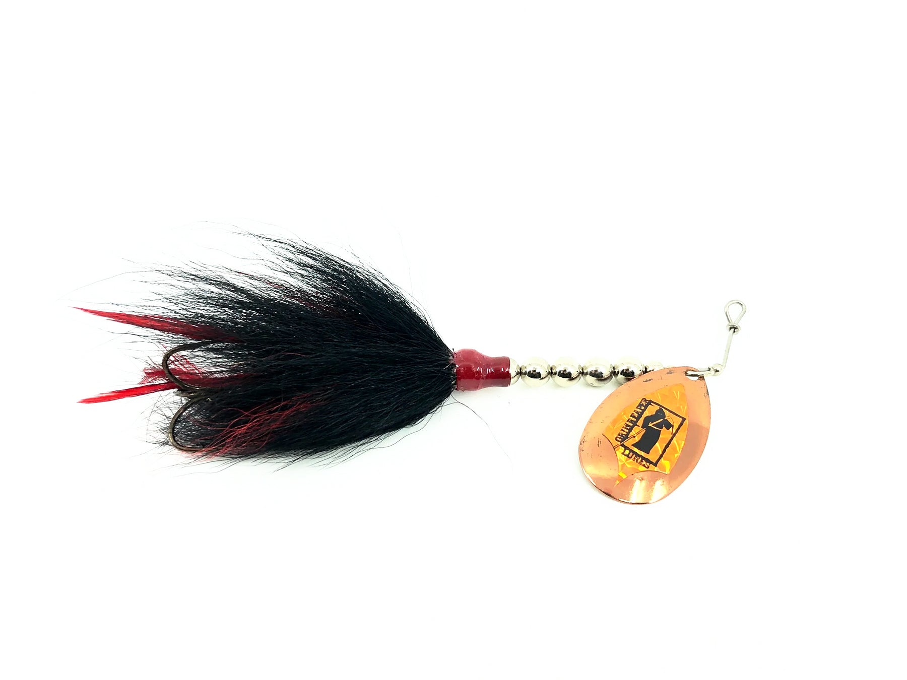 Grim Reaper Bucktail Spinner 9/10oz, Copper Blade/Orange & Black Bucktail. Unsure of the exact model of this Reaper Spinner since it's been discontinued for quite some time. Lure is about 5 3/4" long in total. This bait is used with some minor wear but in overall great condition. See photos.