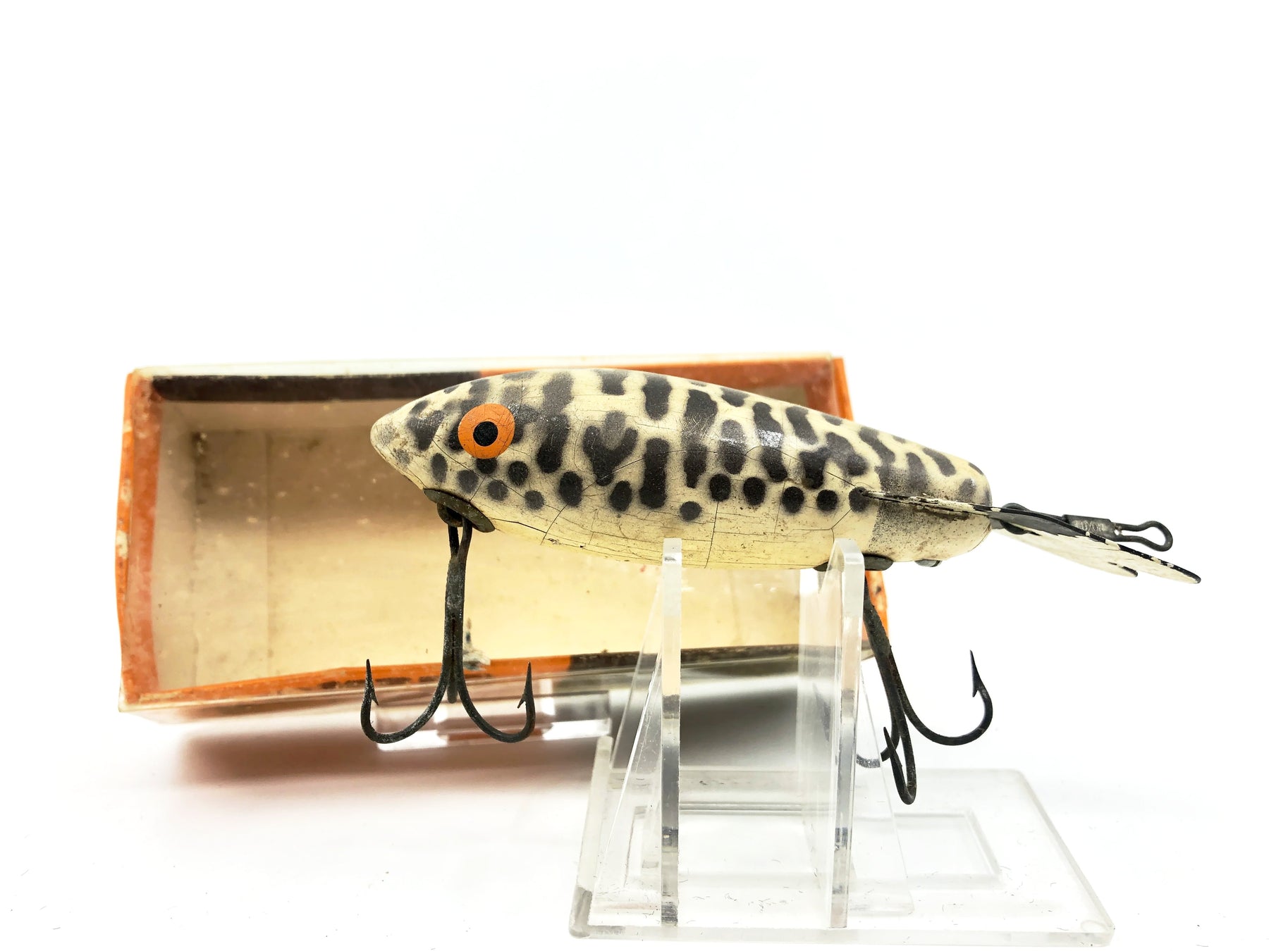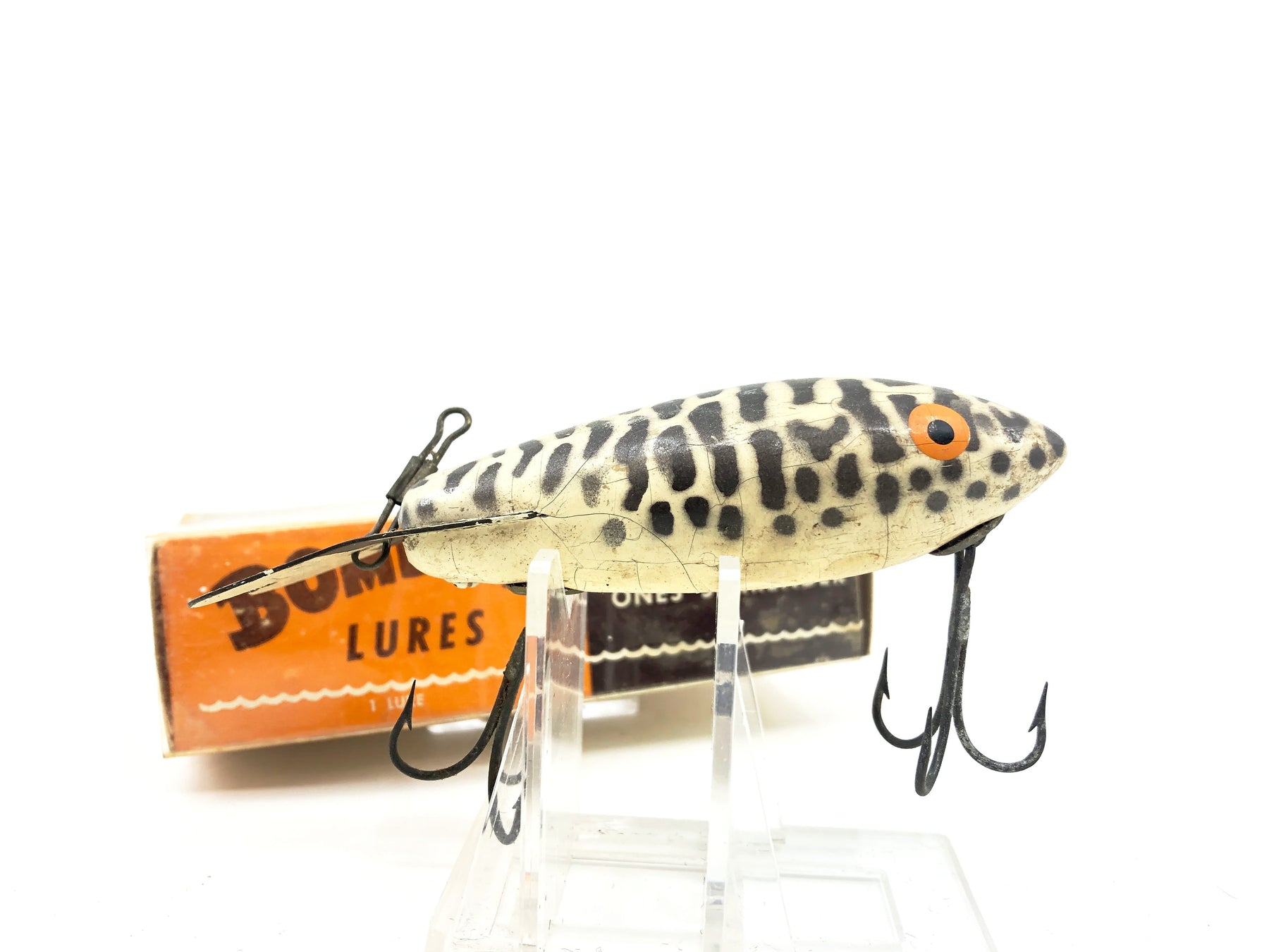 Wooden Bomber 600 Series, #55 Coachdog Color with Box. About 4" long.  Lure is used with some wear and missing paint but overall in good condition, see photos. Box is for a 500 series Bomber in #08 color. The box also has some wear but still in overall good condition. Classic lure that isn't made anymore.  Fish or collect.