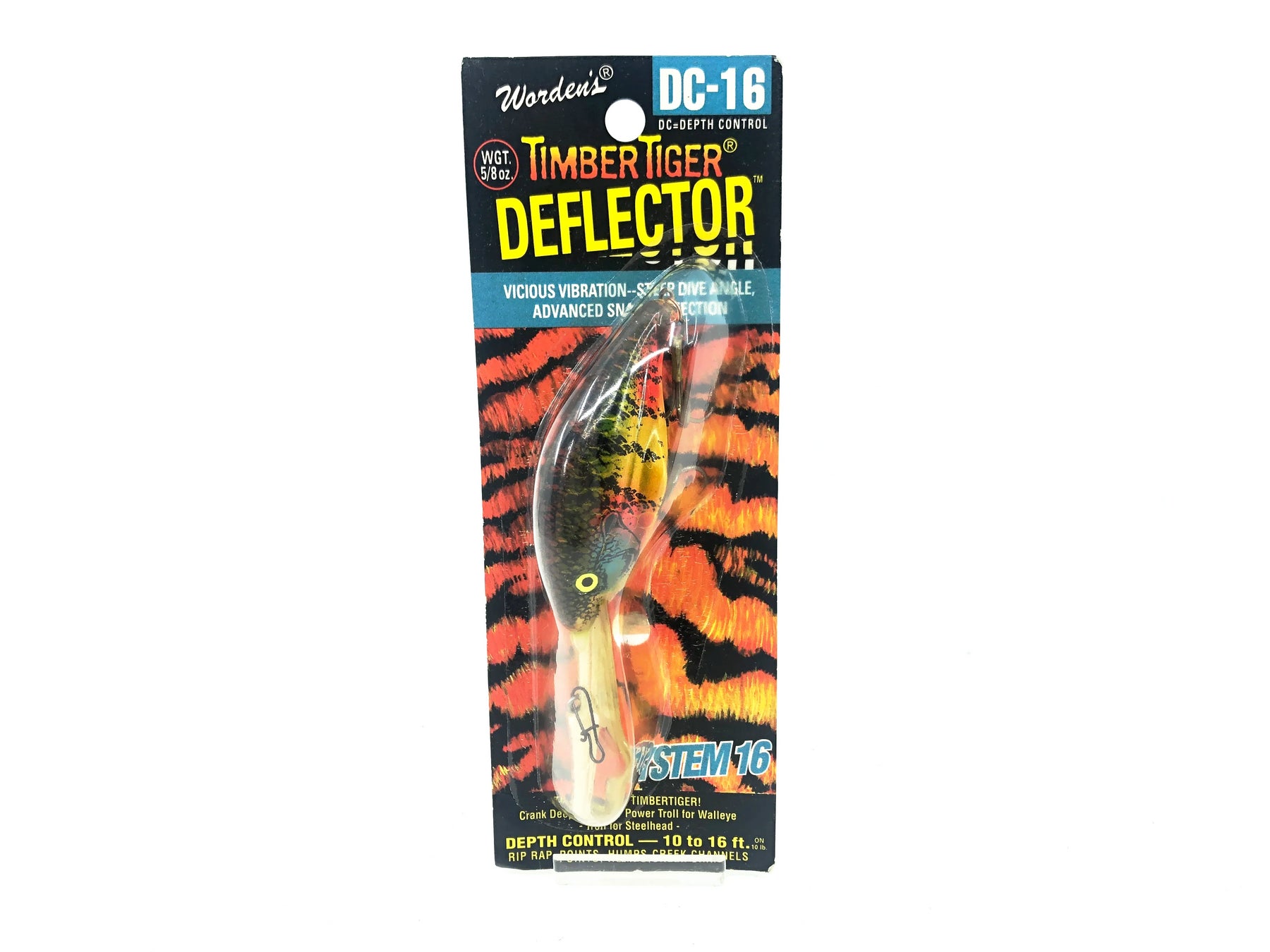 Worden's Timber Tiger Deflector DC-16, #207 Worden's Bluegill/Perch Color on Card. Discontinued old stock here. SKU for this lure is 3016-207. Body is about 3" long. Lure is new on card and the card is in good condition.