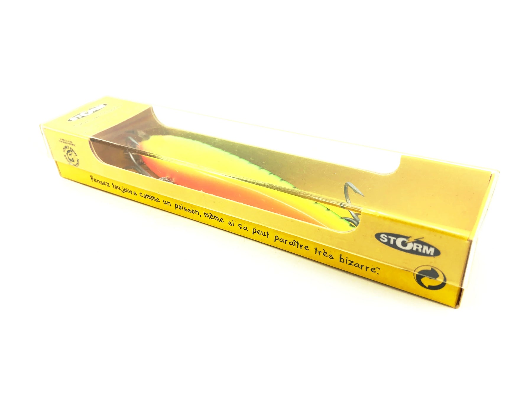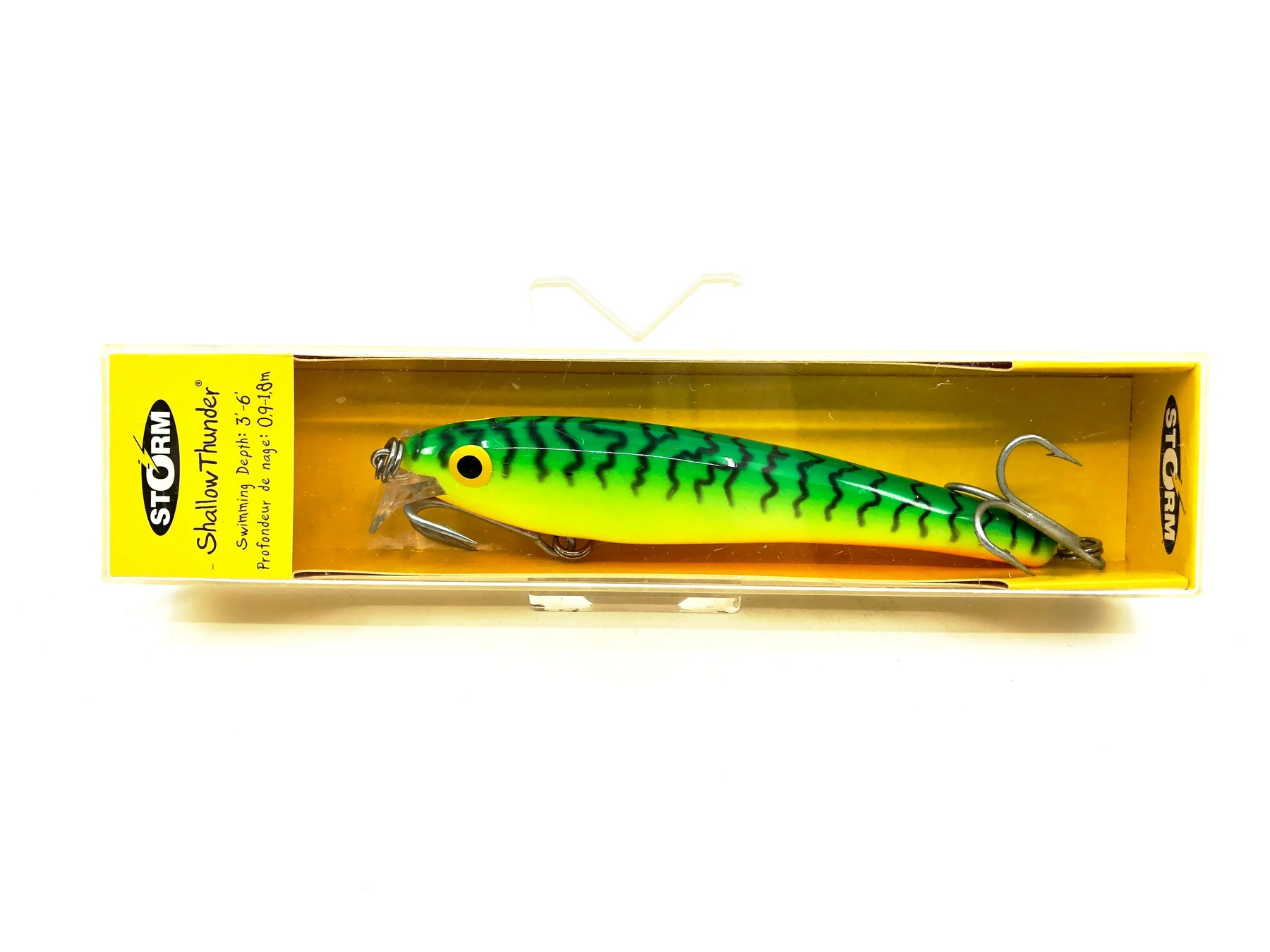Storm Shallow Thunder STH11, #378 Hot Tiger Color with Box. Early 2000s old stock of a discontinued lure. Box has minor wear but overall nice shape, lure is new sealed in box. About 4 5/8" long body. Although this is a post Rapala Storm lure it is in very high demand since it was discontinued. Fish or collect.