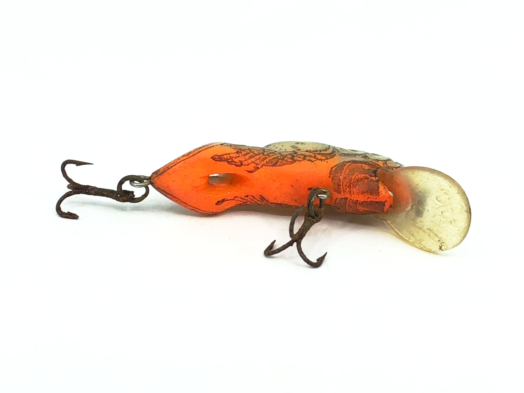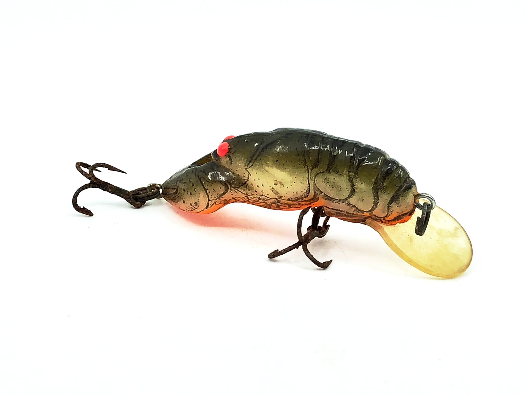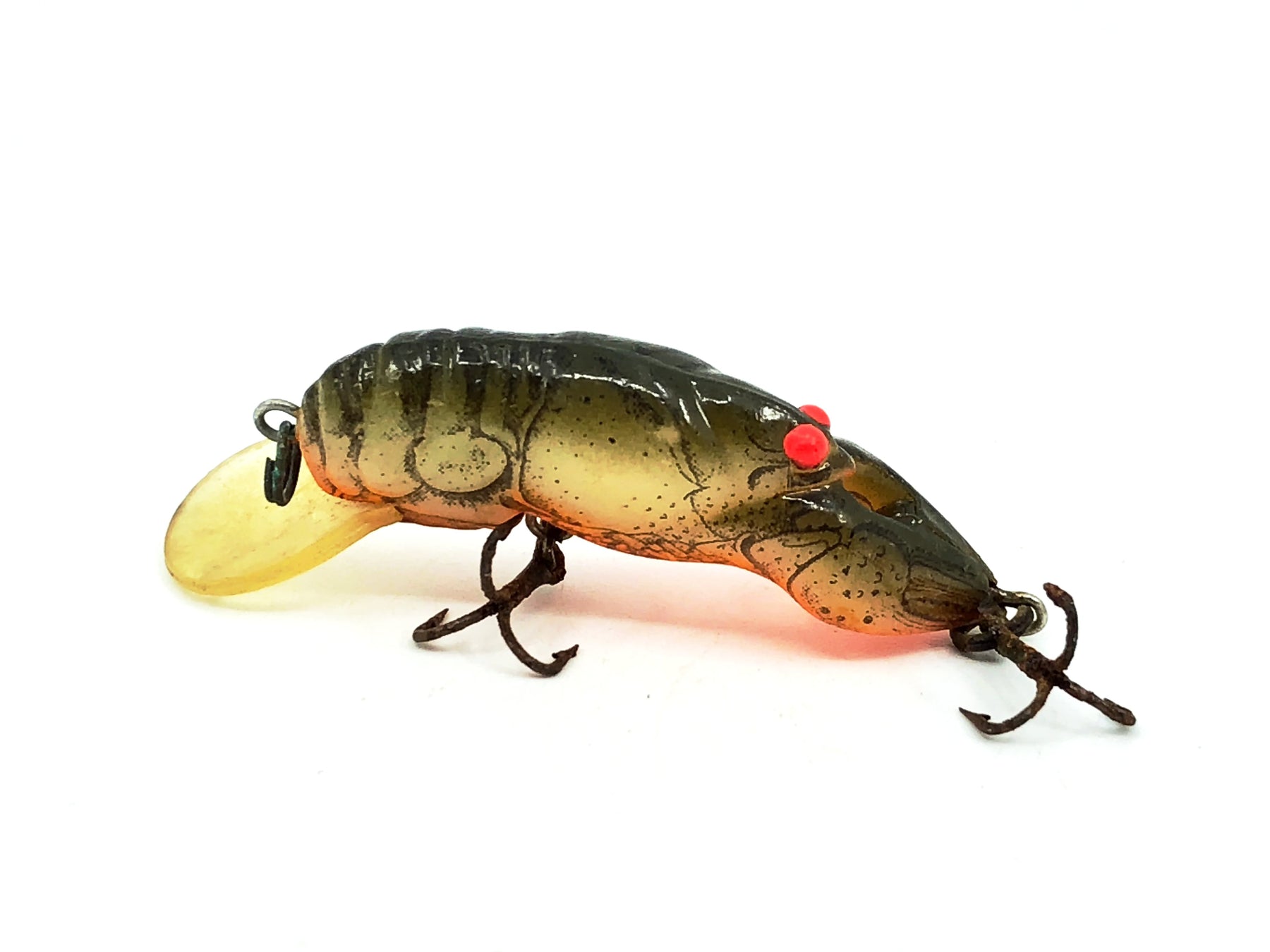 Rebel Teeny Wee-Crawfish, Moss Crawfish Color. About 1 1/2" long excluding the lip. Lure is used with some wear and rust on hooks. Fish or collect, see photos.