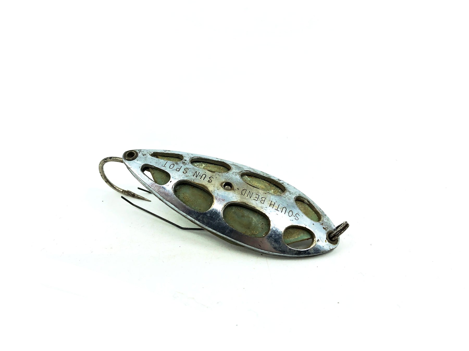 South Bend Sun Spot Lure Green Color. Great vintage lure here, produced between 1941 - 1942.  Lure is used with some wear but still in good condition. About 3 1/4" long. Fish or collect, see photos.