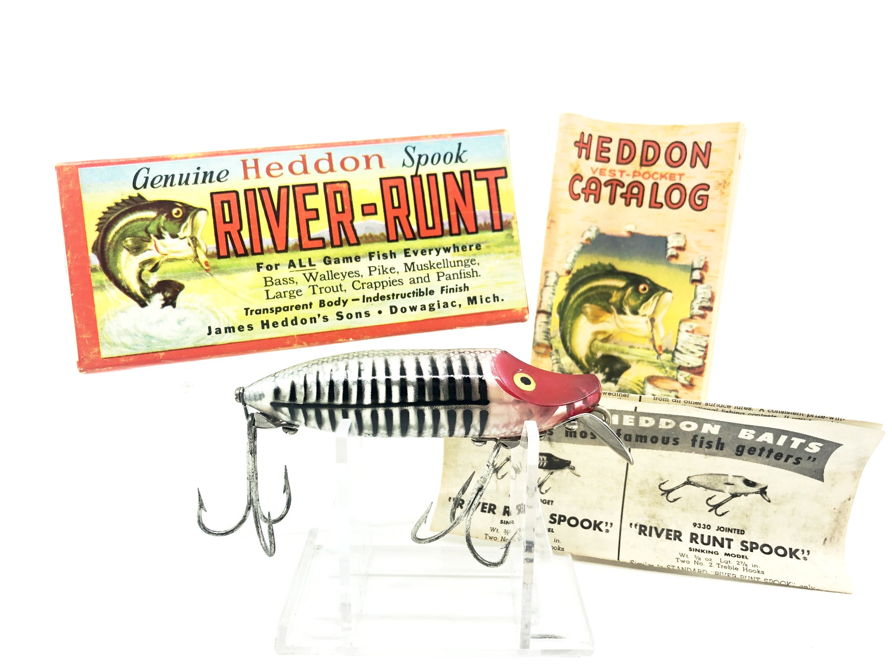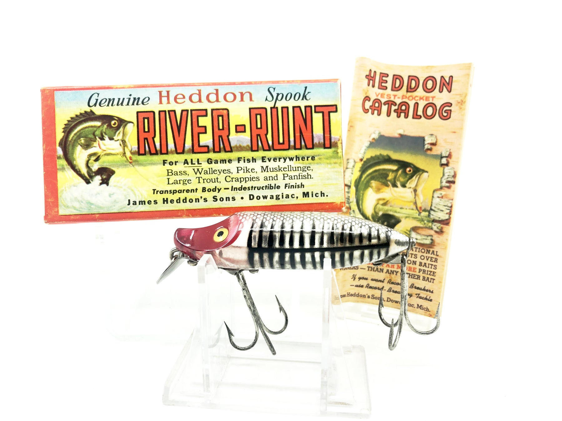 Heddon River Runt Spook Floater 9400-XRS Silver Shore Color with Box. About 3 1/8" long. Used lure in overall in very good condition. Box in nice condition. Box dates from Box dates from 1946-1956. Matches lure. Very nice combo overall. See photos. One of the most iconic fishing lures of all time. Collect or fish you can't go wrong with a Heddon River Runt. Includes box catalog.